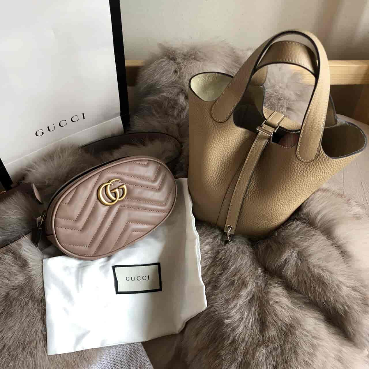 GUCCI首发奶茶色腰包+爱马仕菜篮子风衣灰 最近买的这2个小包包都是从同一个法国DG那里买到的~腰包一开始中意黑色,看了小红书的搭配也都是黑色红色,还没看到奶茶色腰包,没想到有天看到代购发了奶茶色米色,第一眼看就爱上了,马上就定了!可能是今年新出的颜色,因为自己走日系风,觉得跟很多衣服都可以搭配~后来跟北京GUCCI店员聊天,北京都没有上过这个颜色(内心小开心)腰包我买的是85号的,因为也想胸前跨着背,但是系腰上85有点大了,准备去打孔~爱马仕的菜篮子真的穿什么都可以配!跟DG说了,只要白色,浅灰色系的,其他颜色都不要,我的好DG就一直帮我留意,之前也做了很多功课,想着在奶昔白,冰川白里琢磨,没想到竟然给我买到了风衣灰,而且是银扣!(金扣我怕显着老,最爱银色的)风衣灰更像是浅驼色。深色,浅色的衣服都好搭配,冷光灯下发灰色。我162的身高,拿18刚刚好~