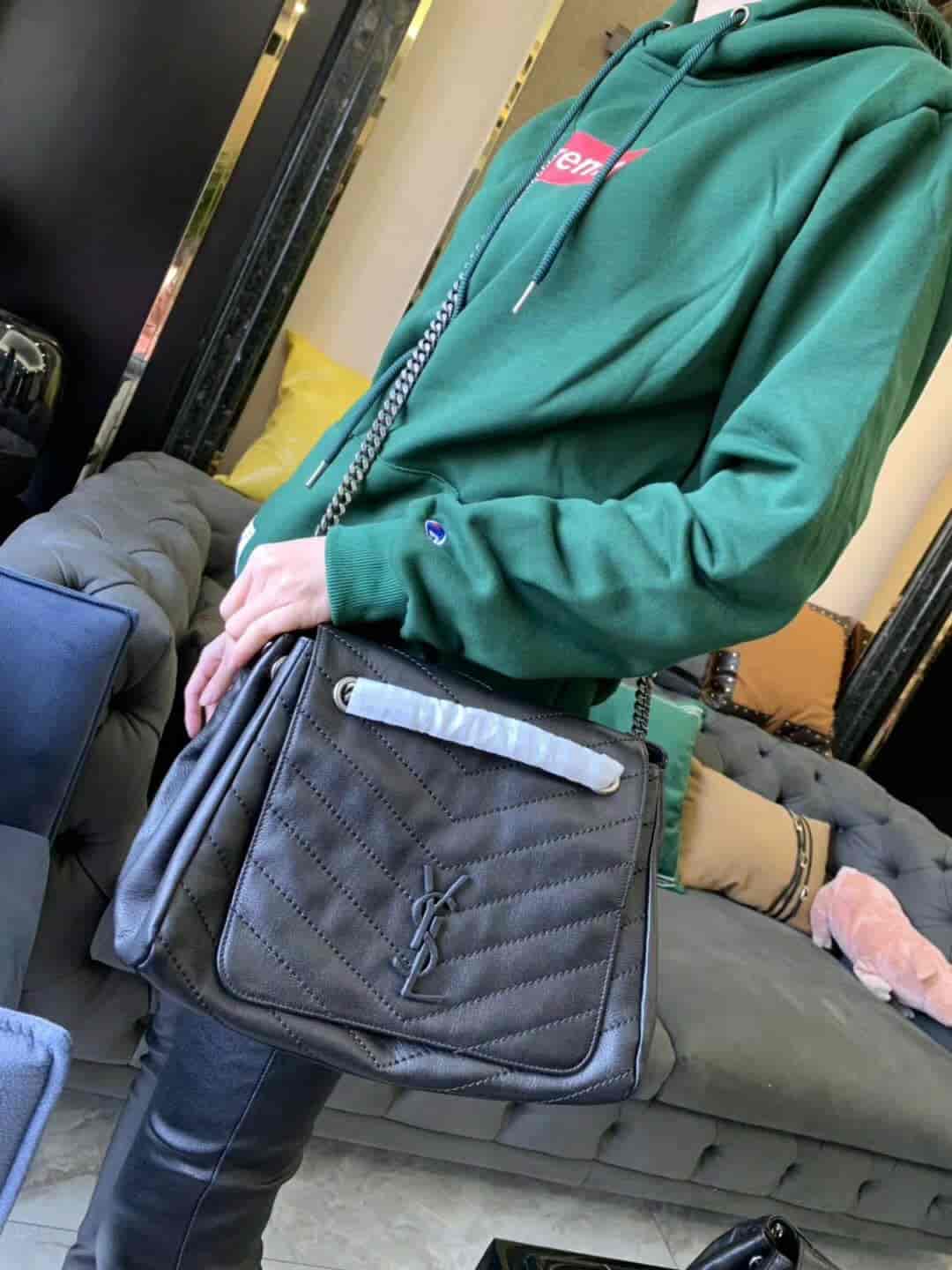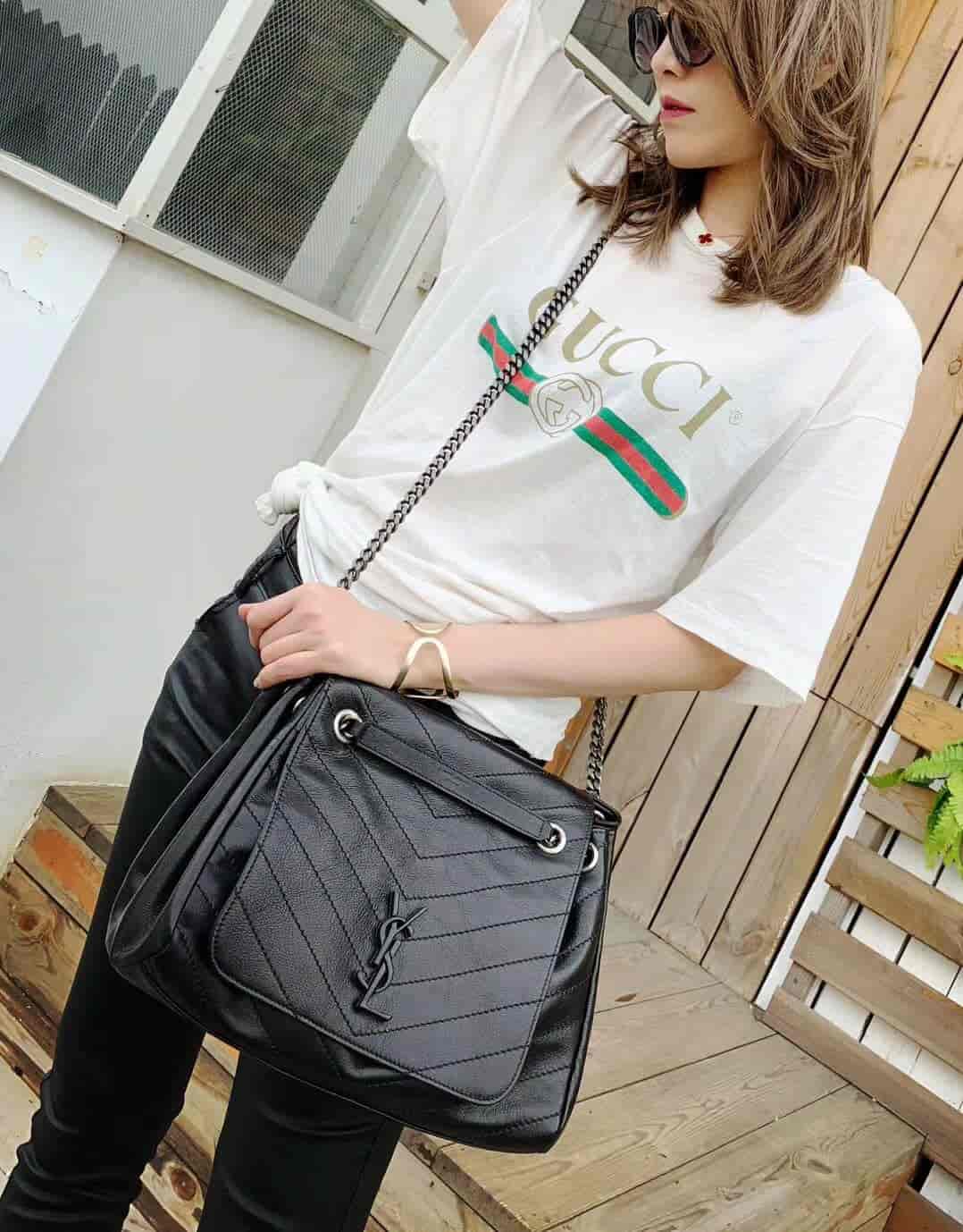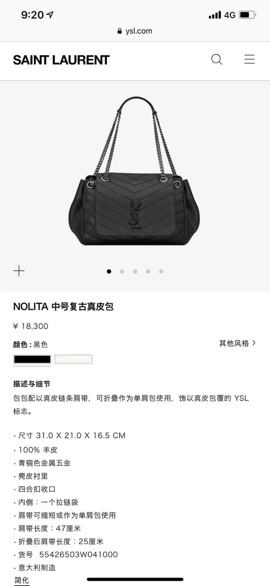 YSL/圣罗兰 NOLITA 中号复古真皮包 554265 2018年12月11日 19:22:56👜奢侈品评论3,154阅读模式 包包配以真皮链条肩带,可折叠作为单肩包使用,饰以真皮包覆的 YSL 标志。 尺寸 31.0 21.0 16.5 CM 100% 羊皮 青铜色金属五金 麂皮衬里 四合扣收口 内侧:一个拉链袋 肩带可缩短或作为单肩包使用 肩带长度:47厘米 折叠后肩带长度:25厘米 意大利制造 货号 55426503W041000 点赞 登录收藏 https://www.paizishop.com/shepin/2018/12/11/13532.html 复制链接 复制链接