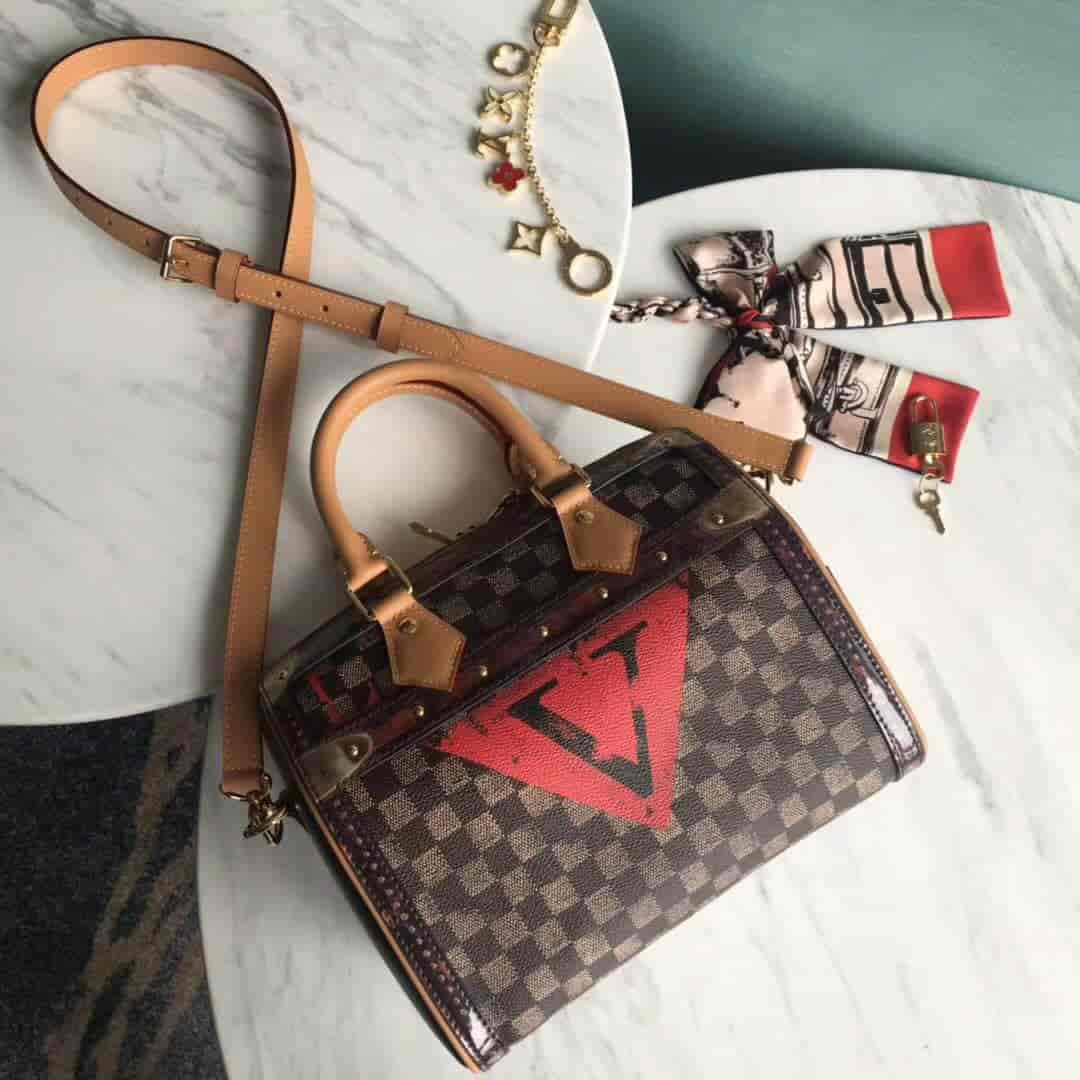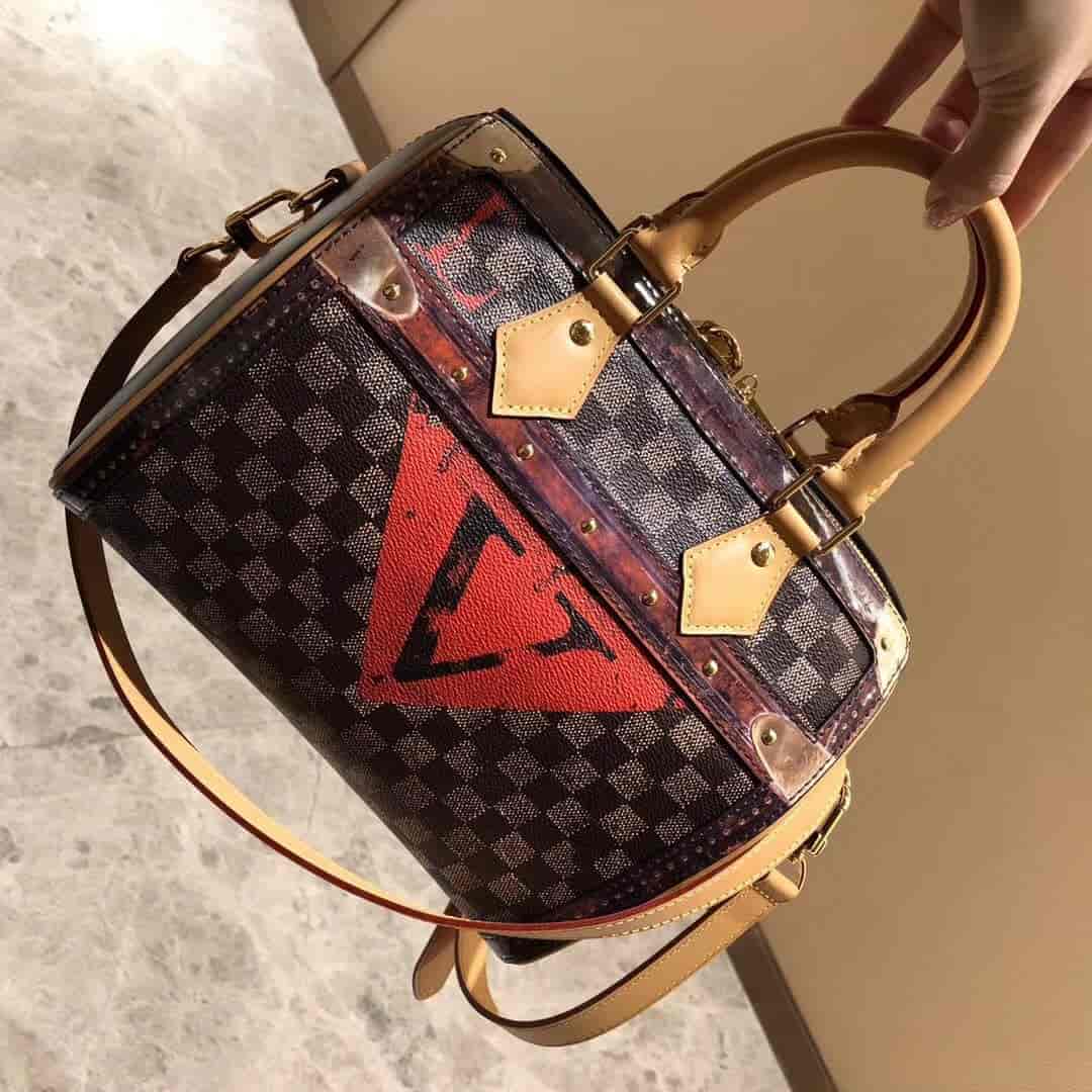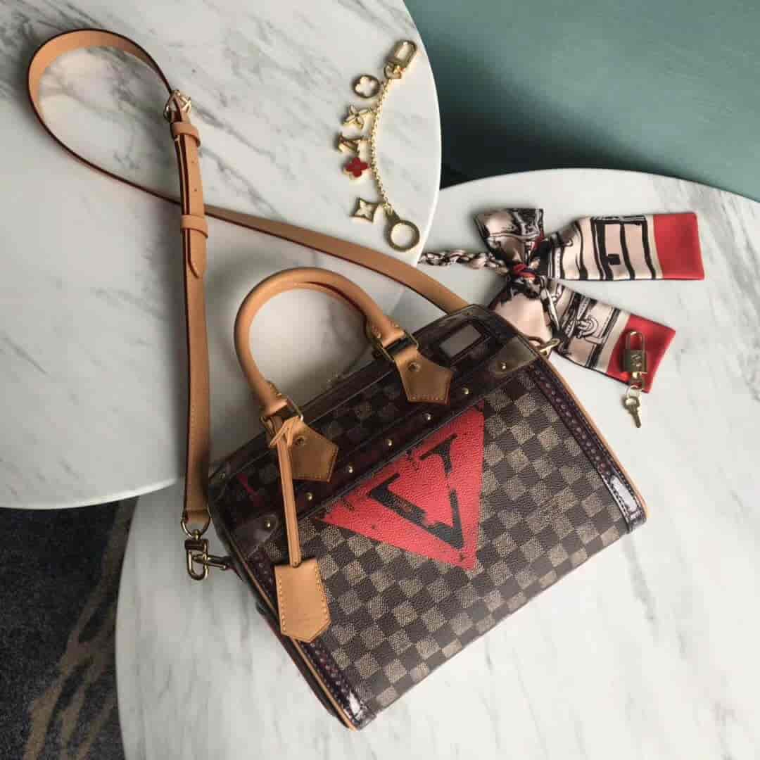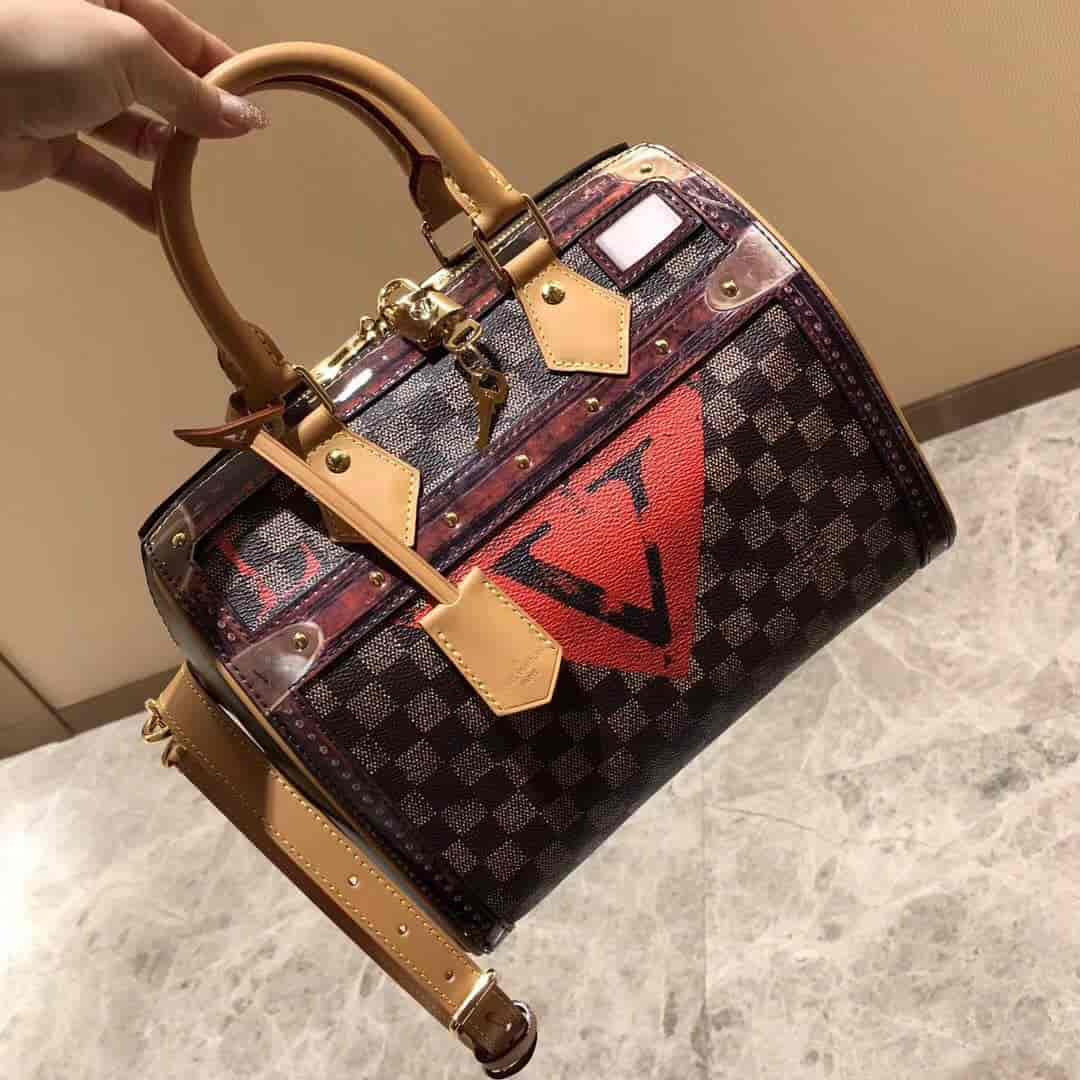 2018秋冬系列设计,独特的Damier格纹帆布使经典Speedy 25手袋焕发全新魅力光彩。视幻风格装饰与漆绘旅行箱“贴纸”图案致敬路易威登制箱传统,充满活力与喜趣。拉丝金色金属饰件泛起微光,双层智能手机袋等元素更具实用性。