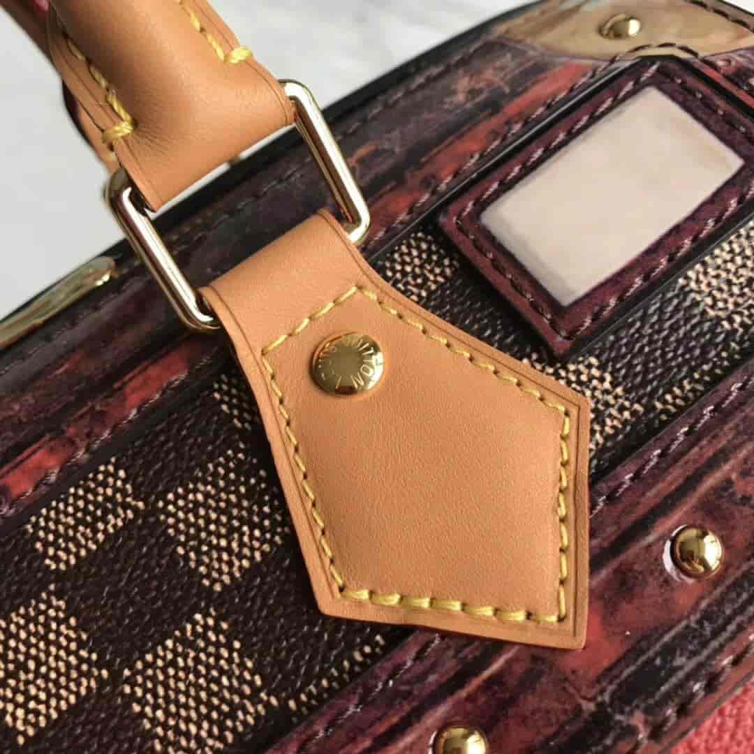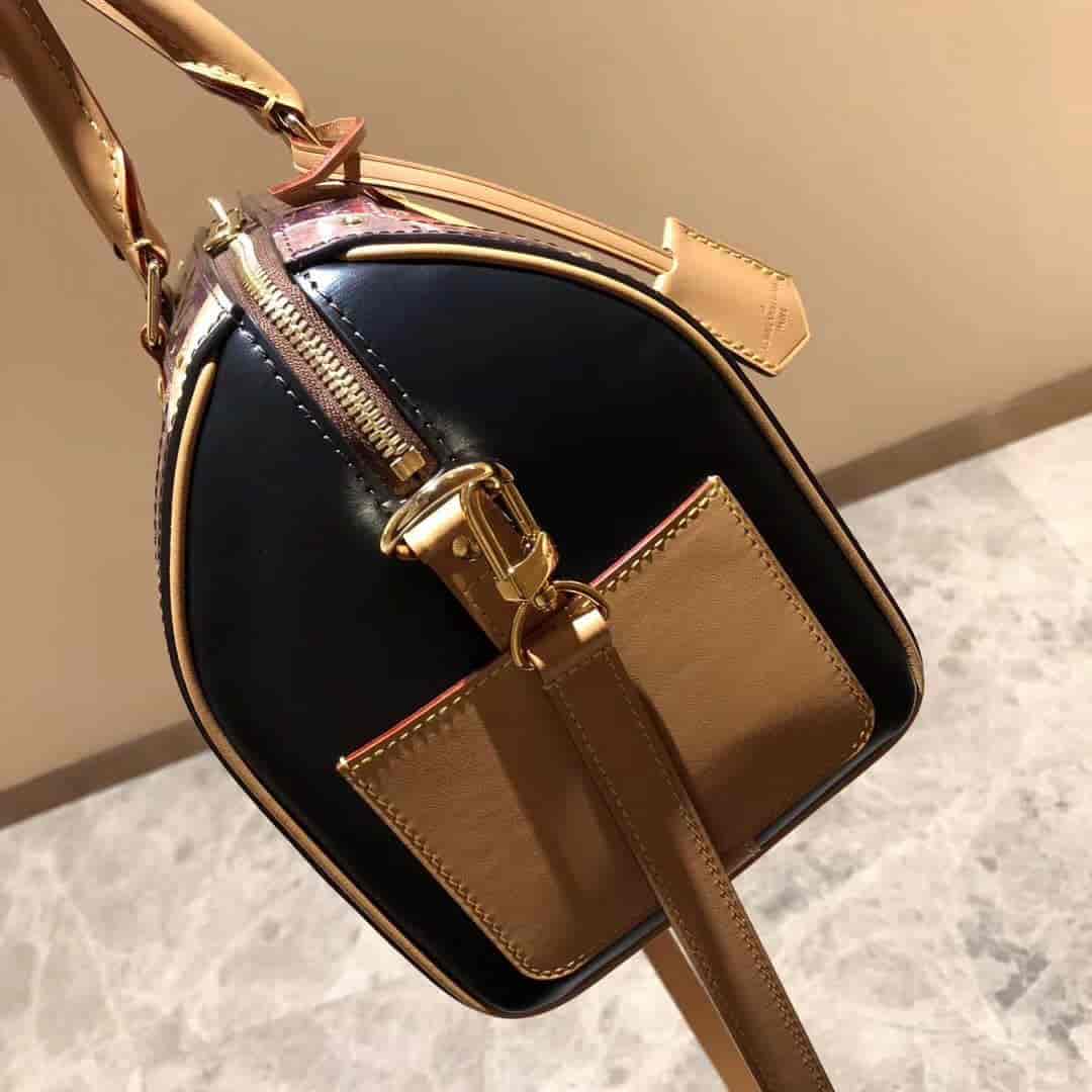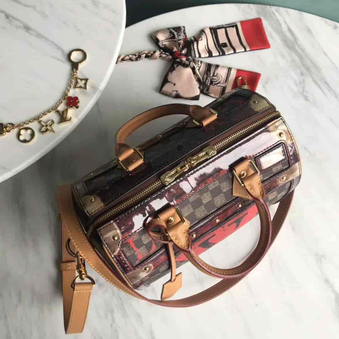2018秋冬系列设计,独特的Damier格纹帆布使经典Speedy 25手袋焕发全新魅力光彩。视幻风格装饰与漆绘旅行箱“贴纸”图案致敬路易威登制箱传统,充满活力与喜趣。拉丝金色金属饰件泛起微光,双层智能手机袋等元素更具实用性。