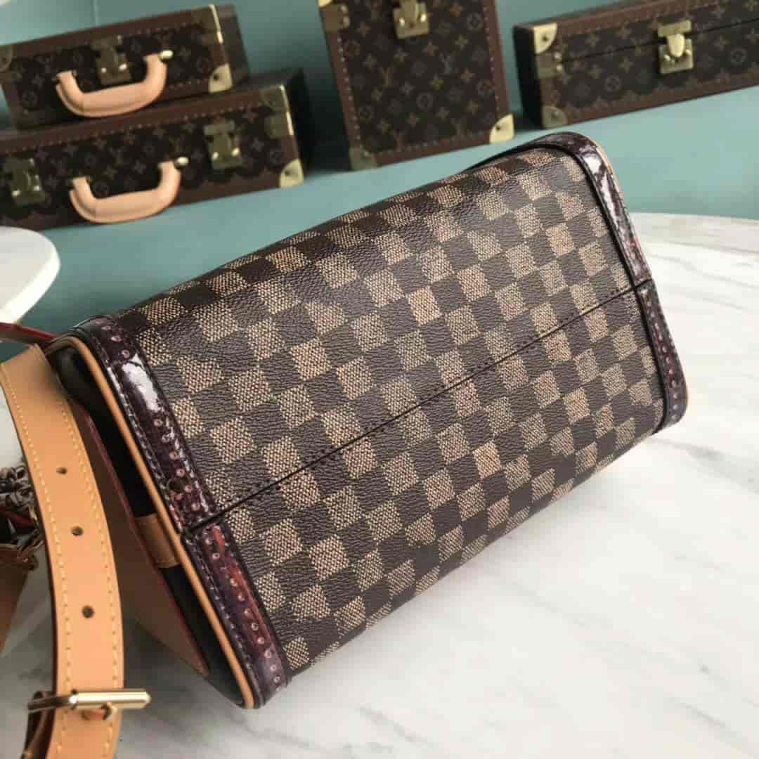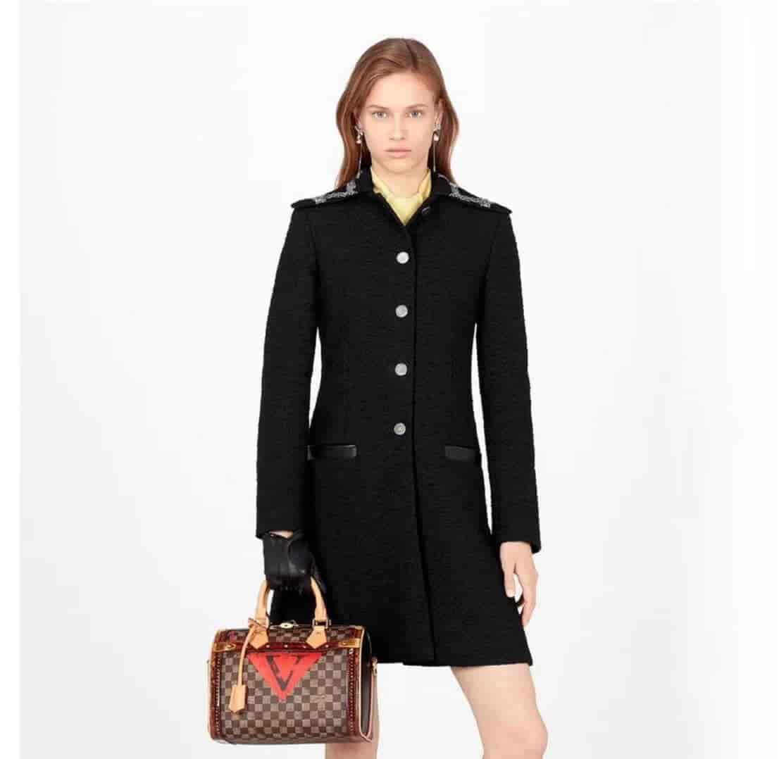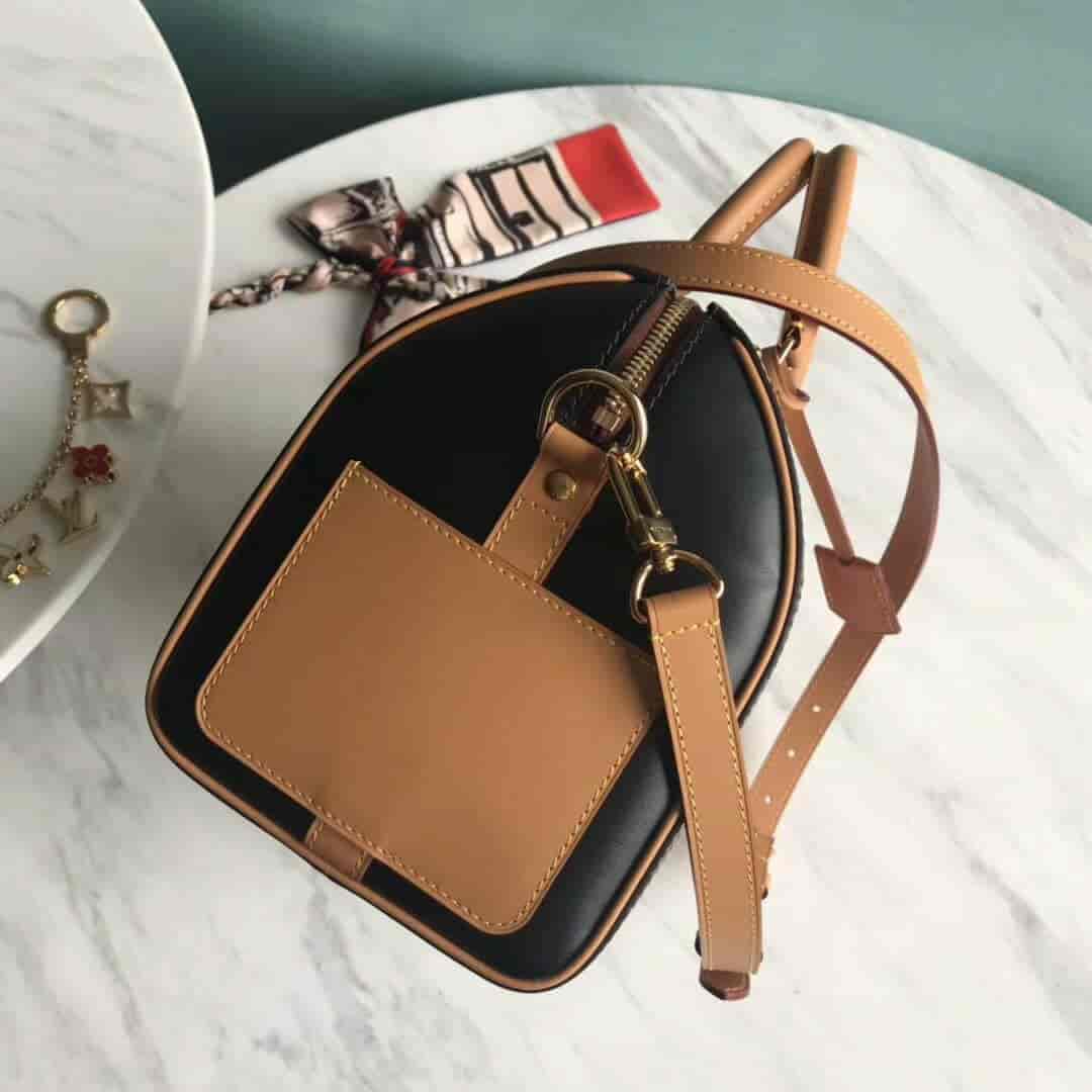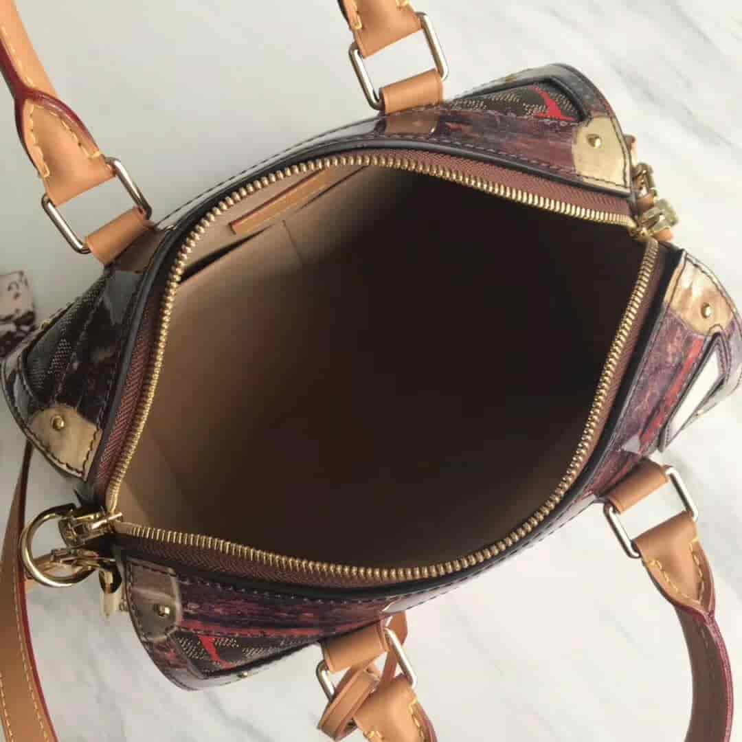 2018秋冬系列设计,独特的Damier格纹帆布使经典Speedy 25手袋焕发全新魅力光彩。视幻风格装饰与漆绘旅行箱“贴纸”图案致敬路易威登制箱传统,充满活力与喜趣。拉丝金色金属饰件泛起微光,双层智能手机袋等元素更具实用性。