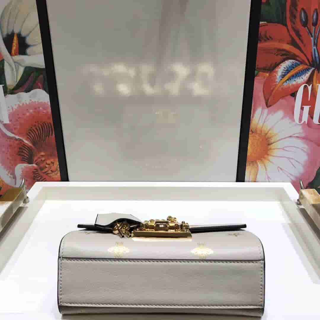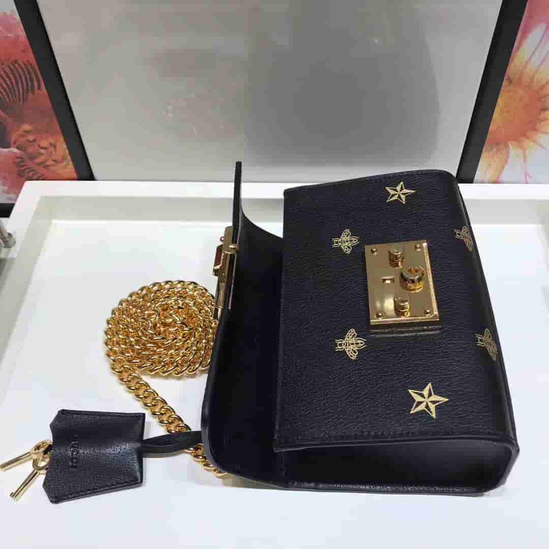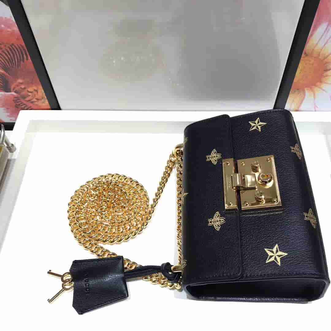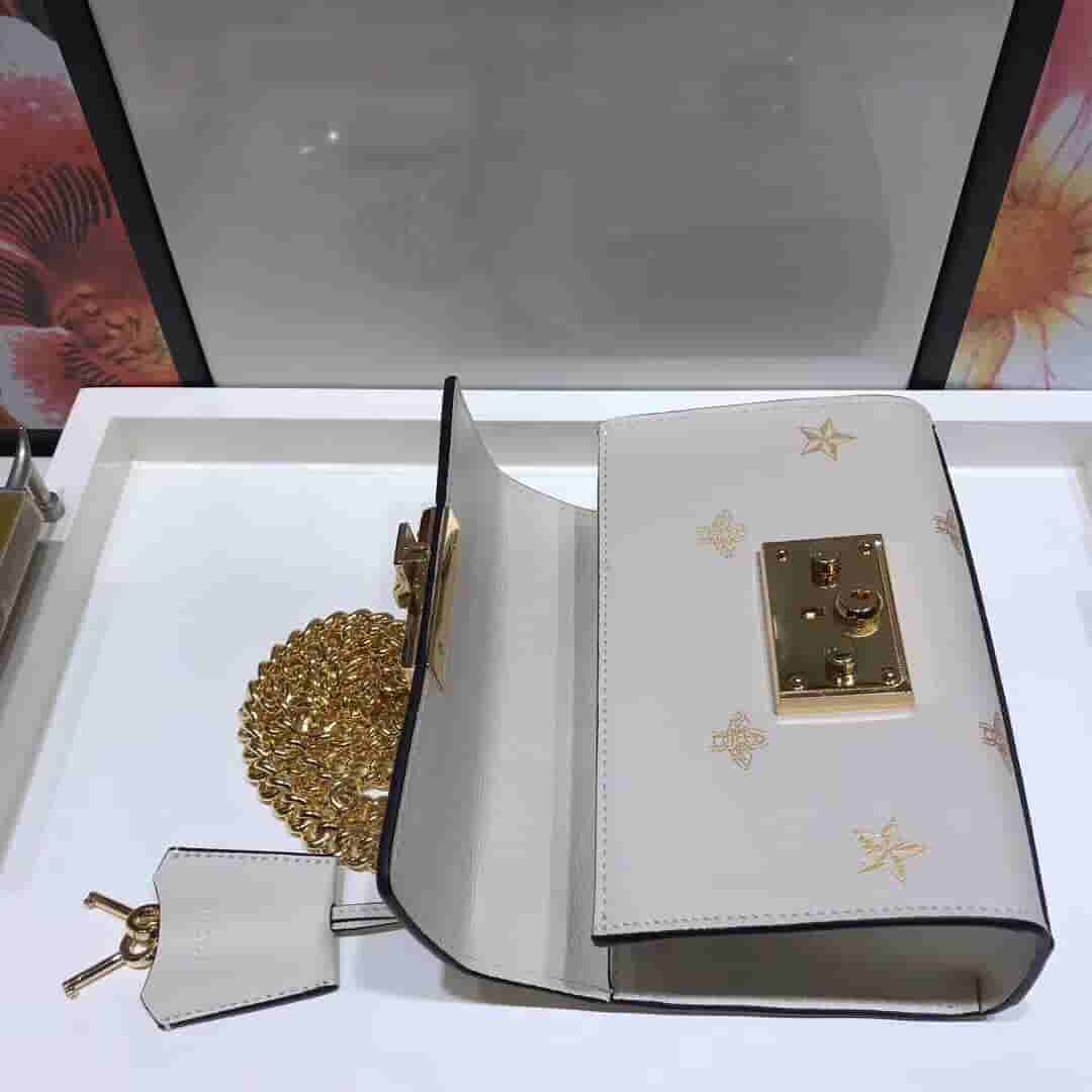 这款别致的Padlock肩背包,造型挺括,在每一季中不断推陈出新,钥匙锁扣设计源自品牌典藏设计。2019早春系列中,这款小号肩背包采用织纹皮革呈现,饰以金属质感金色蜜蜂和星星印花。钥匙放在可拆卸皮革钥匙包内。