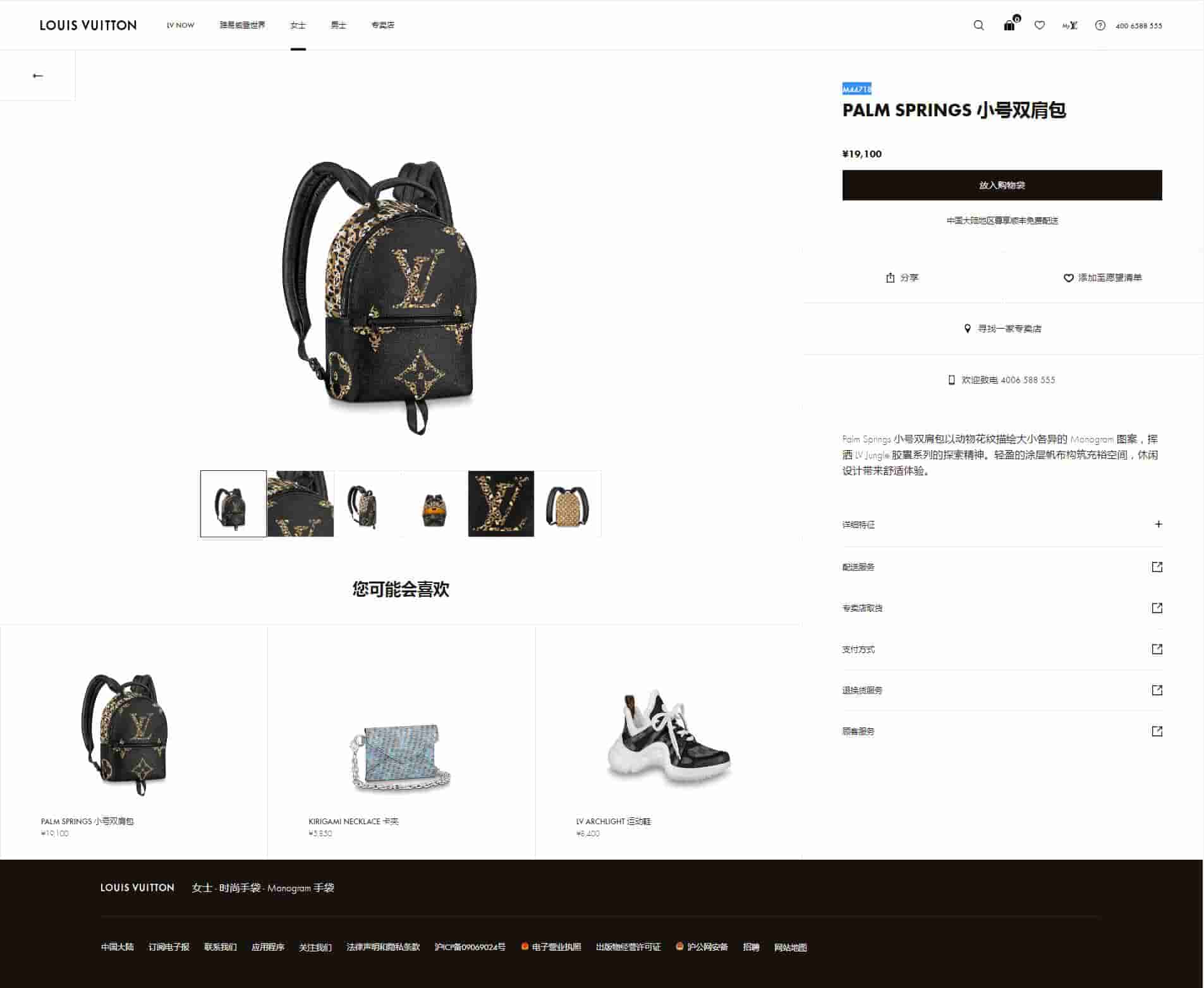 LV M44718 新款非洲丛林豹纹Palm Springs小号双肩包 2019年8月16日 14:53:01👜奢侈品评论1,708阅读模式 Palm Springs 小号双肩包以动物花纹描绘大小各异的 Monogram 图案,挥洒 LV Jungle 胶囊系列的探索精神。轻盈的涂层帆布构筑充裕空间,休闲设计带来舒适体验。 22.0 x 29.0 x 10.0 cm (长 x 高 x 宽) Monogram 涂层帆布 Monogram 涂层帆布饰边 织物内衬 2 条可调节双肩背带 双拉链开合 外侧拉链前袋 内贴袋 本店参考价:1300 点赞 登录收藏 https://www.paizishop.com/shepin/2019/08/16/20259.html 复制链接 复制链接