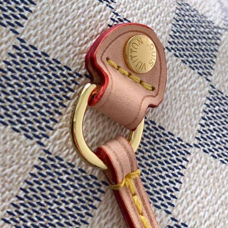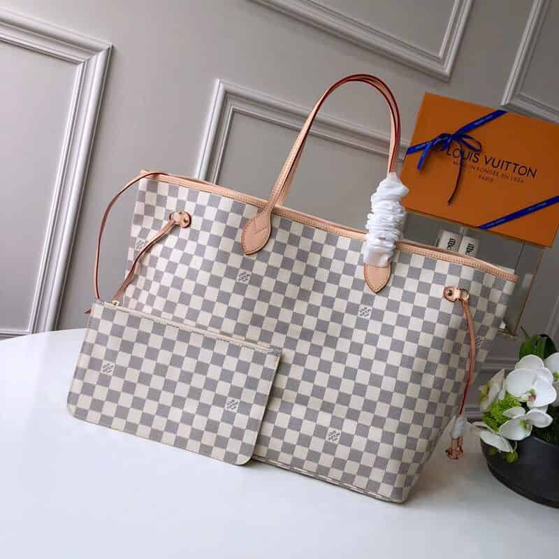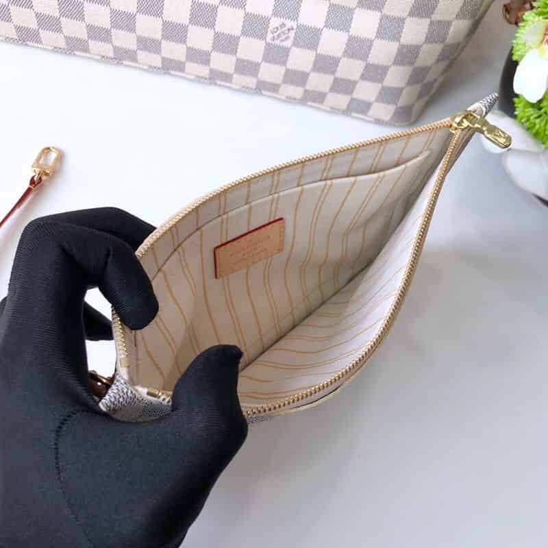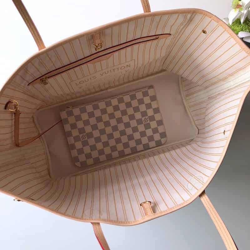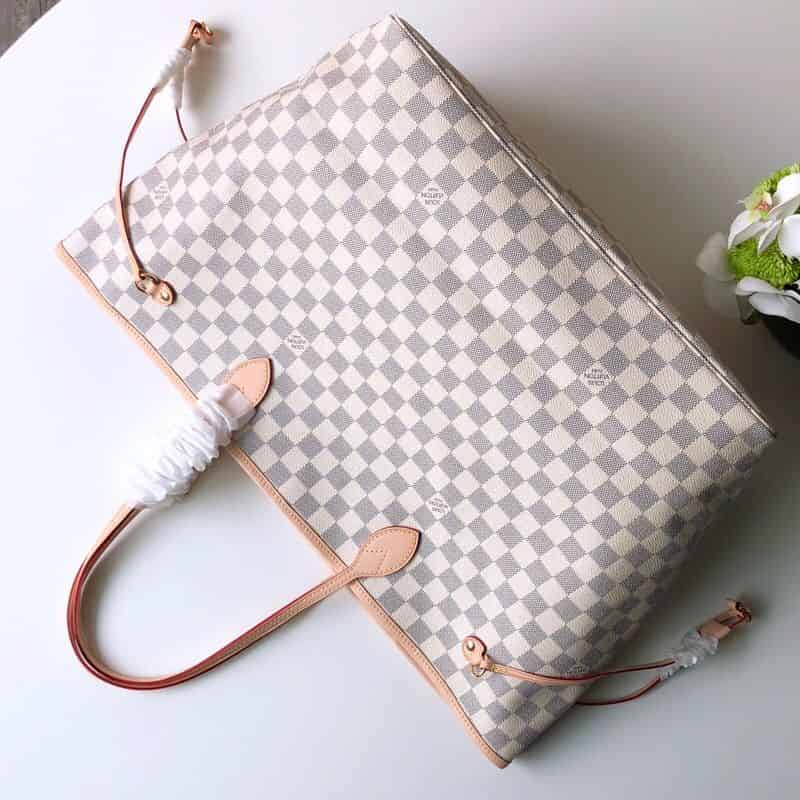 极具传奇色彩的 Neverfull 手袋: 总是能够满足您对手提包的各种需要。 容量大却不显笨重,挺括而手感柔软,居家出行皆宜。 束紧侧边系带,立刻变身为一款时尚的都市手袋。 松开系带,又变成一款别致而实用的手提包。 细长的皮革手柄既宜肩背,亦可挽拎于臂间。 此处显示的此款以 Damier Azur 帆布制成。