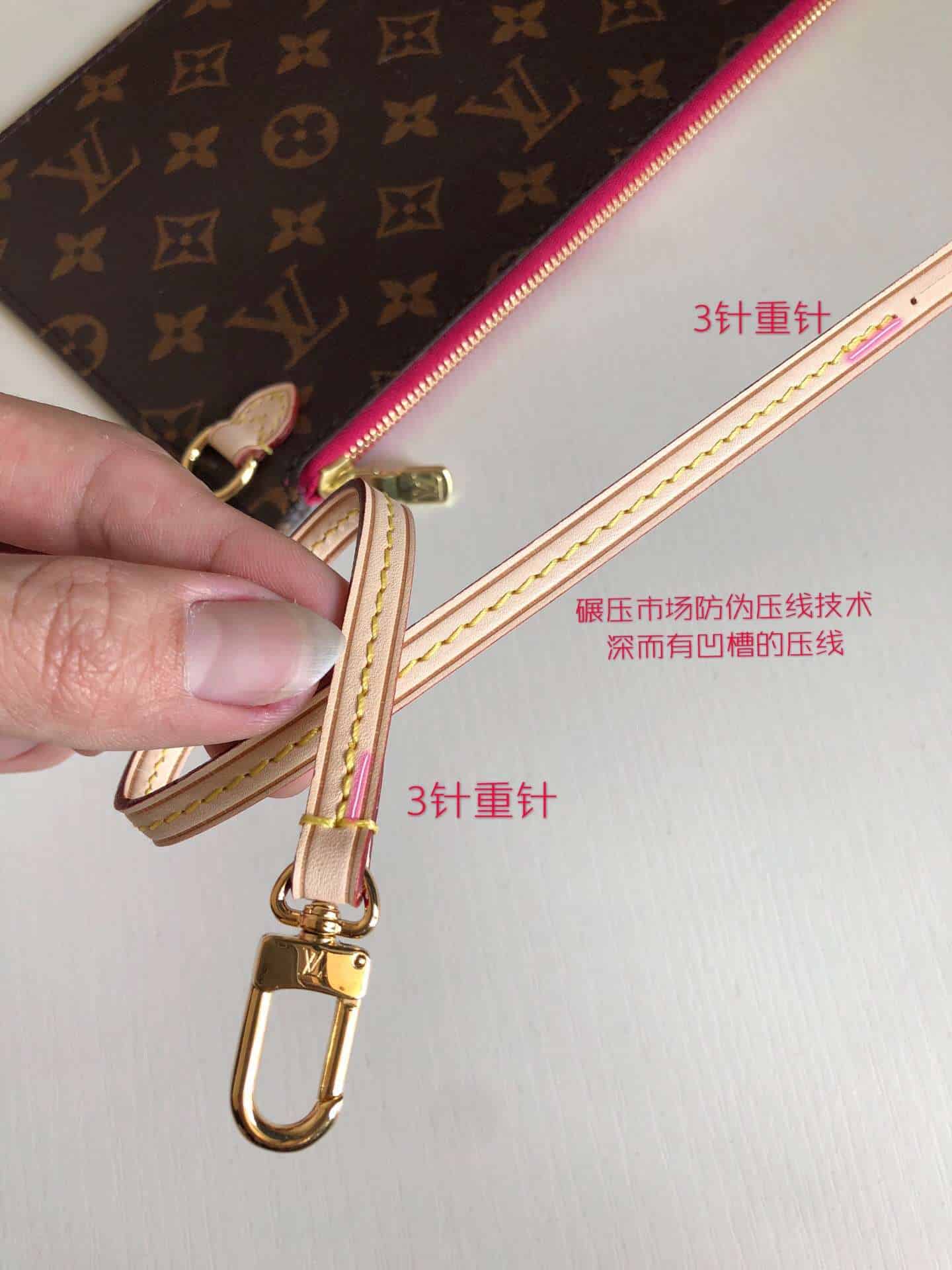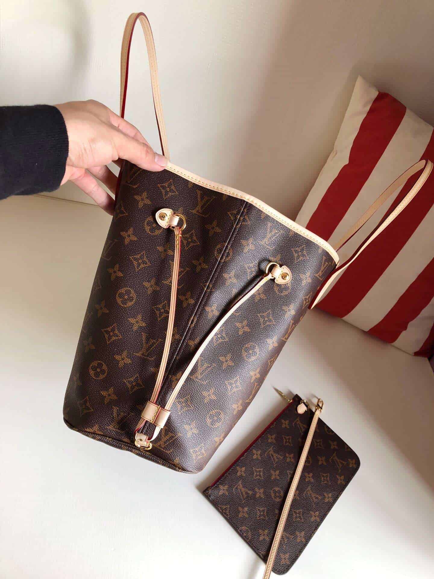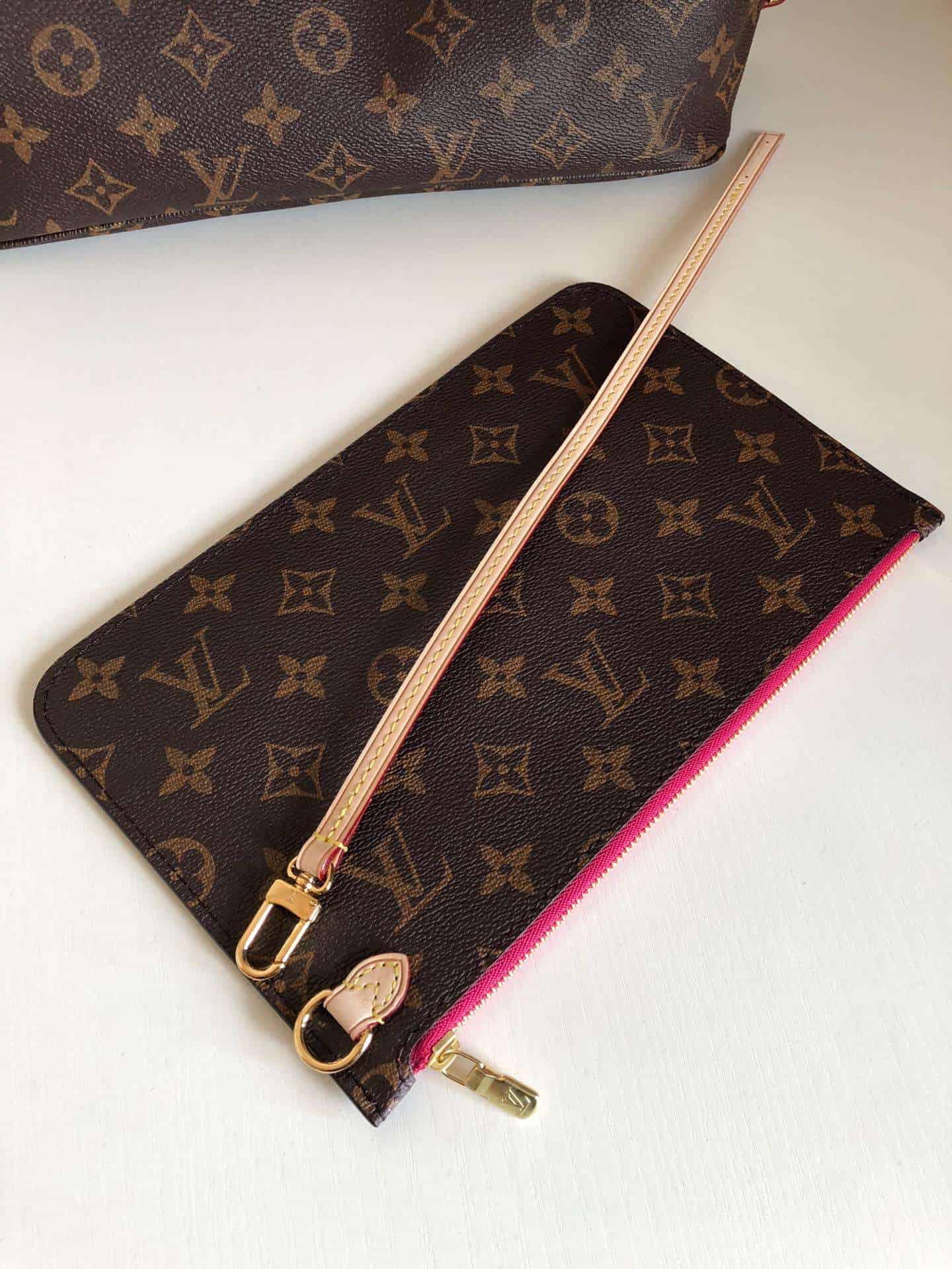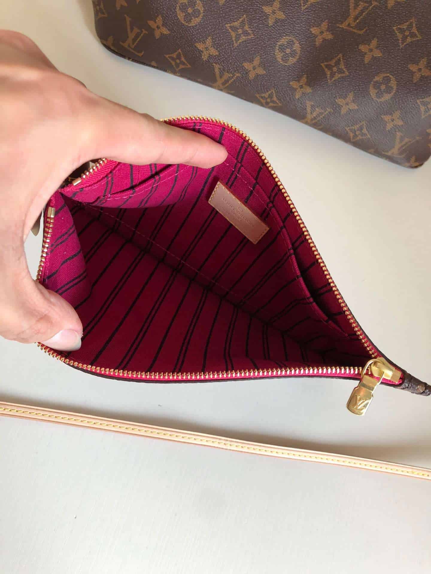 路易威登全新演绎 Neverfull 经典手袋,探索袋内精致细节。重新设计的内袋采用了清新的织物内衬和灵感源自路易威登档案馆的复古细节,尤其值得称道的莫过于可脱卸式拉链手包,它既可单独作为一只精致手拿包使用,亦可作为额外的口袋。 明快的内衬色调为 Monogram 经典帆布增加了更多活泼生动之感。