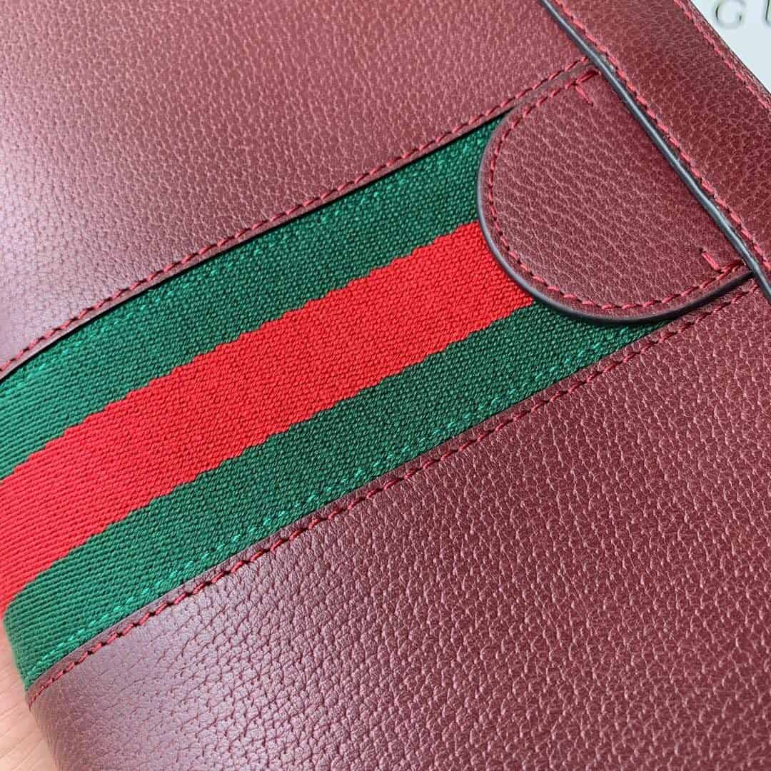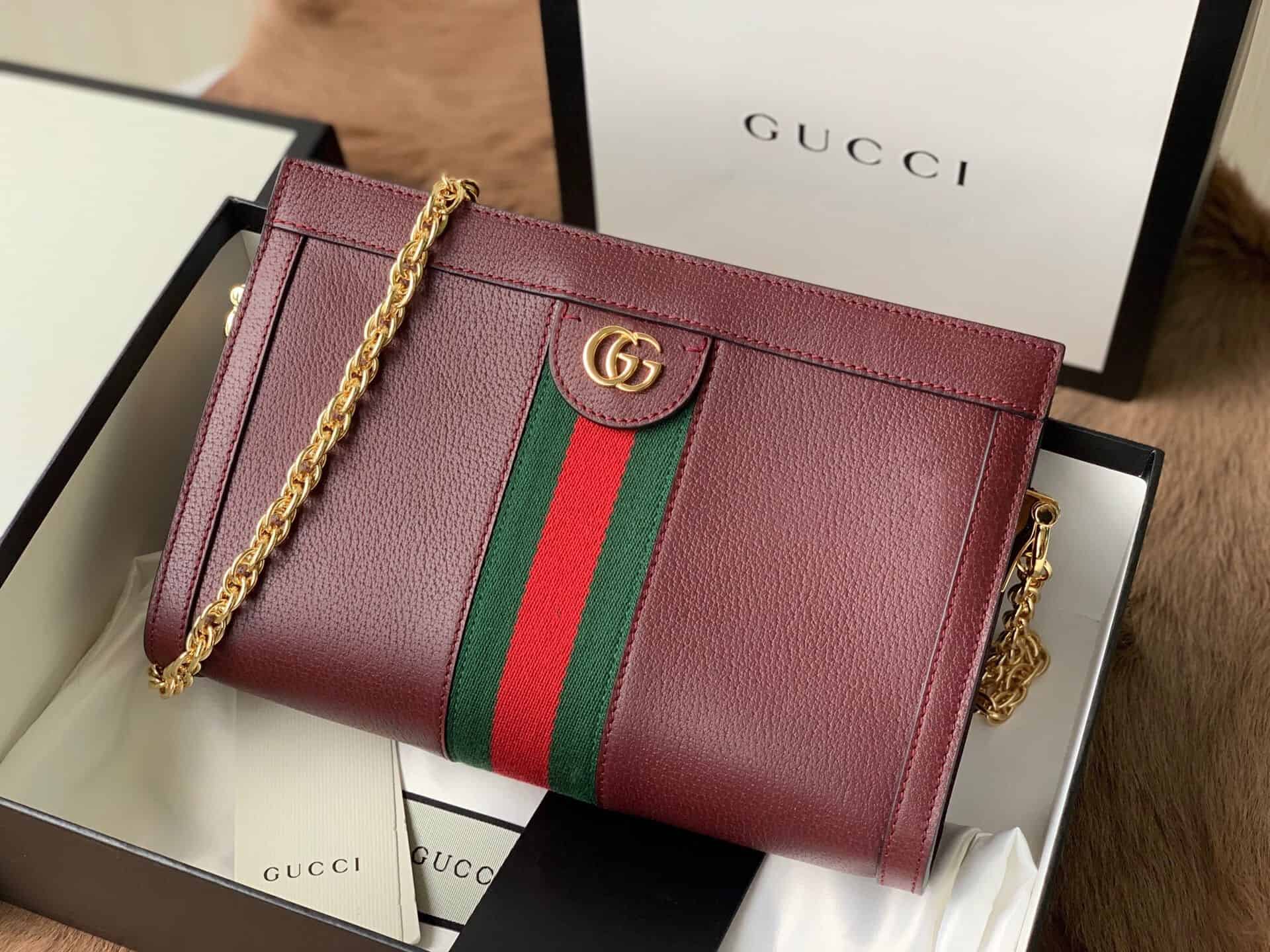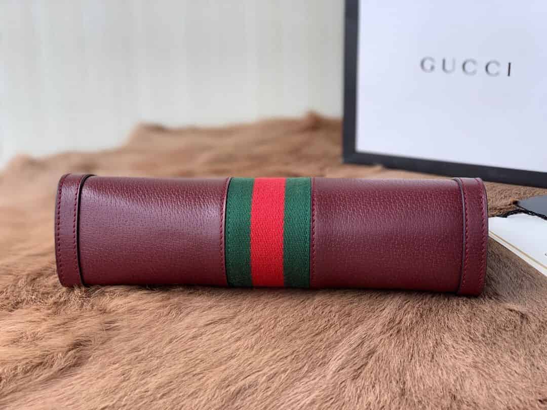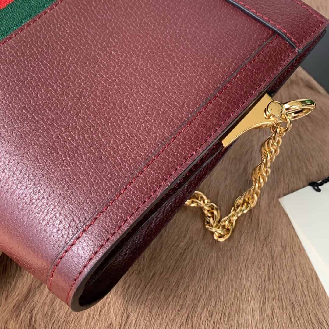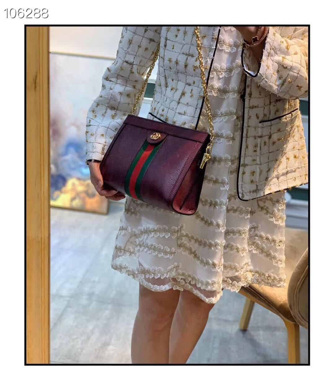 Ophidia 系列链条肩背包在 2019 早秋系列中推出全新色彩选择,以织纹酒红色皮革材质,搭配镶嵌的红绿条纹织带。挺括造型搭配磁扣设计,典藏双 G 造型配件细节令整款造型更添魅力。