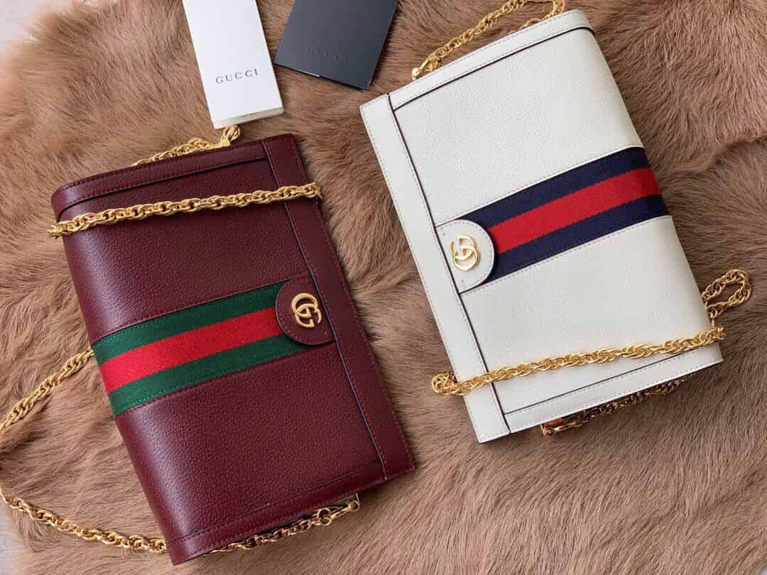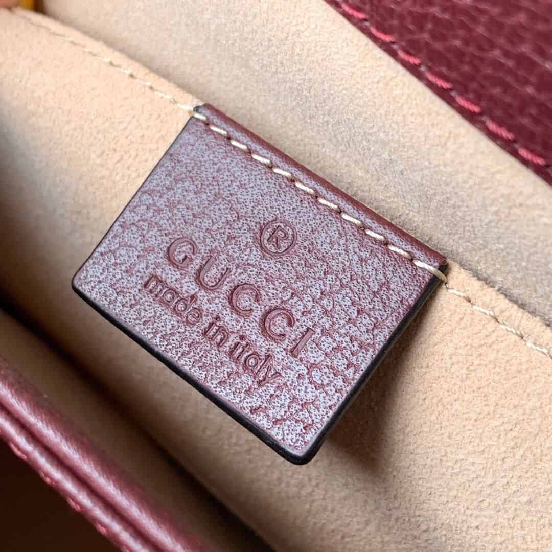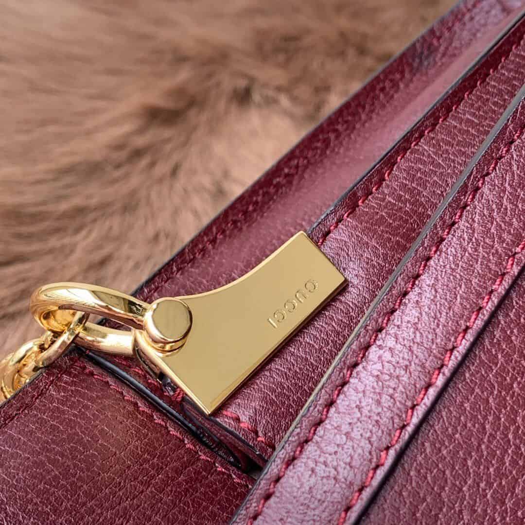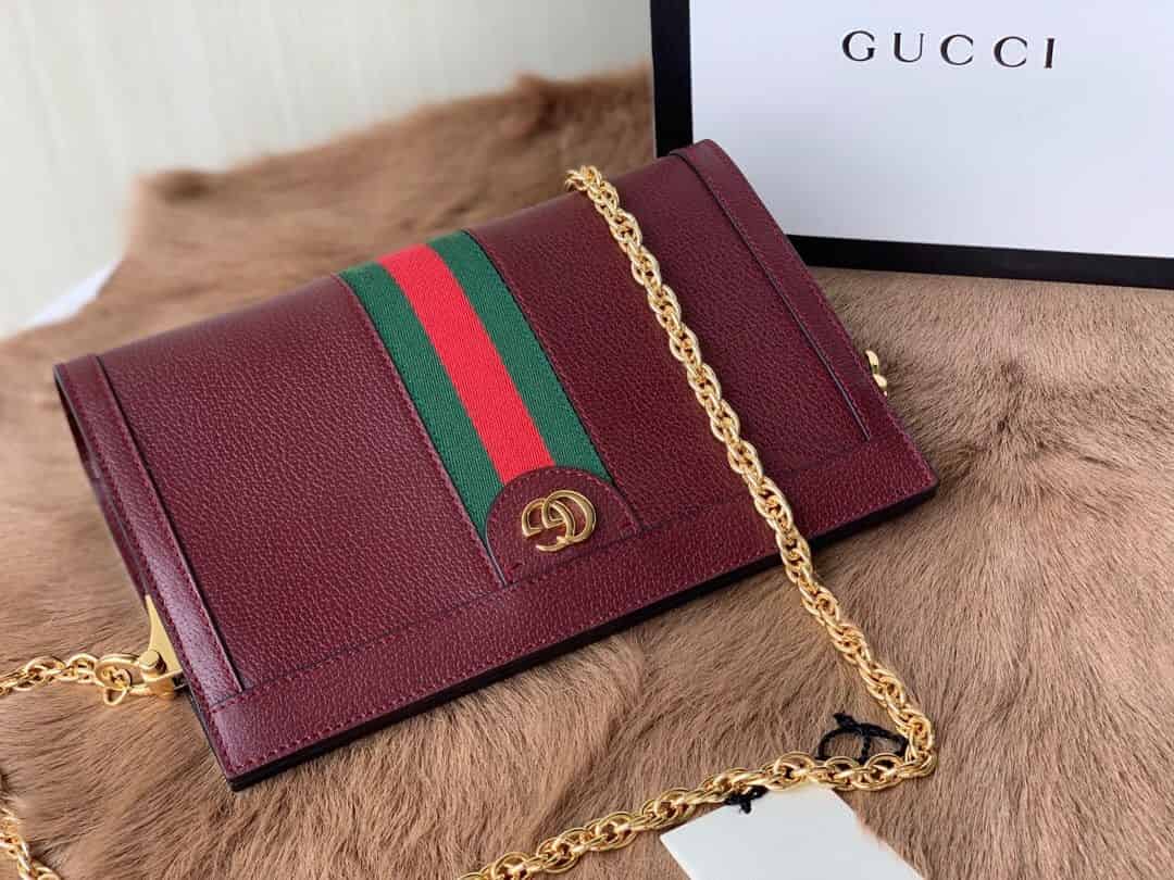 Ophidia 系列链条肩背包在 2019 早秋系列中推出全新色彩选择,以织纹酒红色皮革材质,搭配镶嵌的红绿条纹织带。挺括造型搭配磁扣设计,典藏双 G 造型配件细节令整款造型更添魅力。