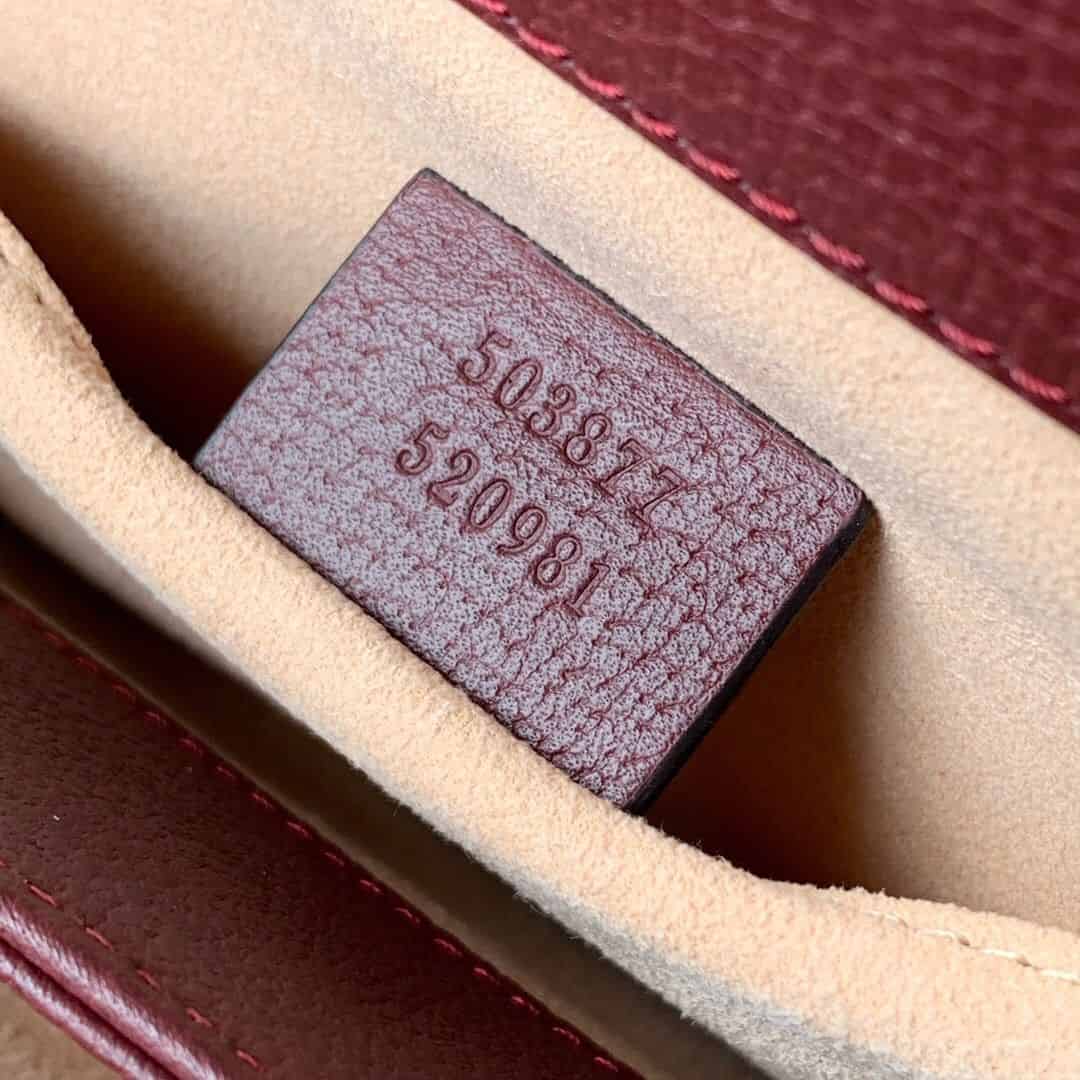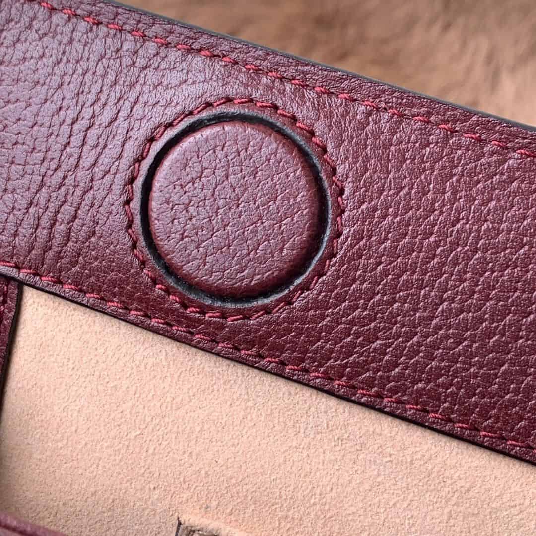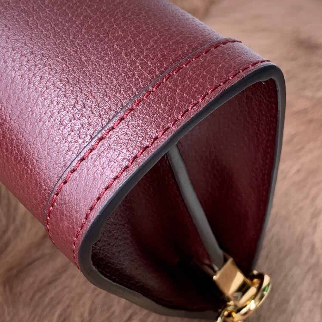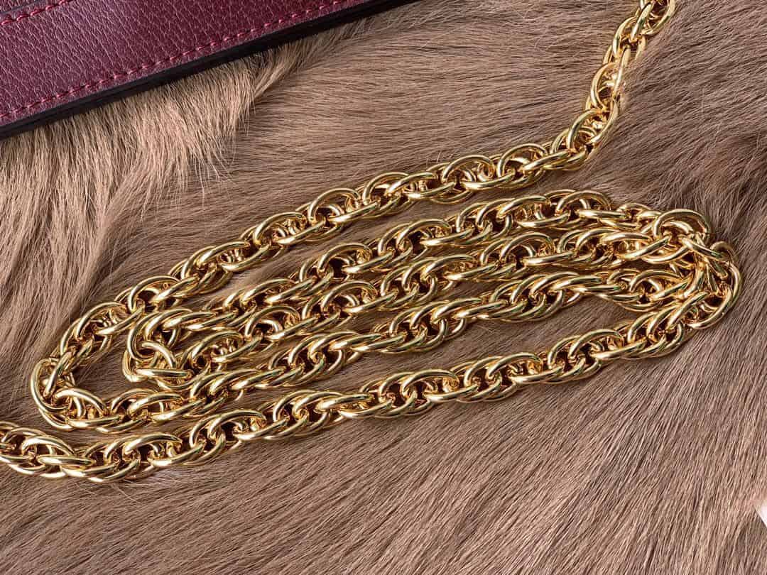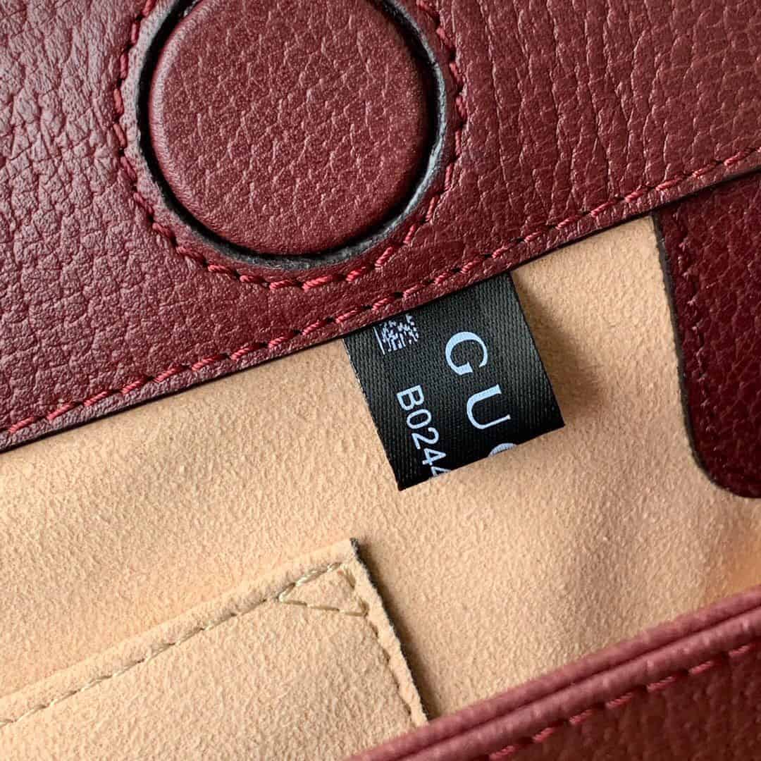 Ophidia 系列链条肩背包在 2019 早秋系列中推出全新色彩选择,以织纹酒红色皮革材质,搭配镶嵌的红绿条纹织带。挺括造型搭配磁扣设计,典藏双 G 造型配件细节令整款造型更添魅力。