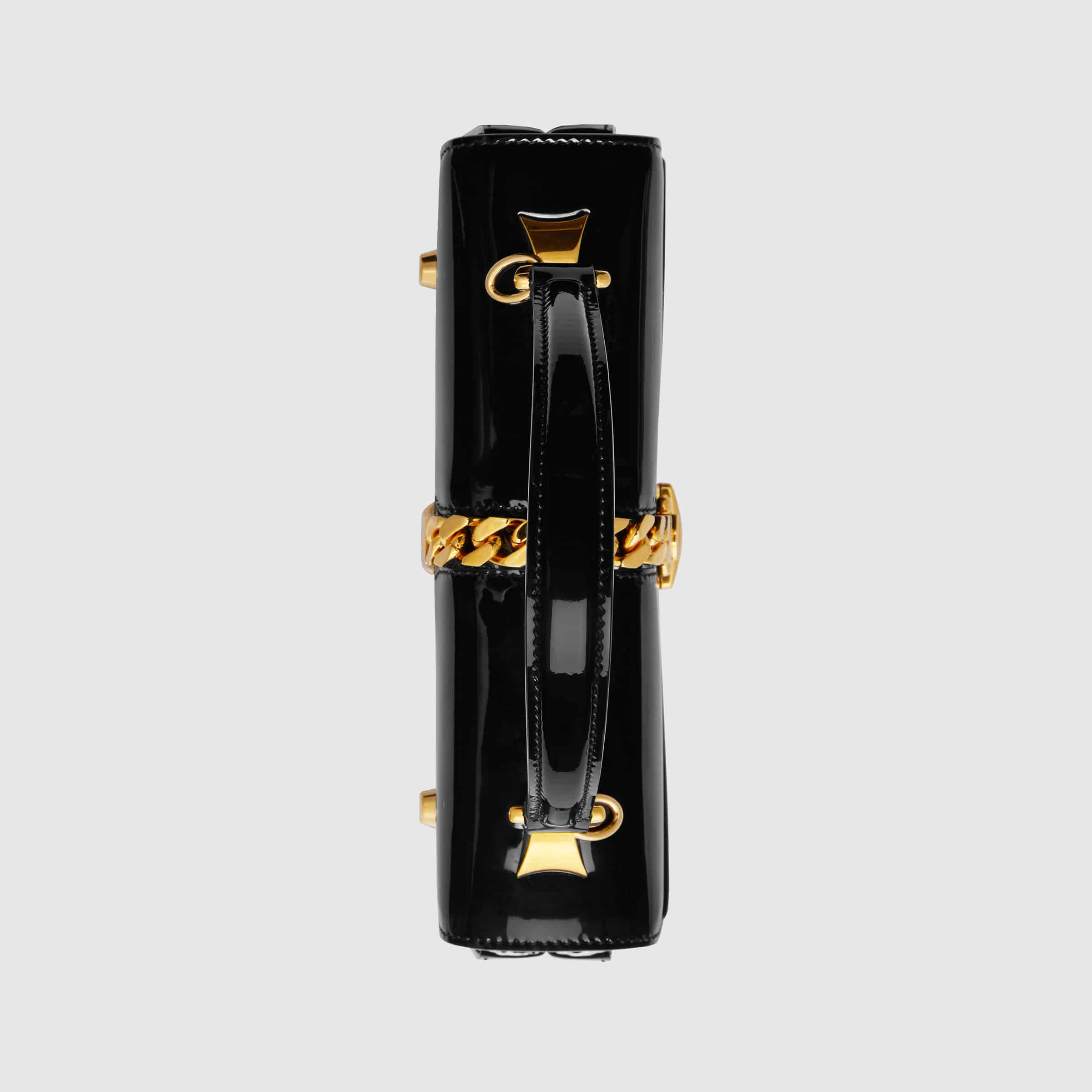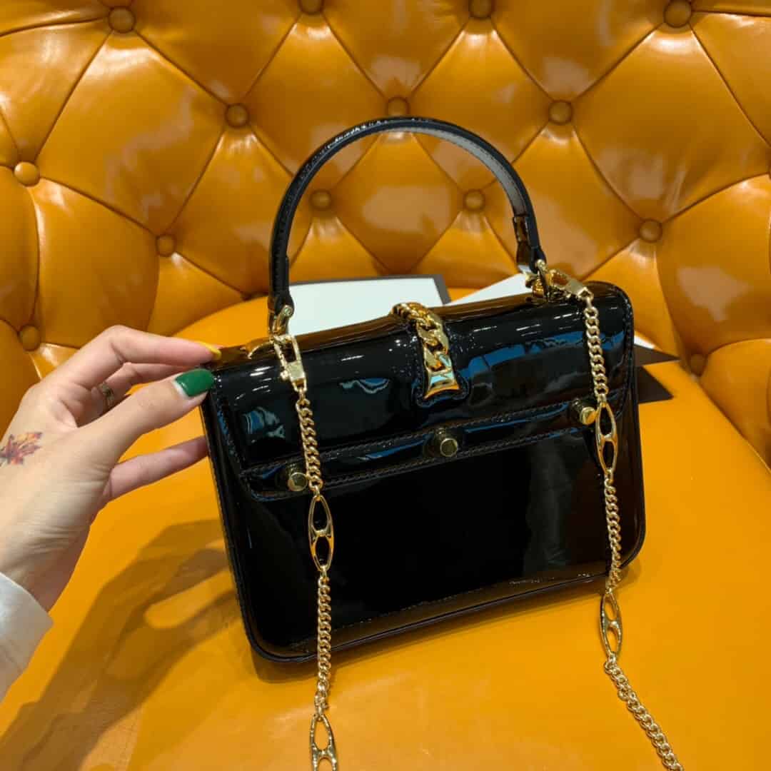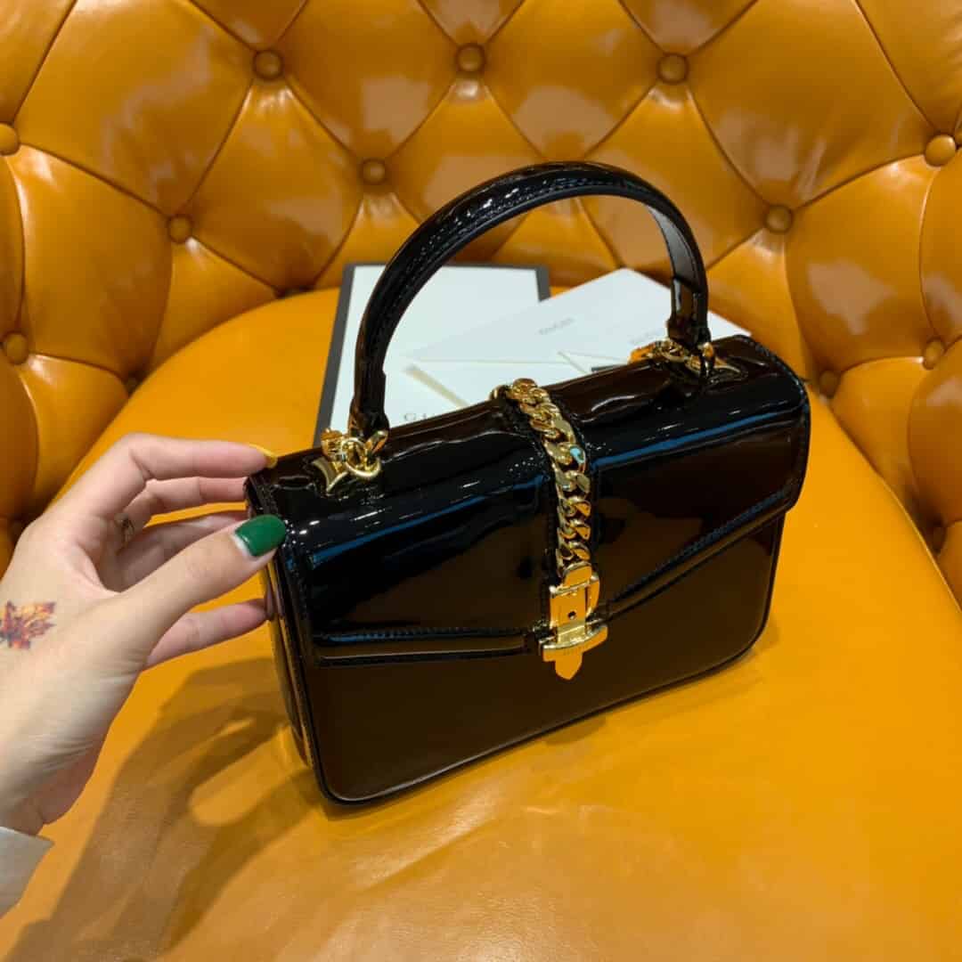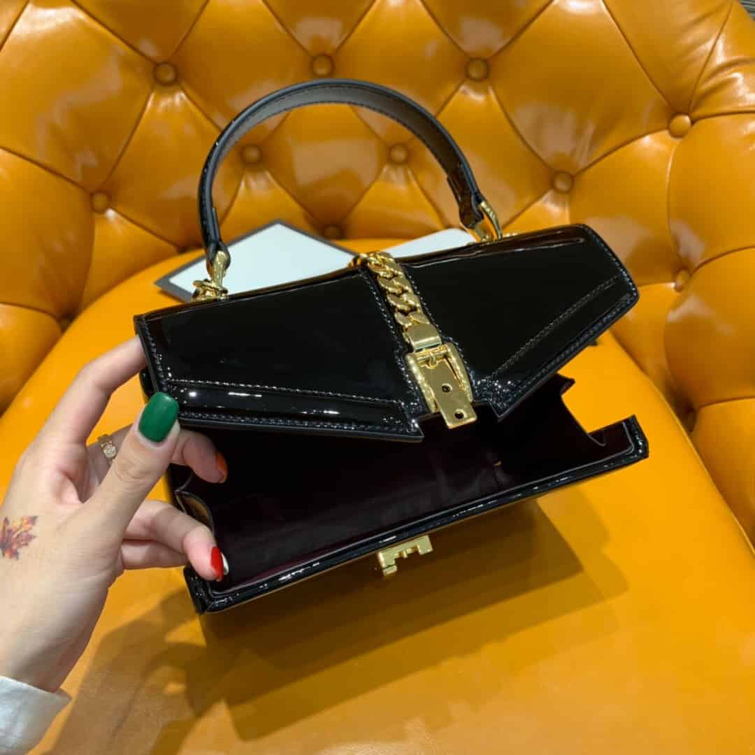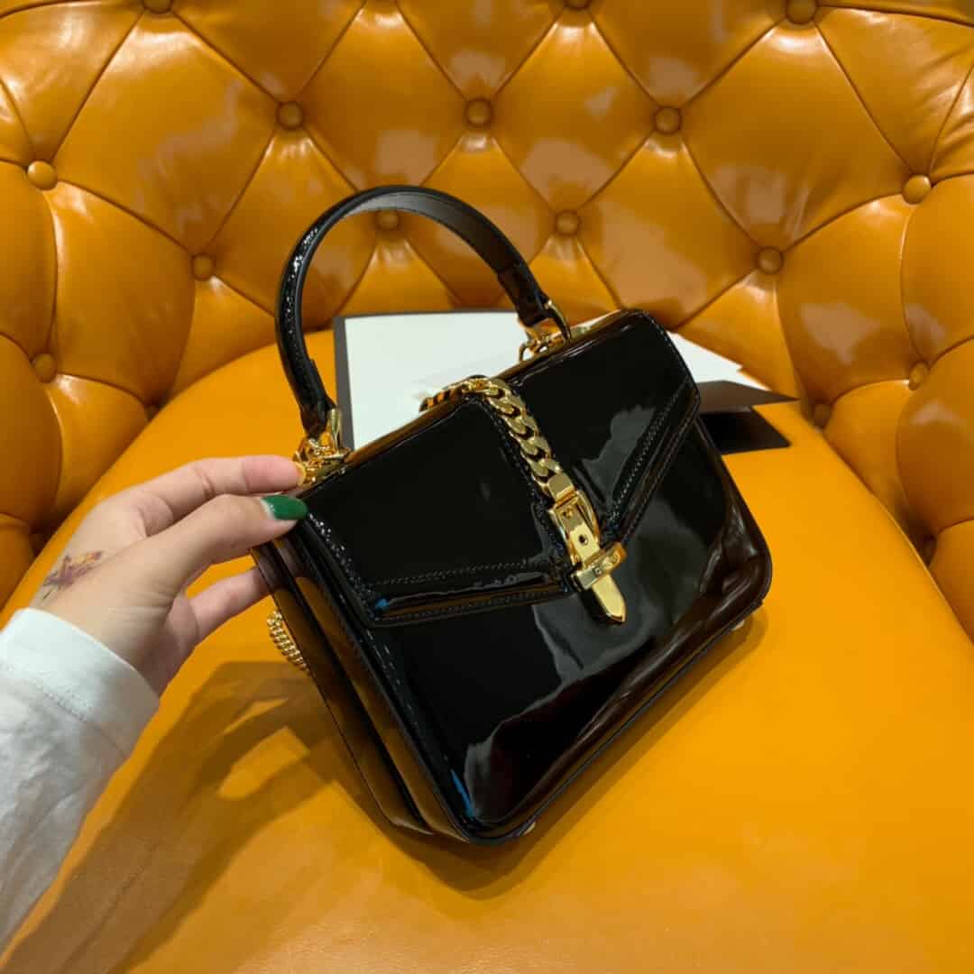 源自20 世纪60年代和70年代的 Gucci 典藏造型再度登场,以光润黑色漆皮制成这款现代风迷你手袋,衬托女性的柔美气质。Sylvie 1969系列迷你手袋致意经典设计,将金色调金属链收窄,形成从手袋正面流畅而下的精致点缀。顶部提手造型,附带可拆卸金色调船锚链肩带。