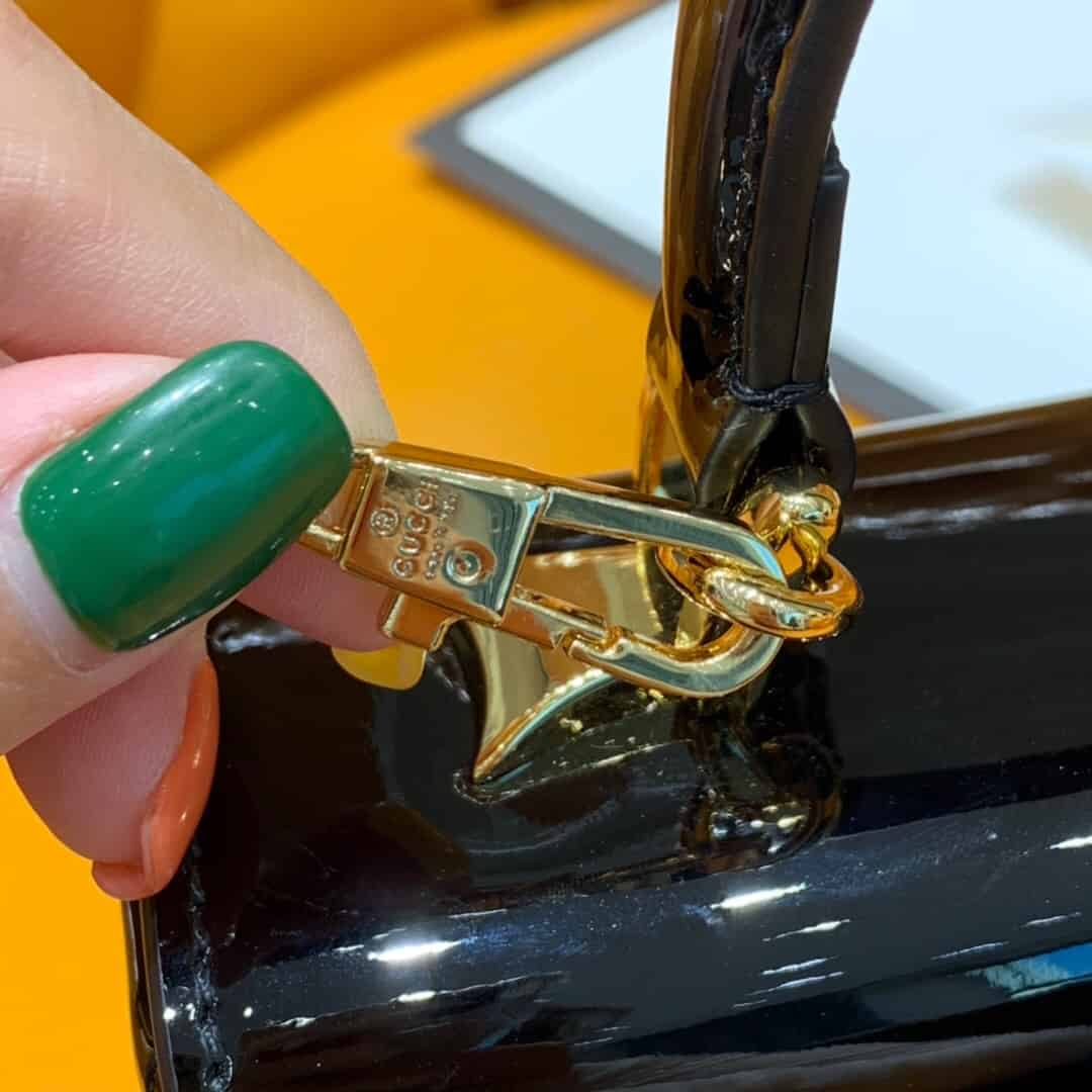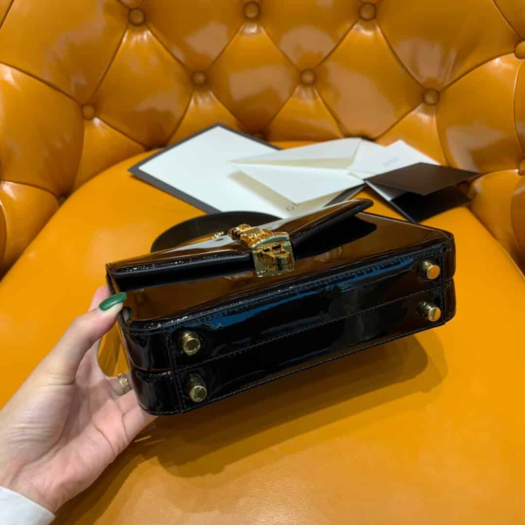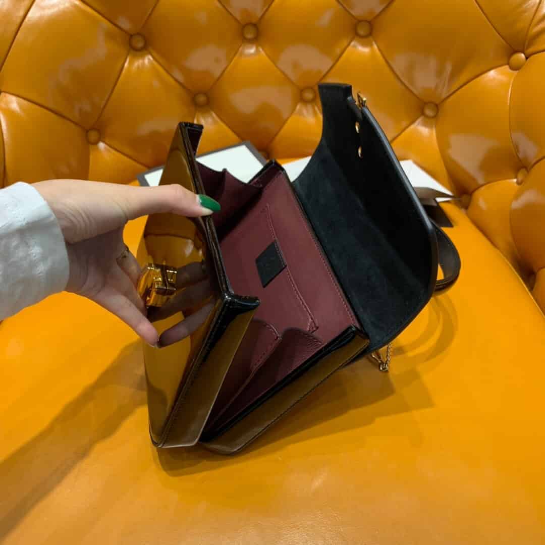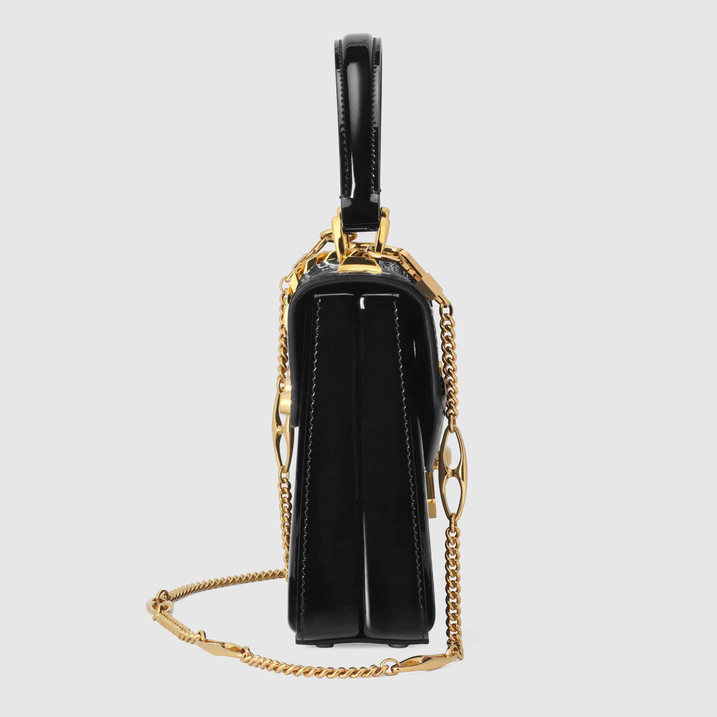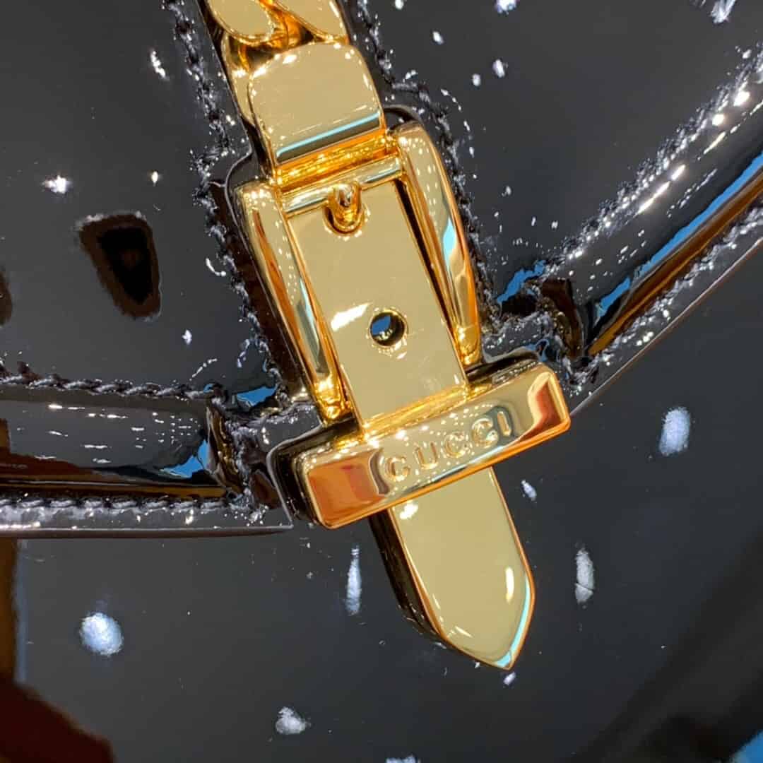 源自20 世纪60年代和70年代的 Gucci 典藏造型再度登场,以光润黑色漆皮制成这款现代风迷你手袋,衬托女性的柔美气质。Sylvie 1969系列迷你手袋致意经典设计,将金色调金属链收窄,形成从手袋正面流畅而下的精致点缀。顶部提手造型,附带可拆卸金色调船锚链肩带。