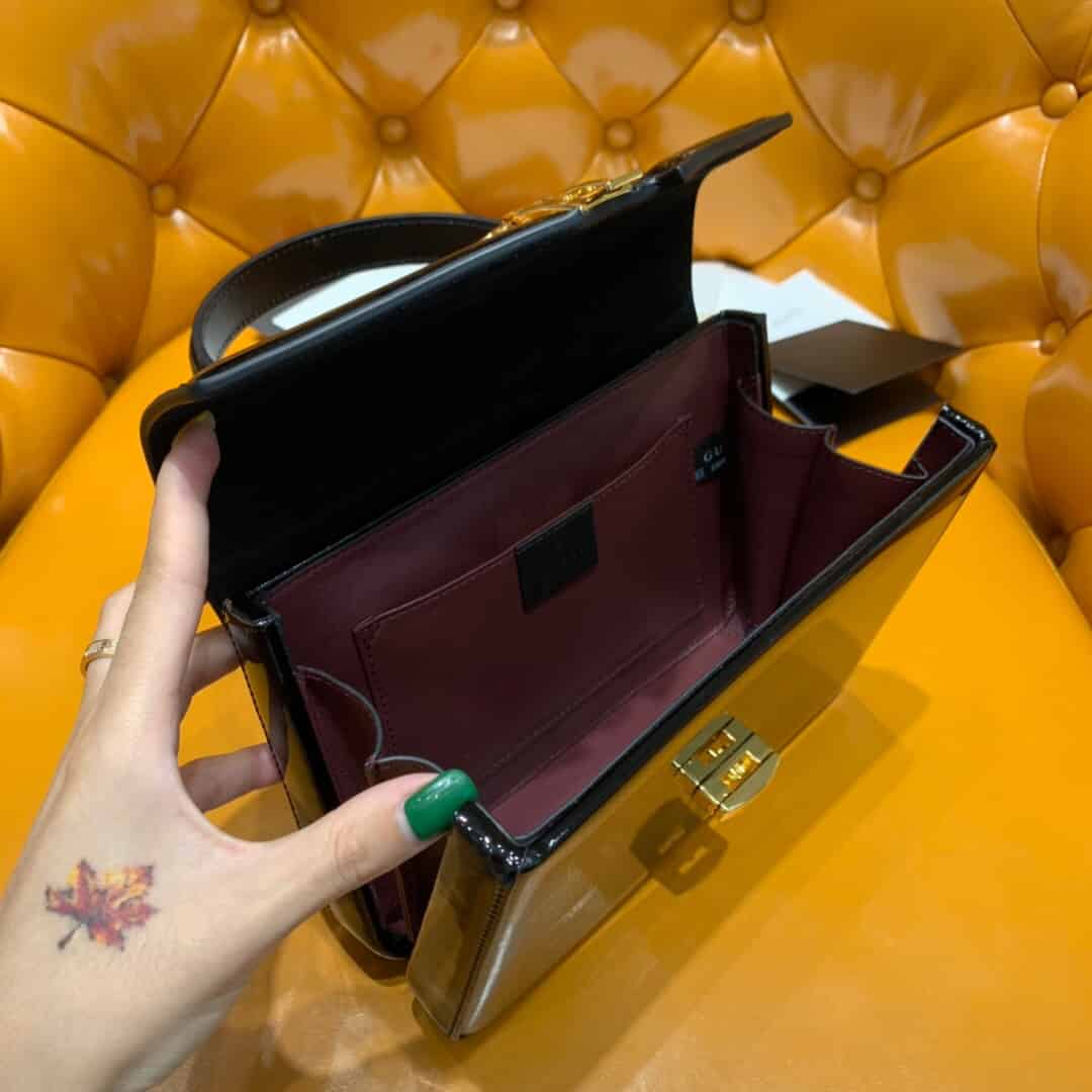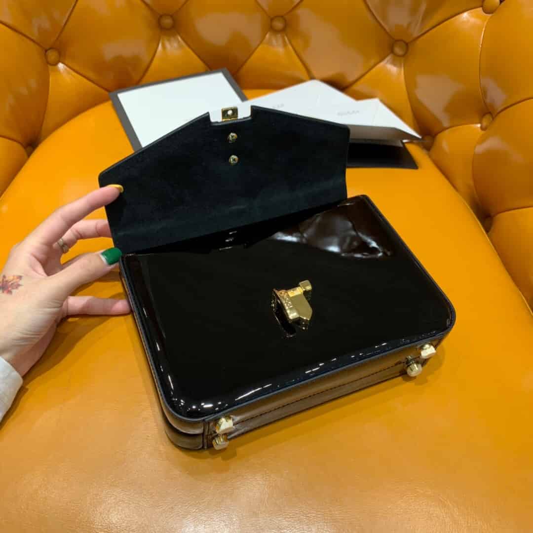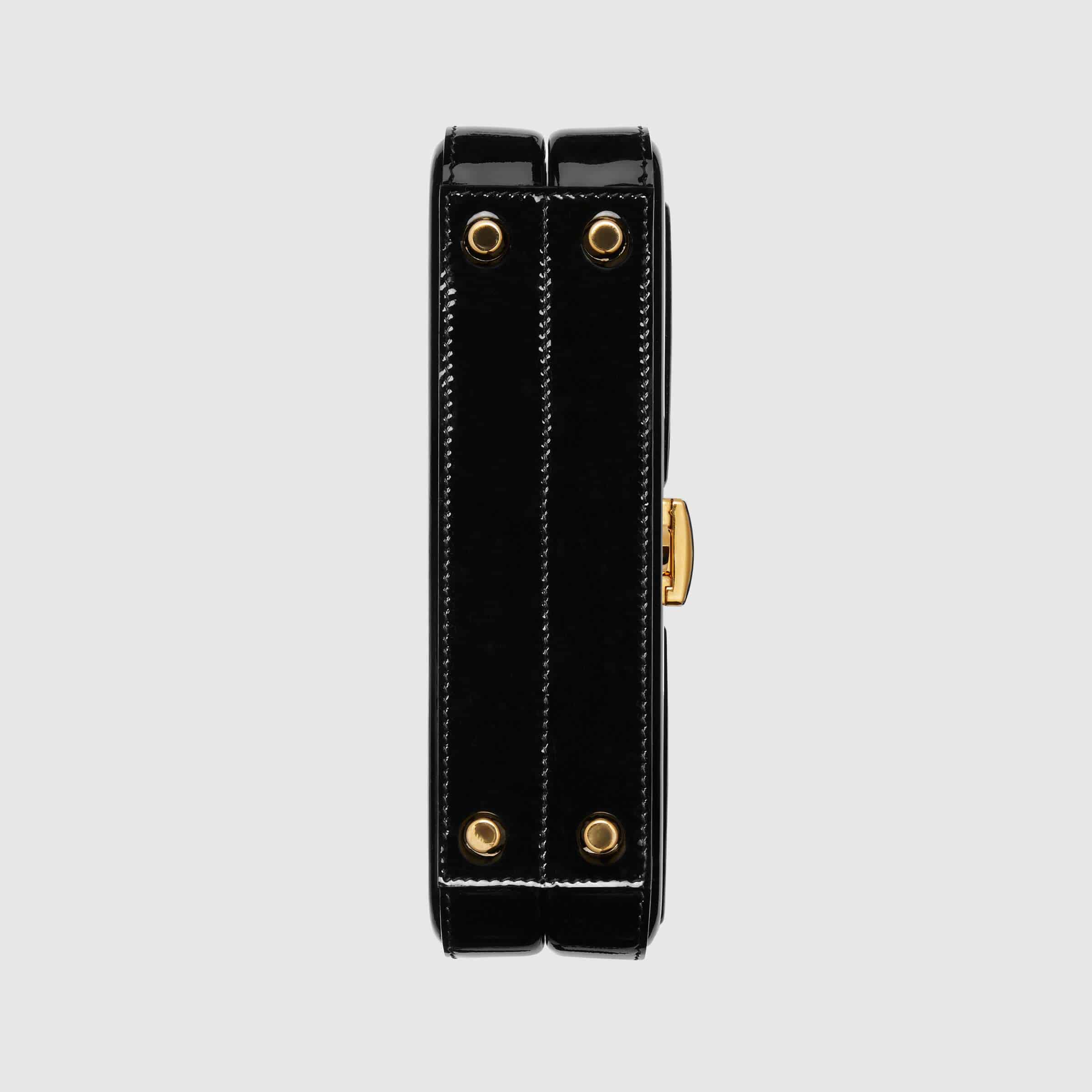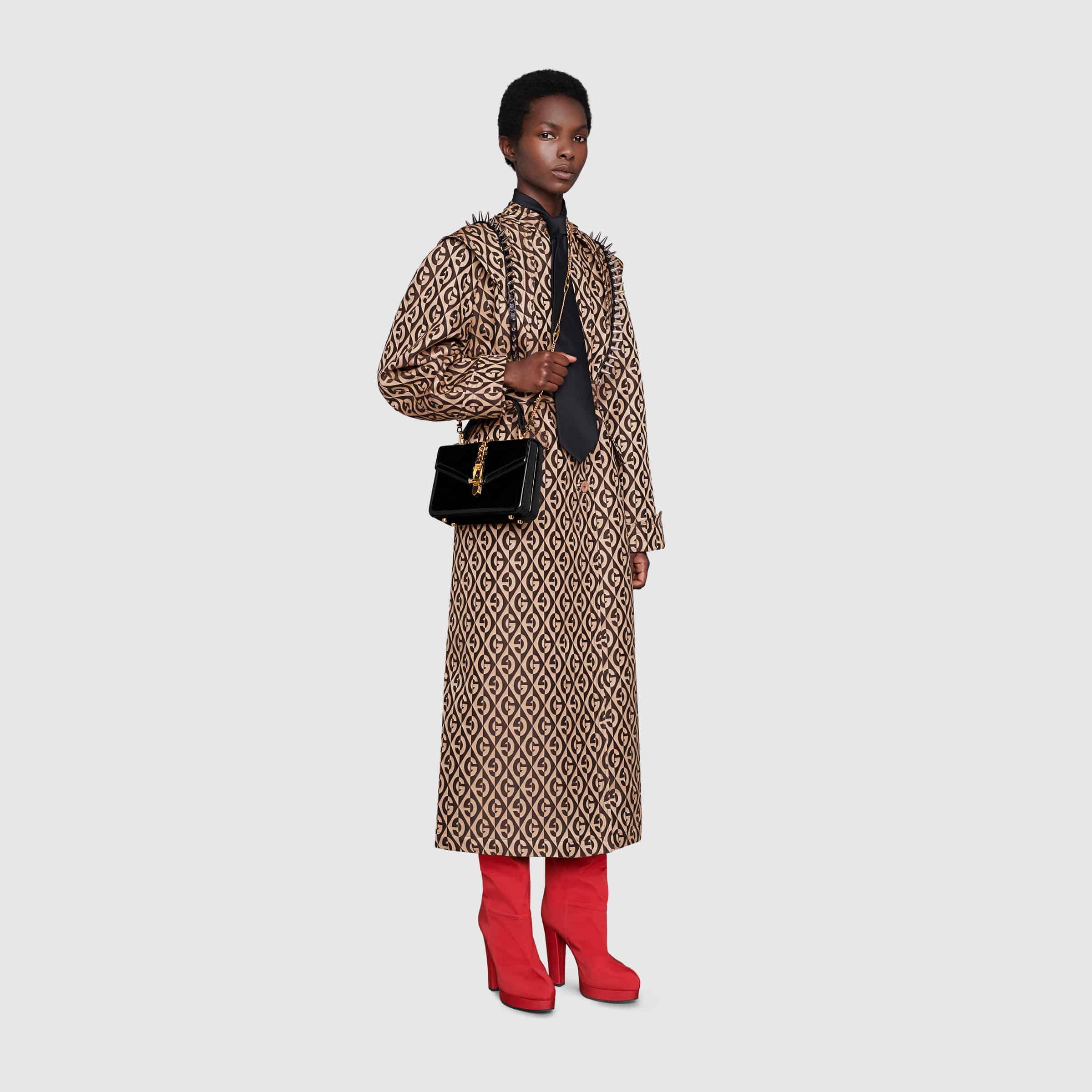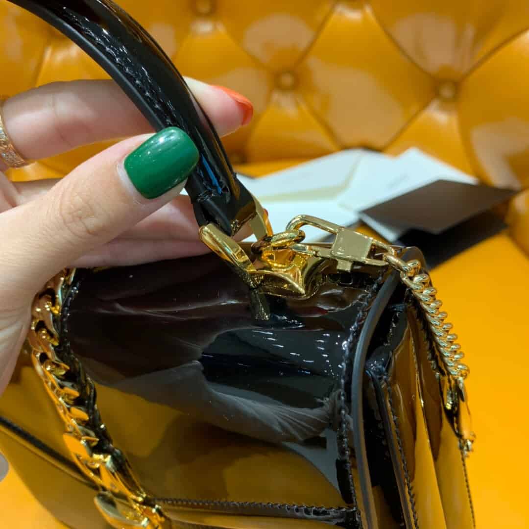 源自20 世纪60年代和70年代的 Gucci 典藏造型再度登场,以光润黑色漆皮制成这款现代风迷你手袋,衬托女性的柔美气质。Sylvie 1969系列迷你手袋致意经典设计,将金色调金属链收窄,形成从手袋正面流畅而下的精致点缀。顶部提手造型,附带可拆卸金色调船锚链肩带。