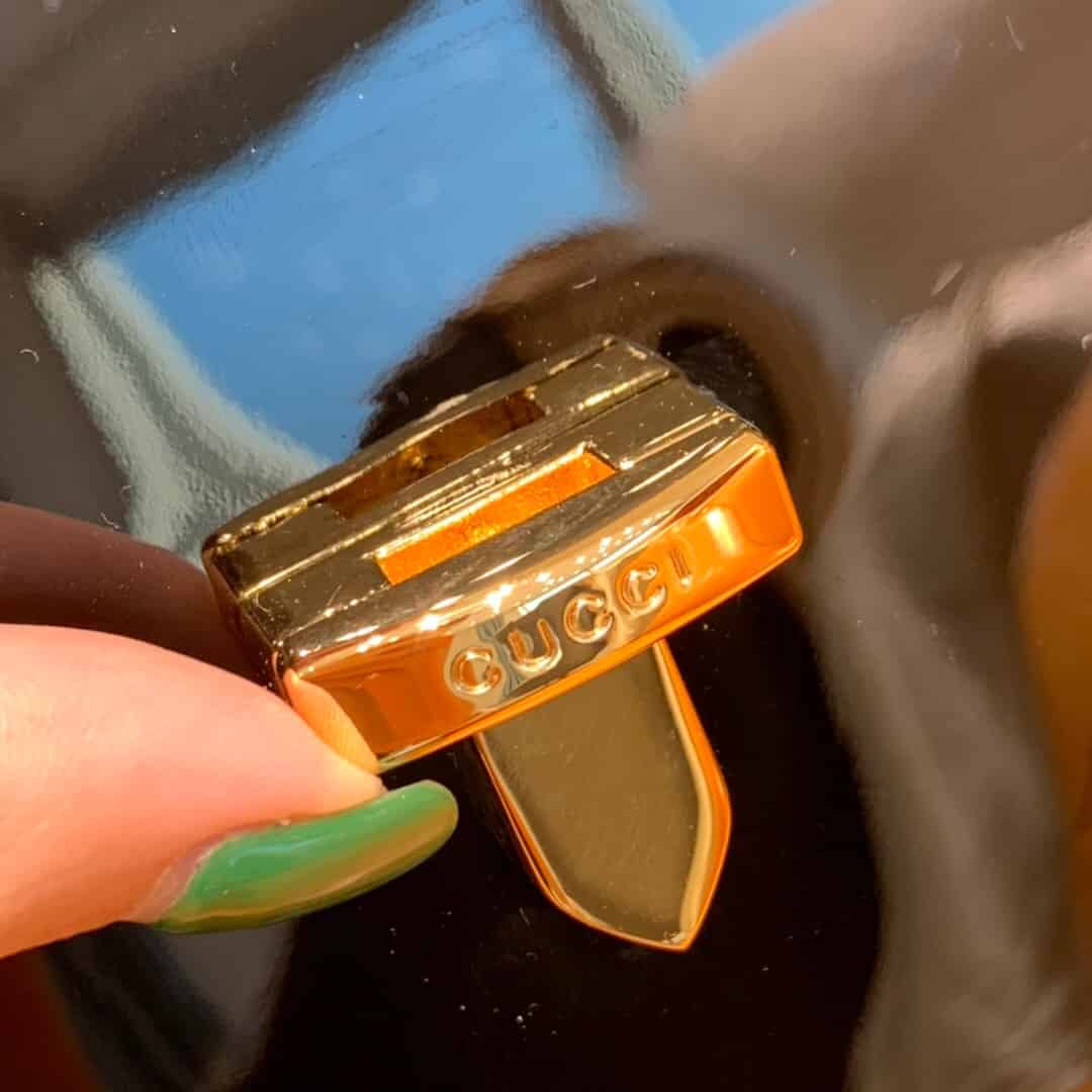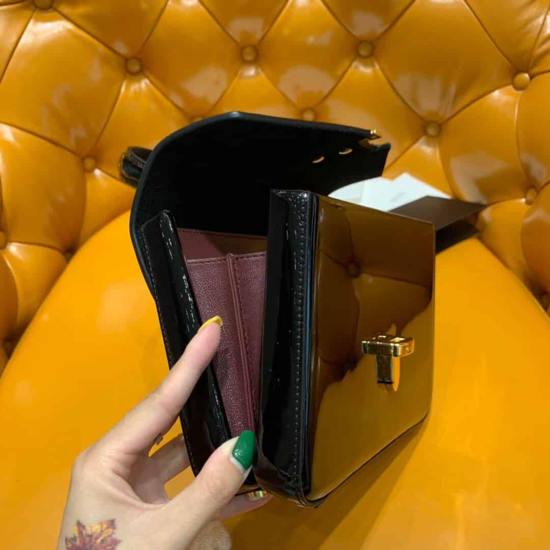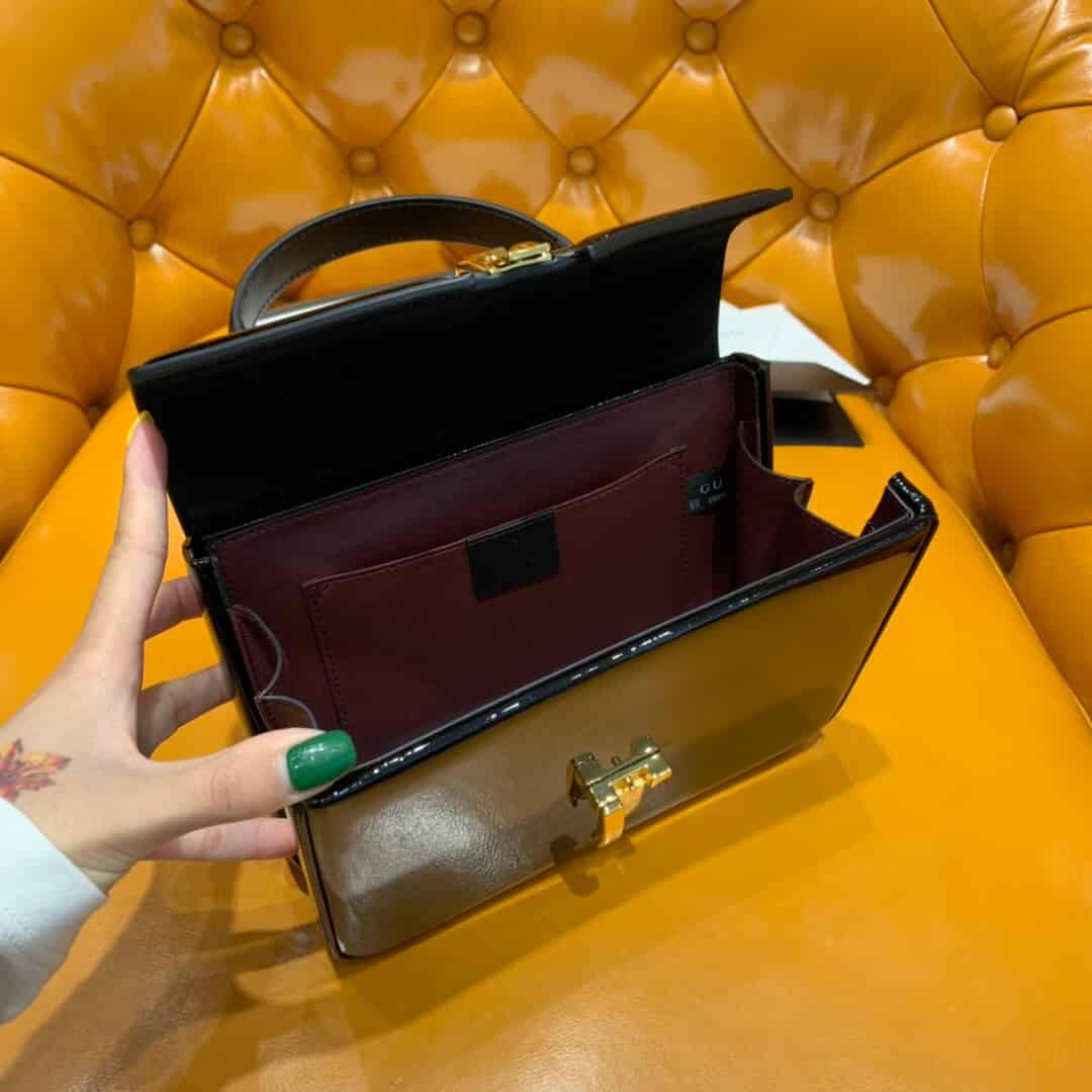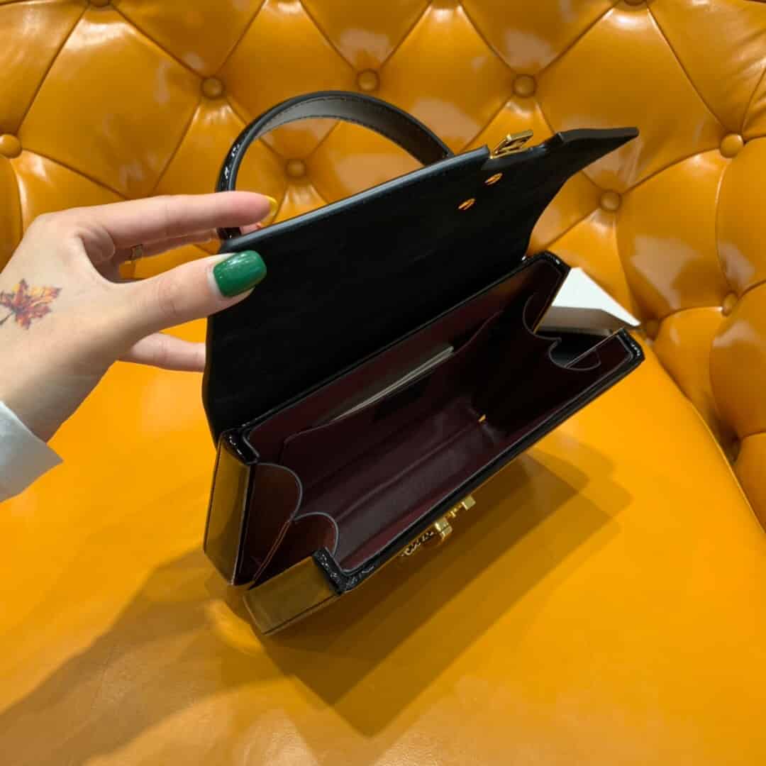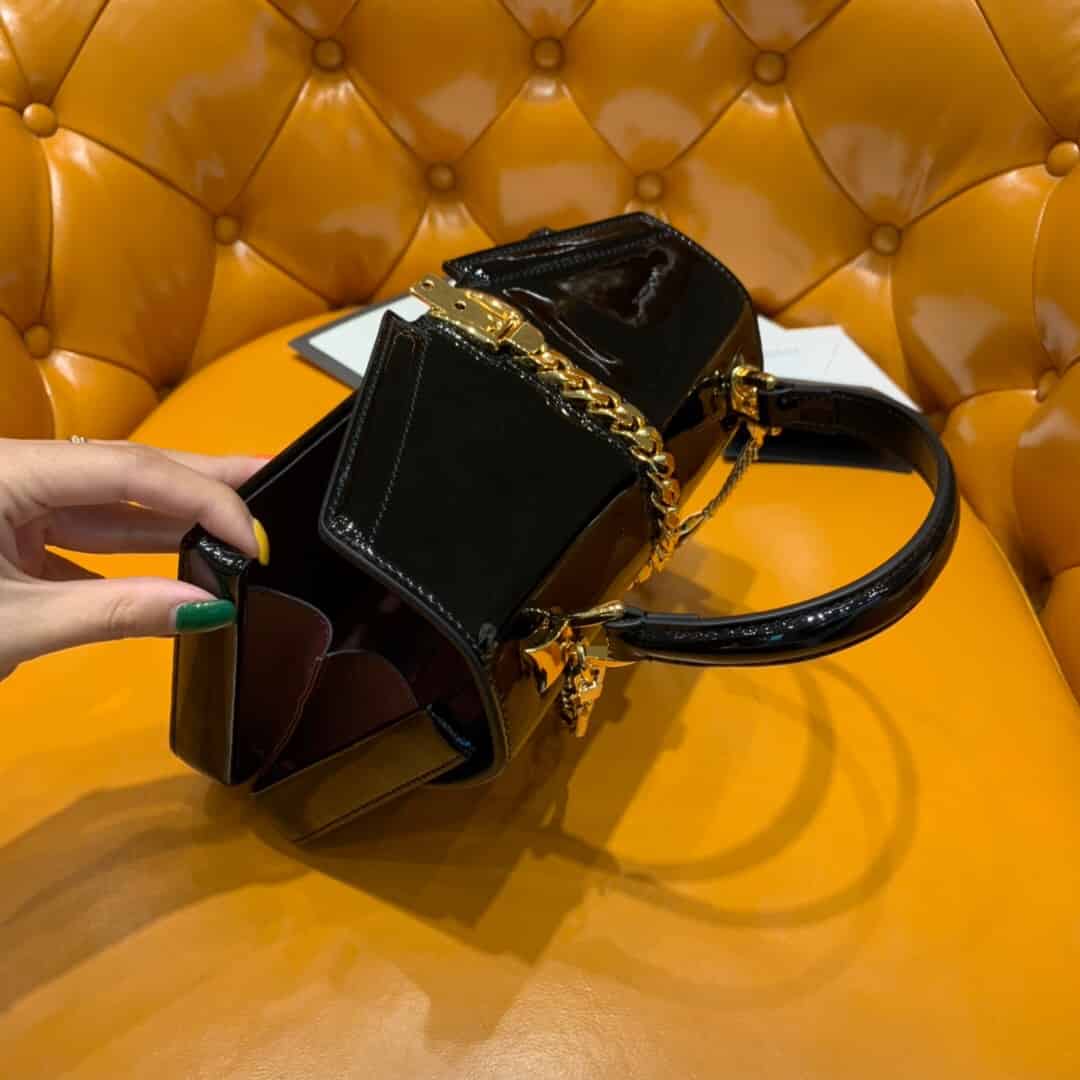 源自20 世纪60年代和70年代的 Gucci 典藏造型再度登场,以光润黑色漆皮制成这款现代风迷你手袋,衬托女性的柔美气质。Sylvie 1969系列迷你手袋致意经典设计,将金色调金属链收窄,形成从手袋正面流畅而下的精致点缀。顶部提手造型,附带可拆卸金色调船锚链肩带。