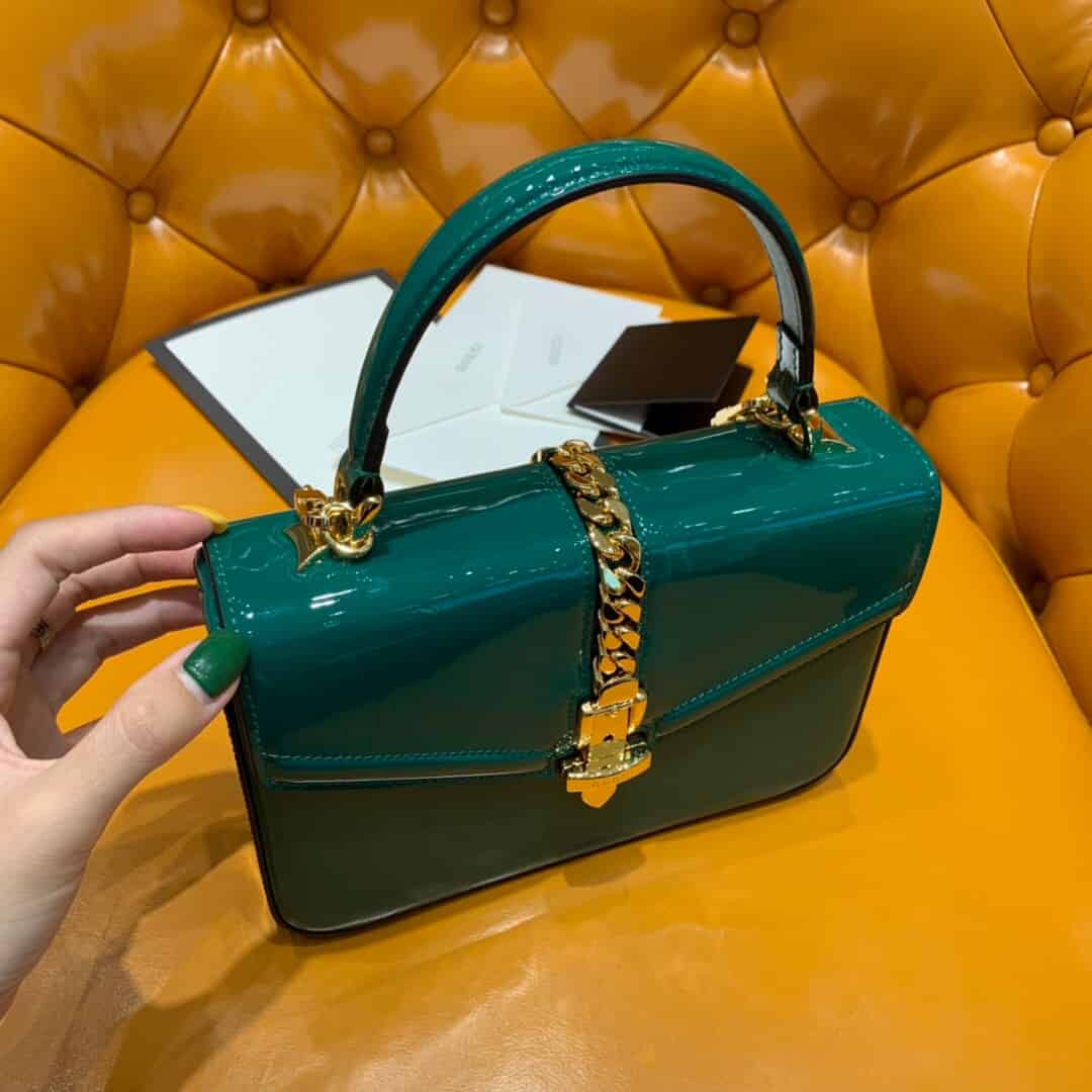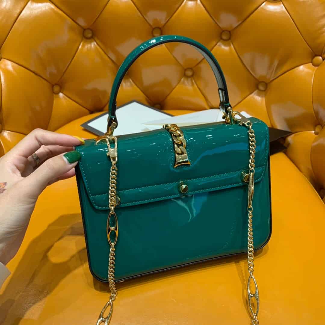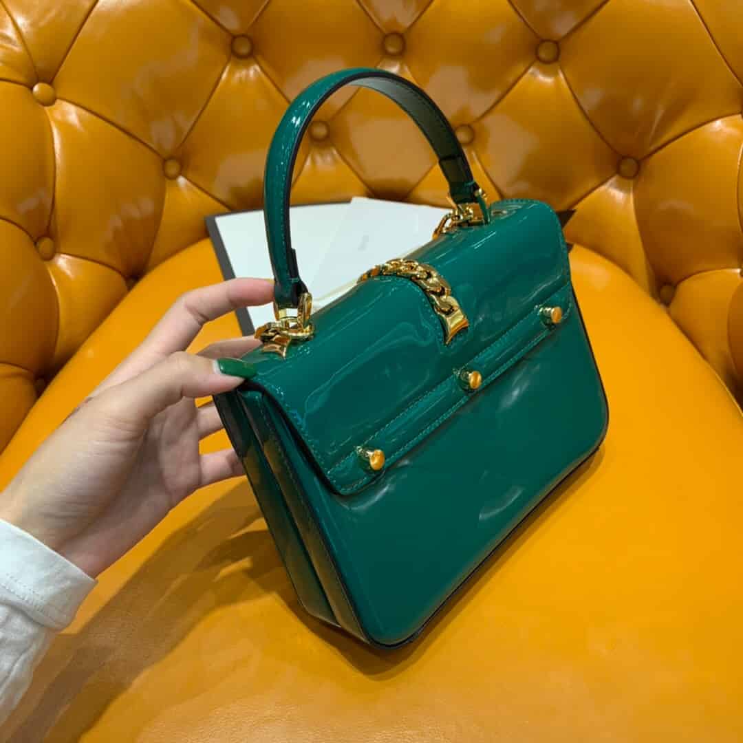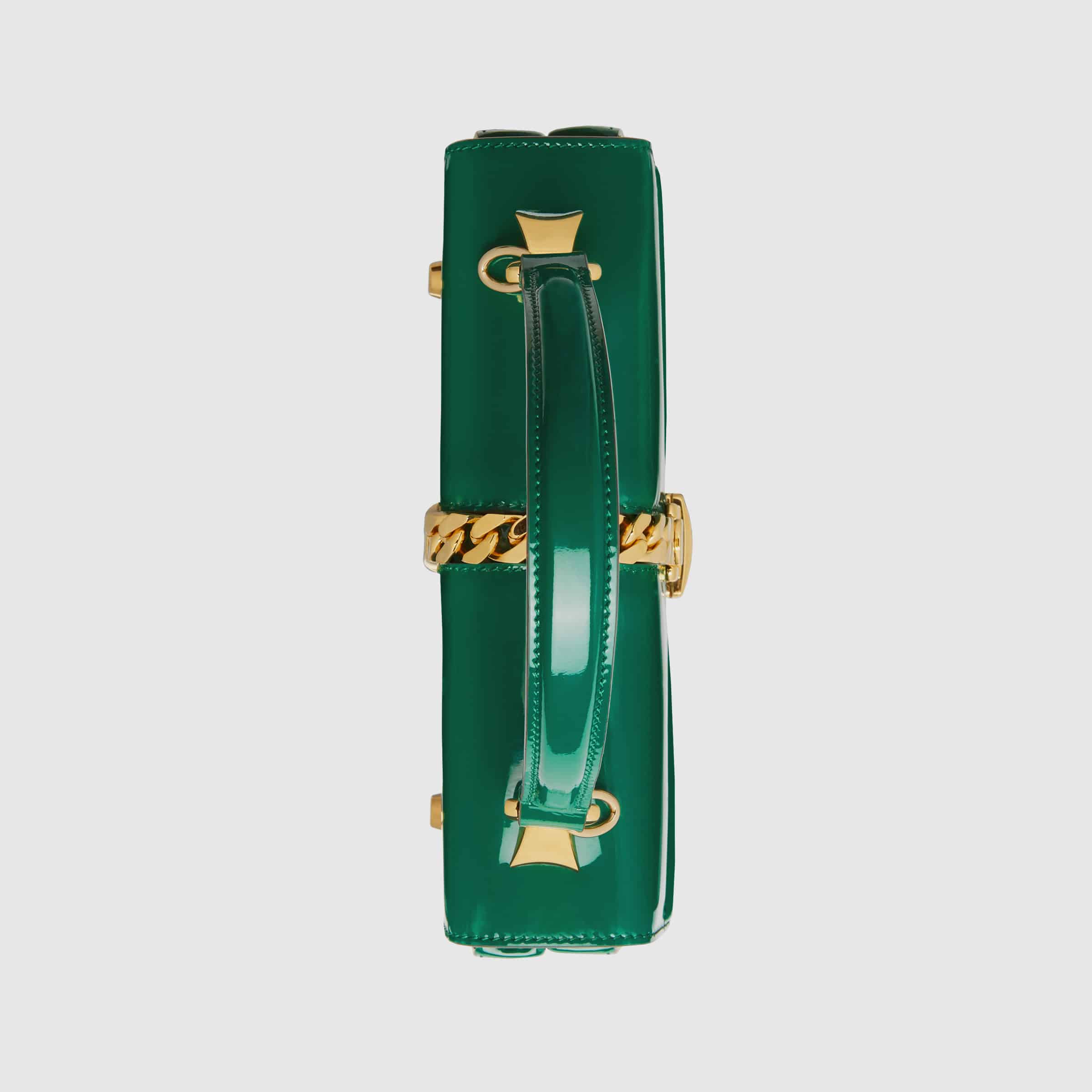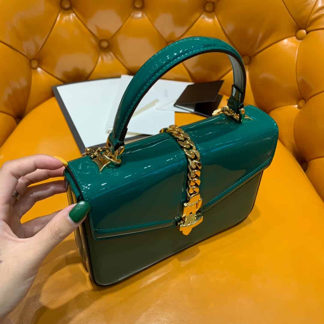 源自20世纪60年代和70年代的 Gucci 典藏造型再度登场,以光润翠绿色漆皮制成这款现代风迷你手袋,衬托女性的柔美气质。Sylvie 1969系列迷你手袋致意经典,将金色调金属链收窄,形成从手袋正面流畅而下的精致点缀。顶部提手造型,附带可拆卸金色调船锚链肩带。