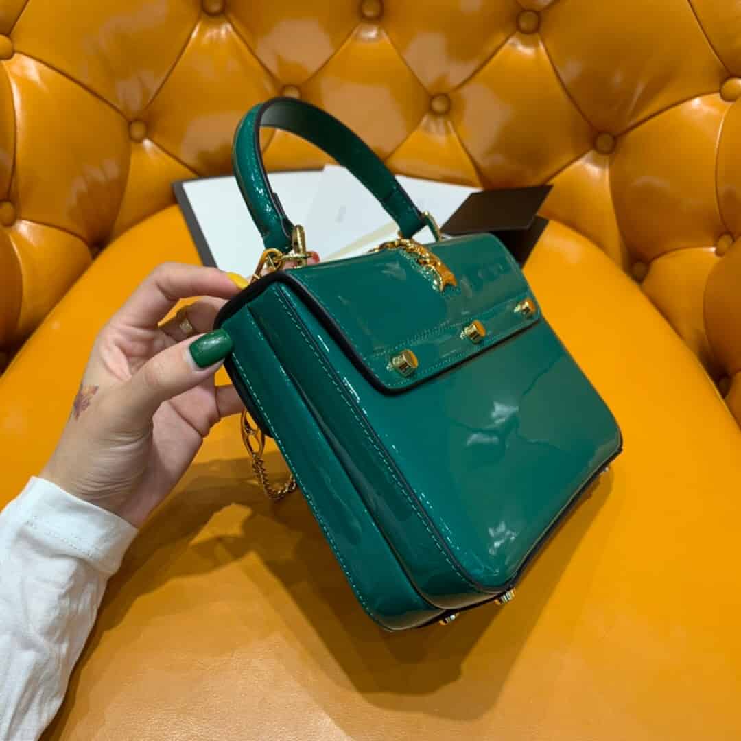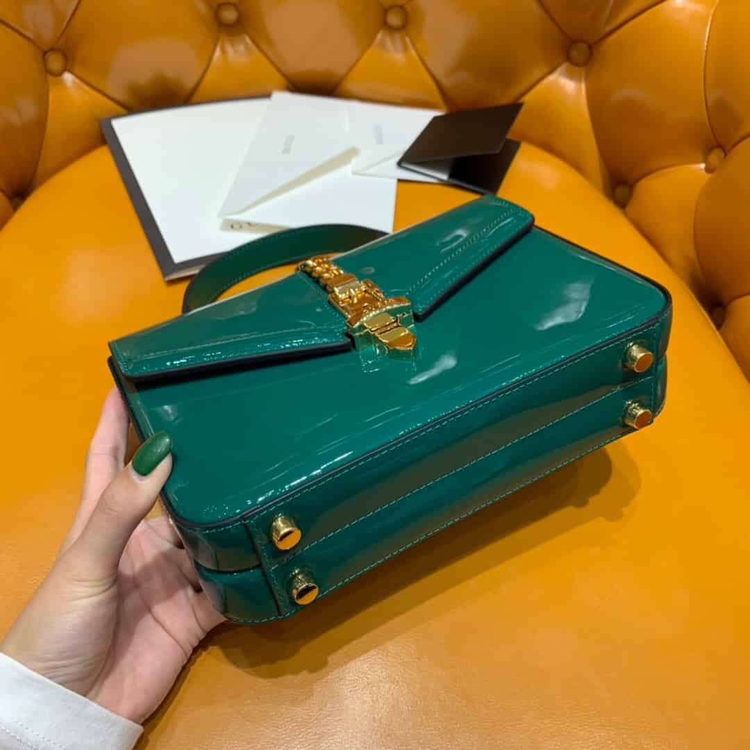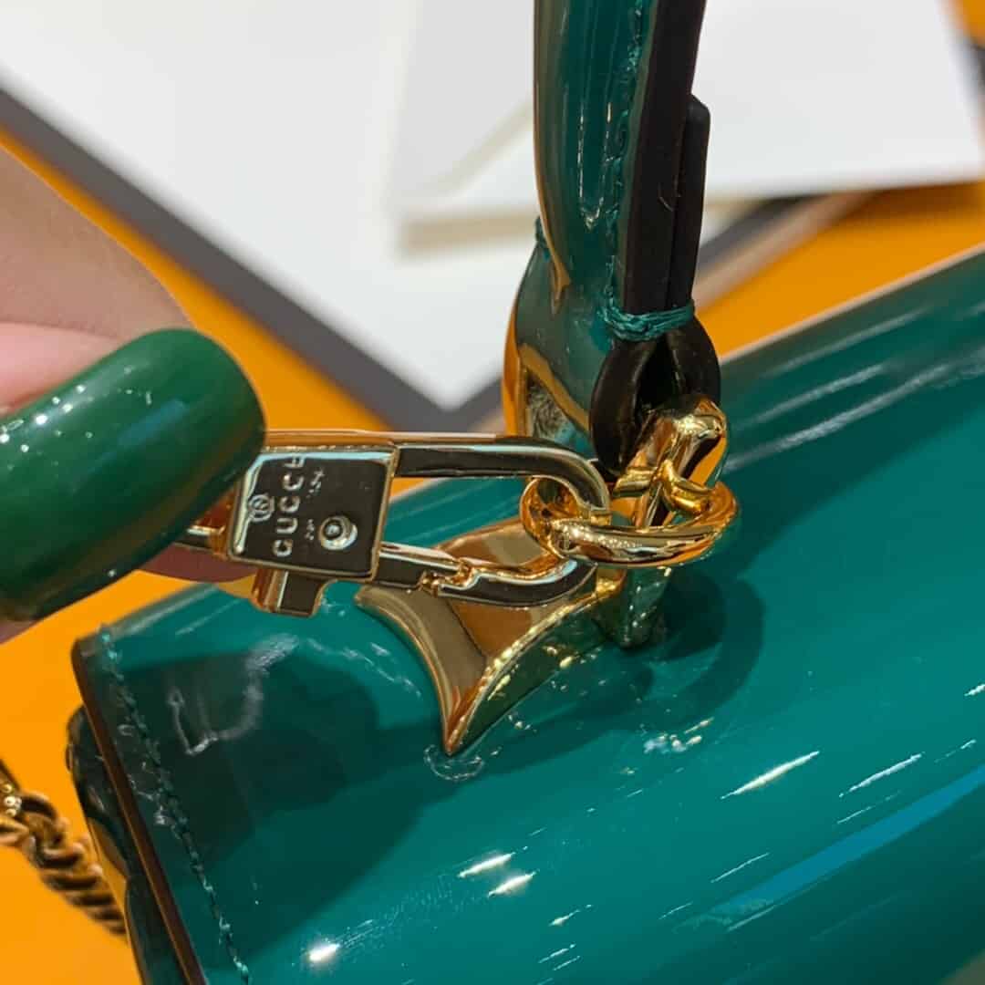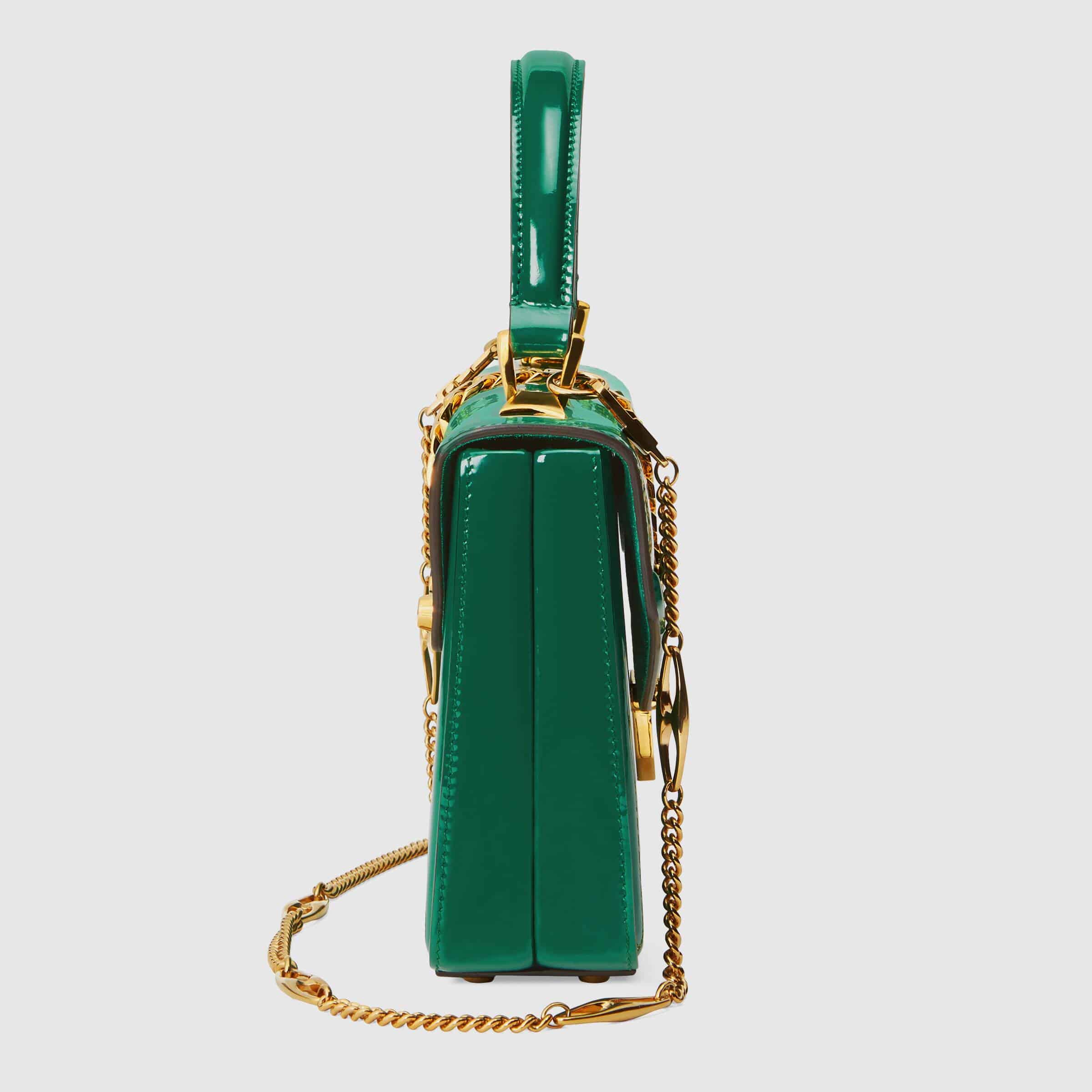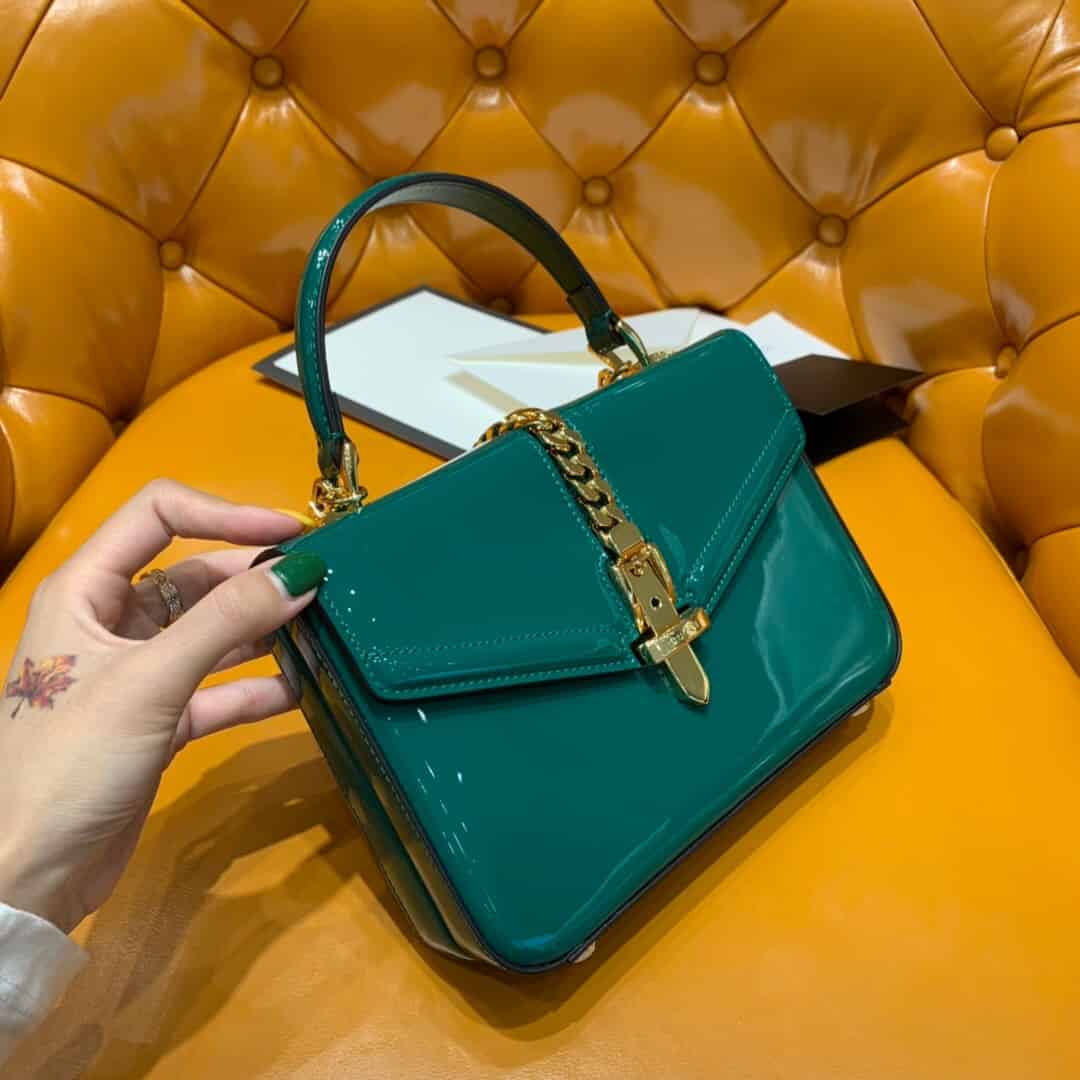源自20世纪60年代和70年代的 Gucci 典藏造型再度登场,以光润翠绿色漆皮制成这款现代风迷你手袋,衬托女性的柔美气质。Sylvie 1969系列迷你手袋致意经典,将金色调金属链收窄,形成从手袋正面流畅而下的精致点缀。顶部提手造型,附带可拆卸金色调船锚链肩带。