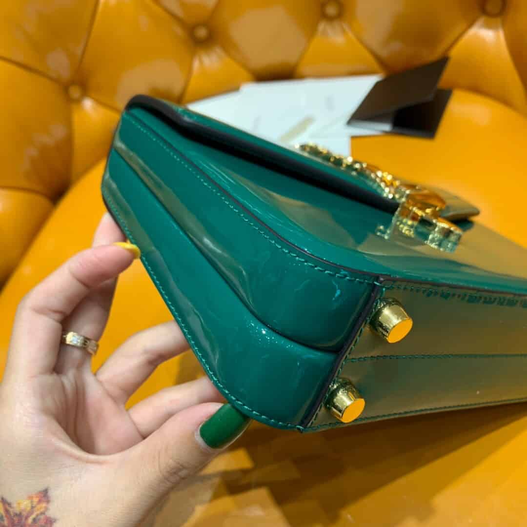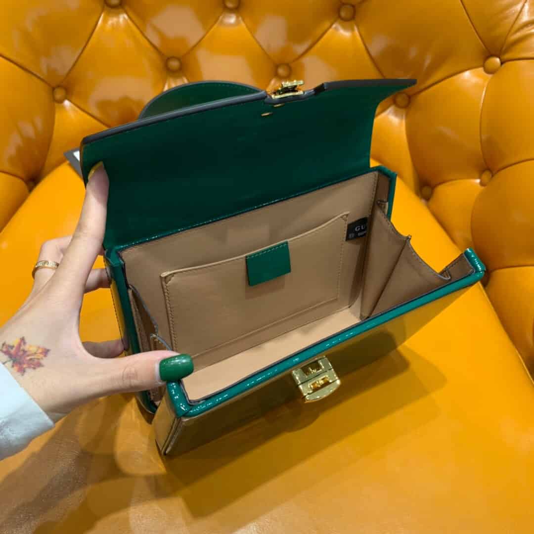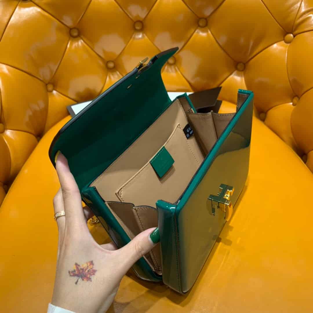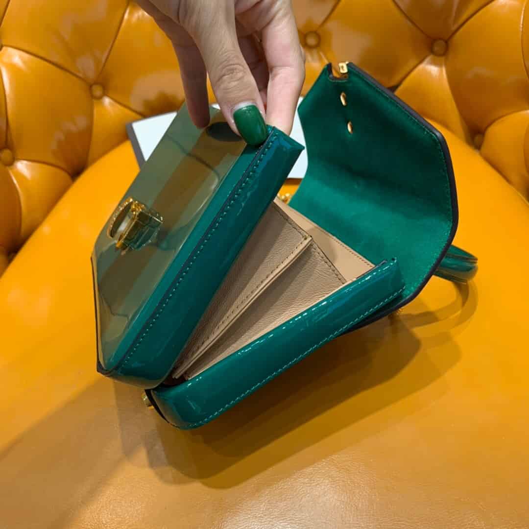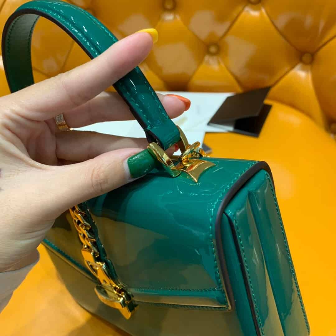 源自20世纪60年代和70年代的 Gucci 典藏造型再度登场,以光润翠绿色漆皮制成这款现代风迷你手袋,衬托女性的柔美气质。Sylvie 1969系列迷你手袋致意经典,将金色调金属链收窄,形成从手袋正面流畅而下的精致点缀。顶部提手造型,附带可拆卸金色调船锚链肩带。