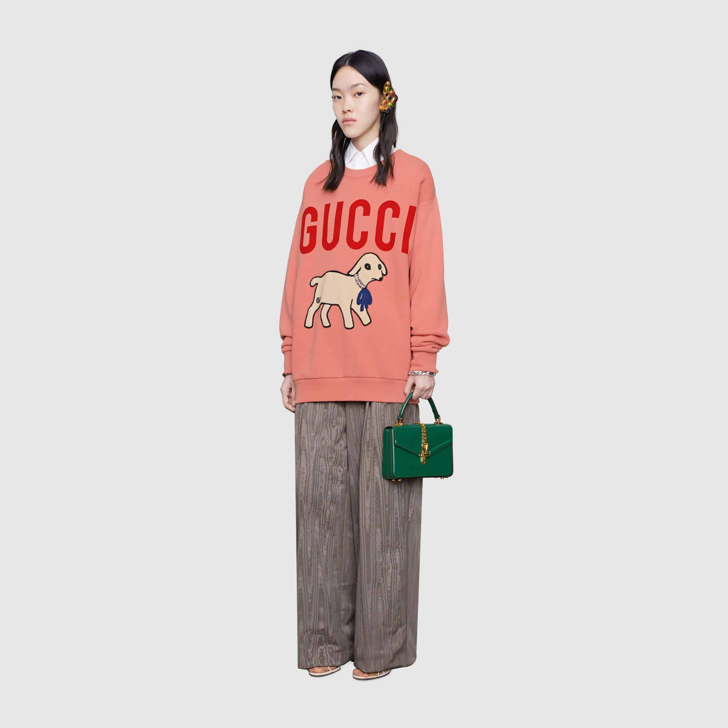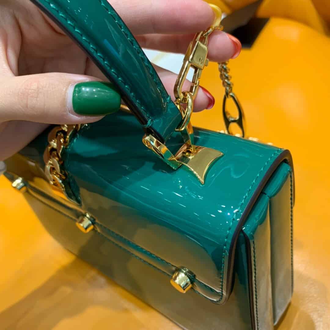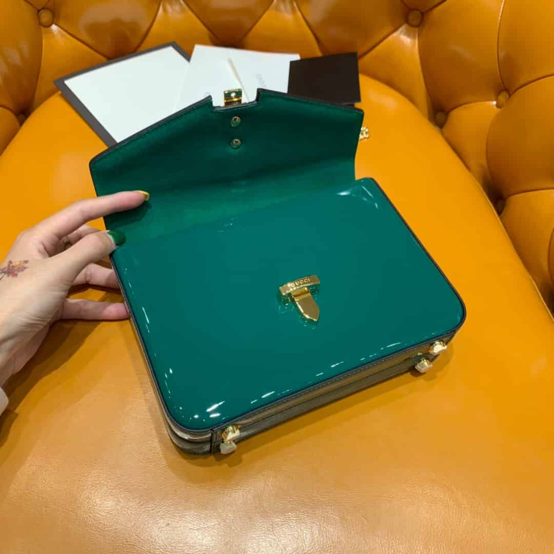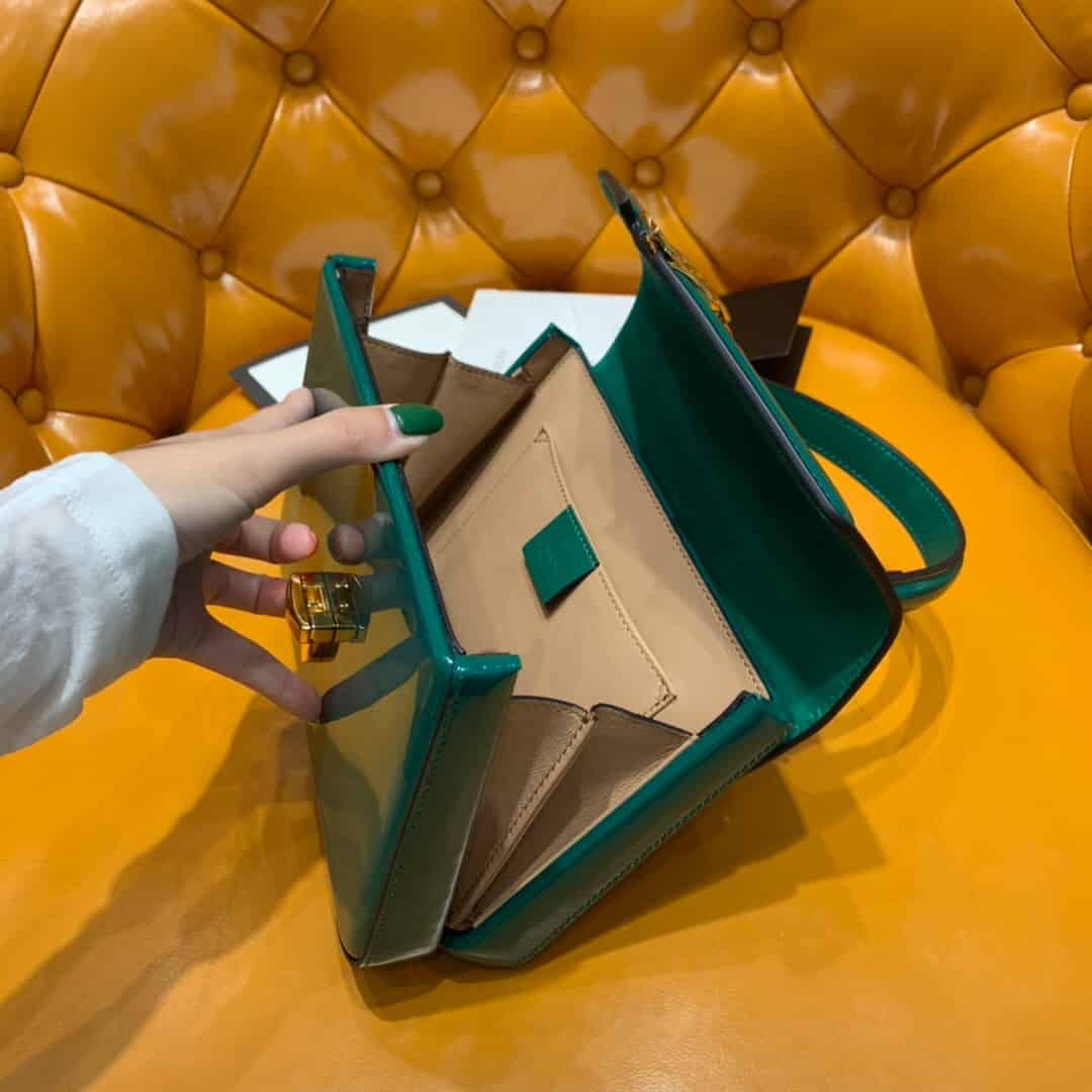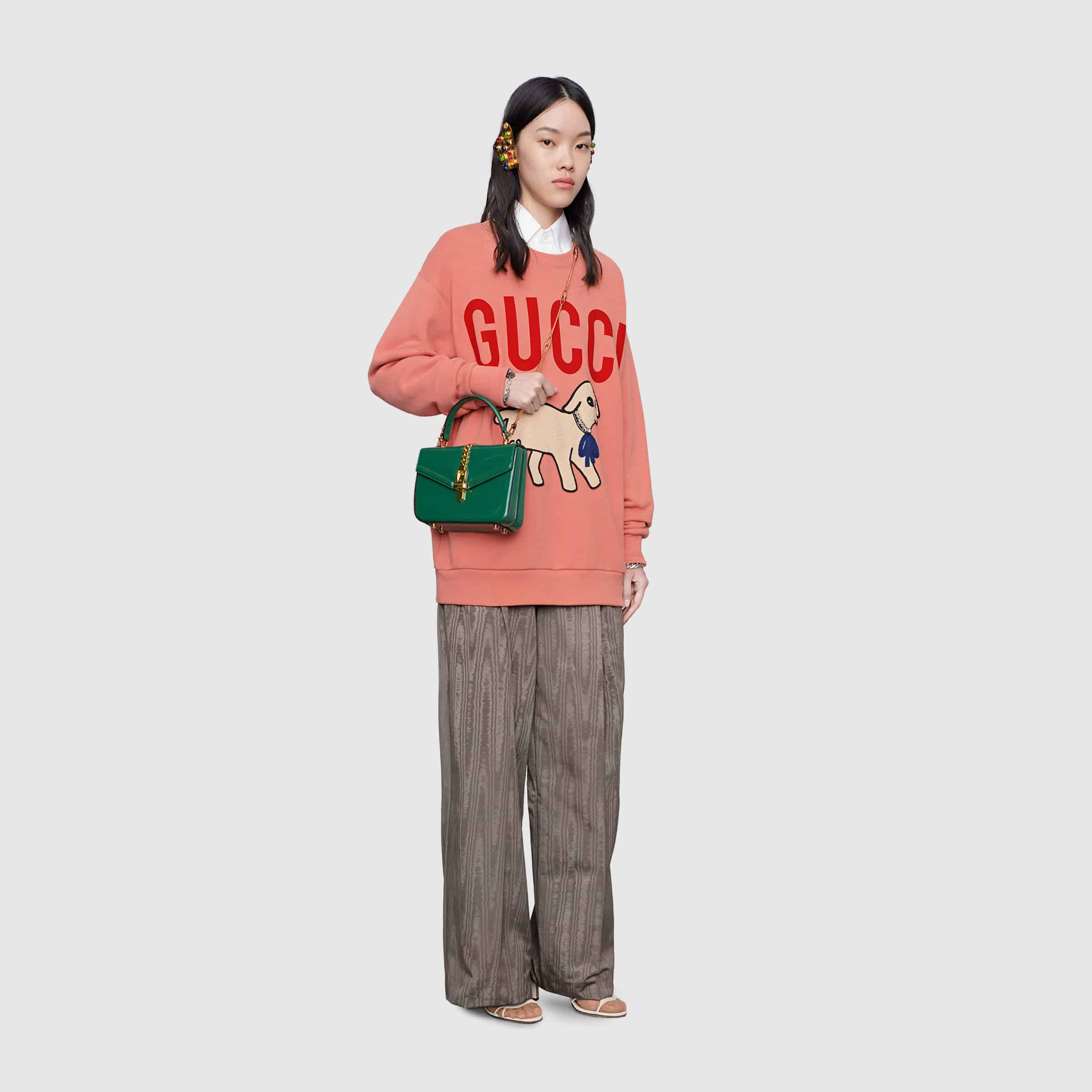 源自20世纪60年代和70年代的 Gucci 典藏造型再度登场,以光润翠绿色漆皮制成这款现代风迷你手袋,衬托女性的柔美气质。Sylvie 1969系列迷你手袋致意经典,将金色调金属链收窄,形成从手袋正面流畅而下的精致点缀。顶部提手造型,附带可拆卸金色调船锚链肩带。