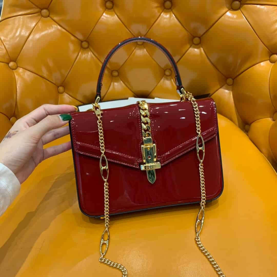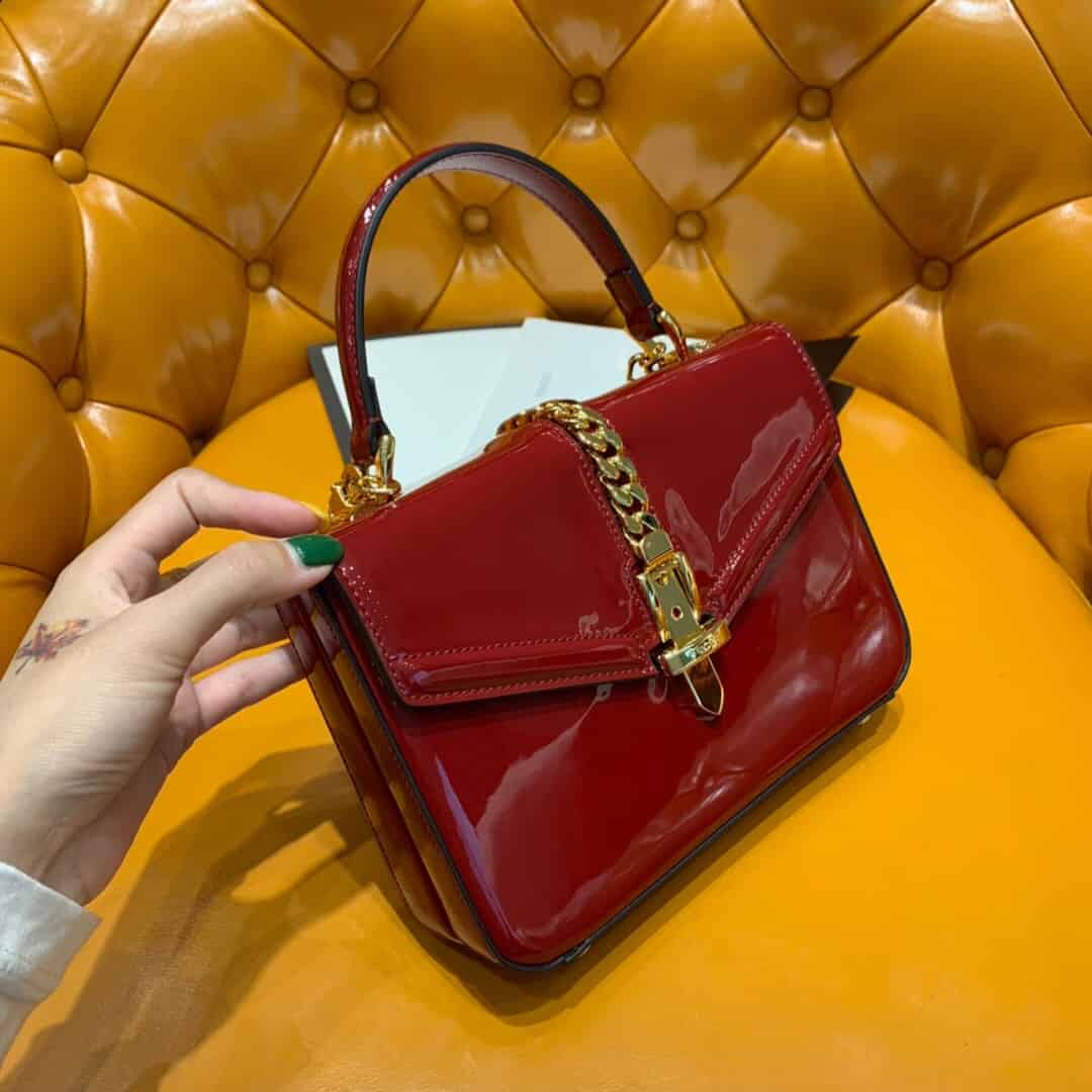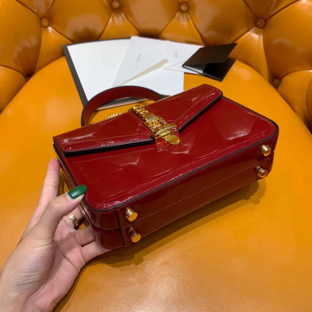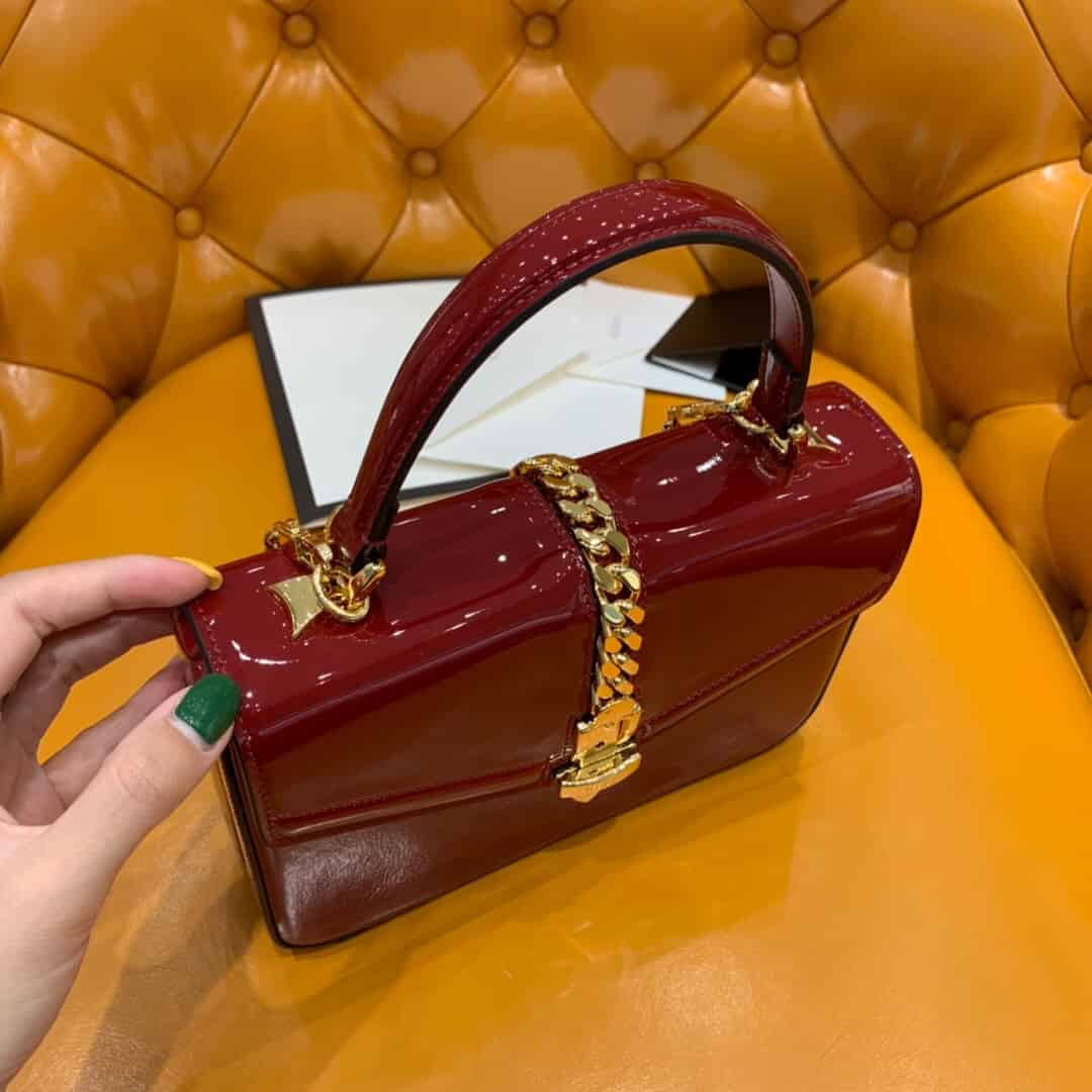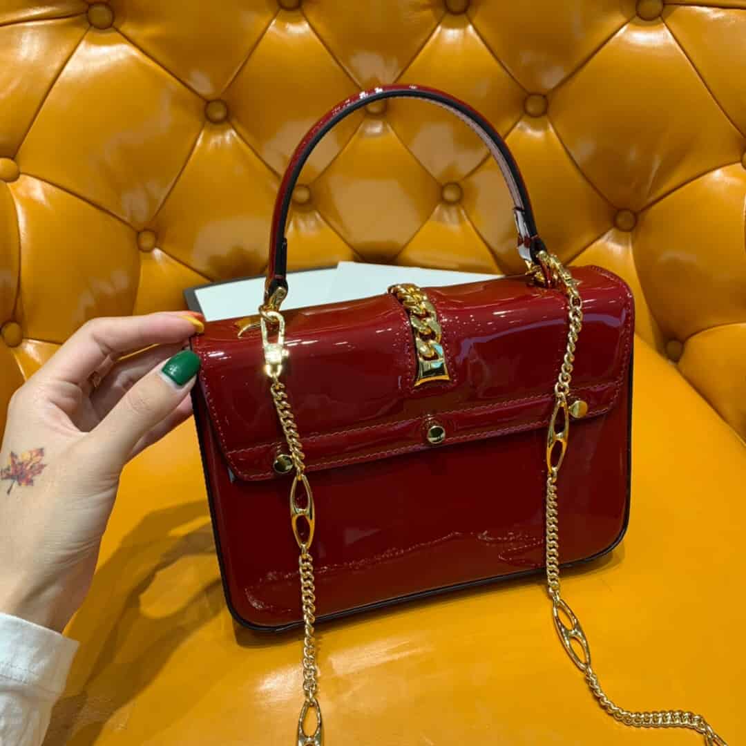 源自20世纪60年代和70年代的 Gucci 典藏造型再度登场,以光润红色漆皮制成这款现代风迷你手袋,衬托女性的柔美气质。Sylvie 1969系列迷你手袋致意经典,将金色调金属链收窄,形成从手袋正面流畅而下的精致点缀。顶部提手造型,附带可拆卸金色调船锚链肩带。