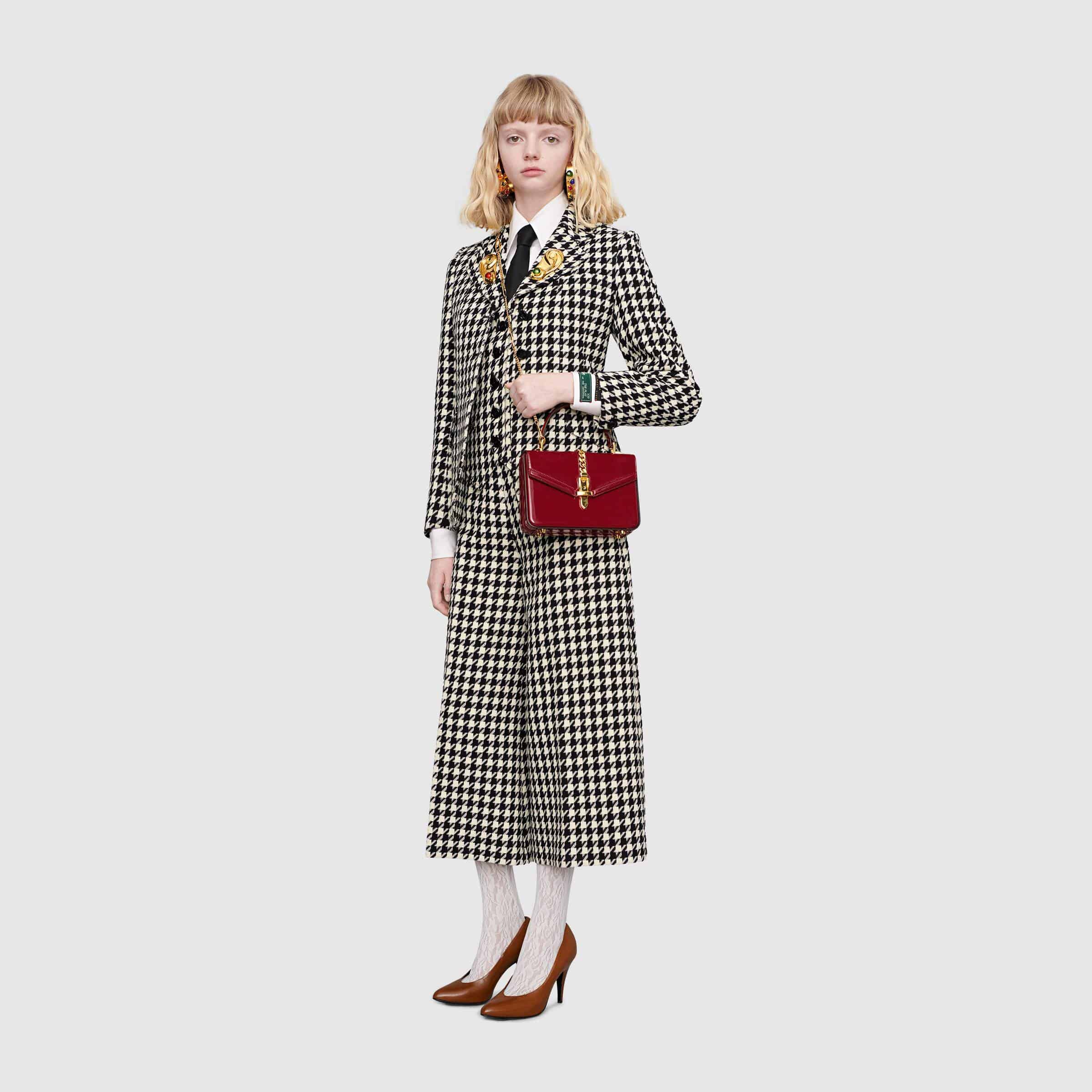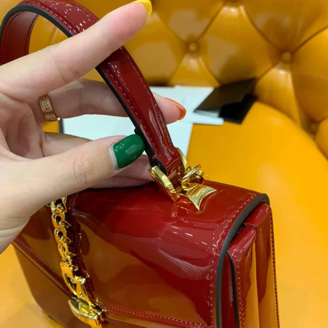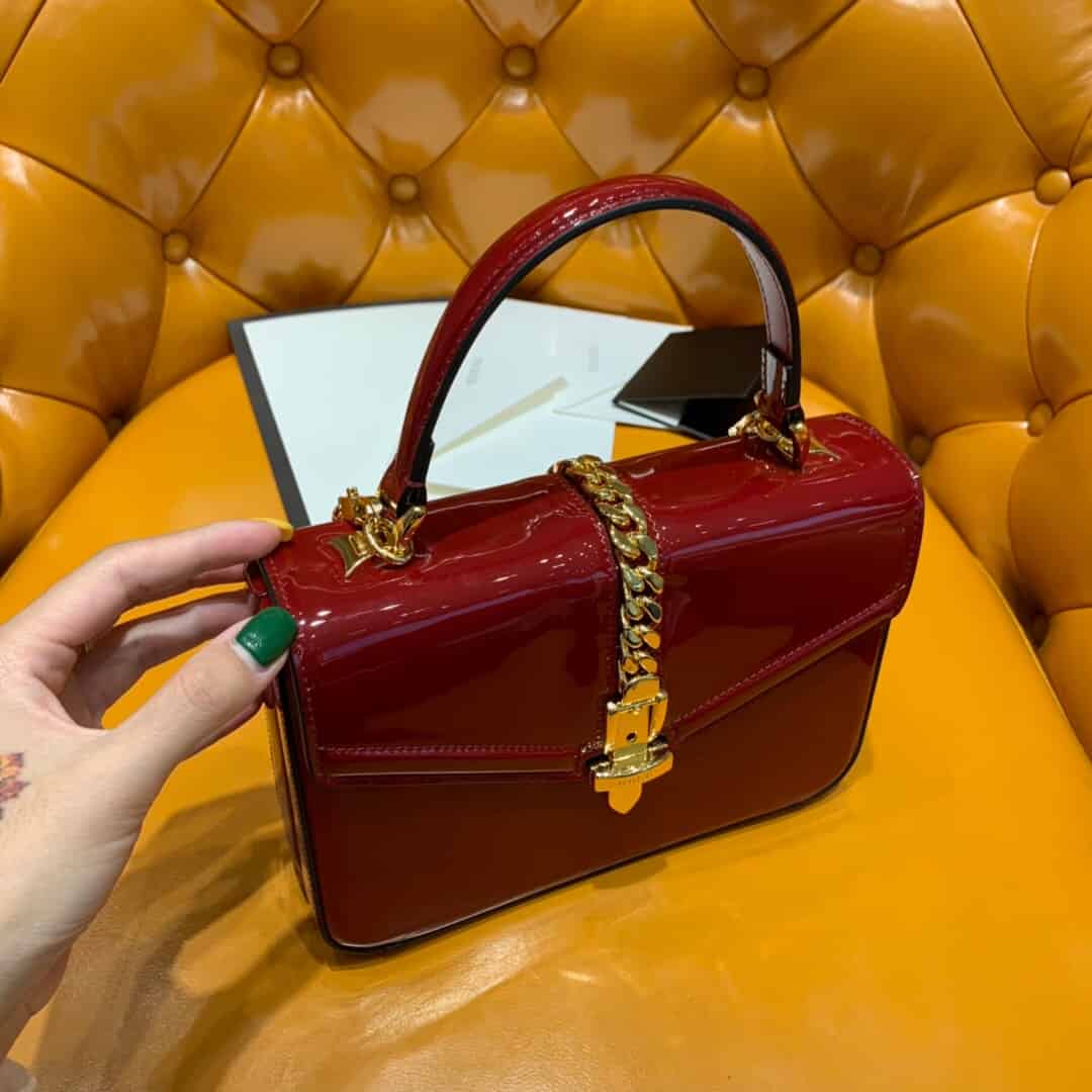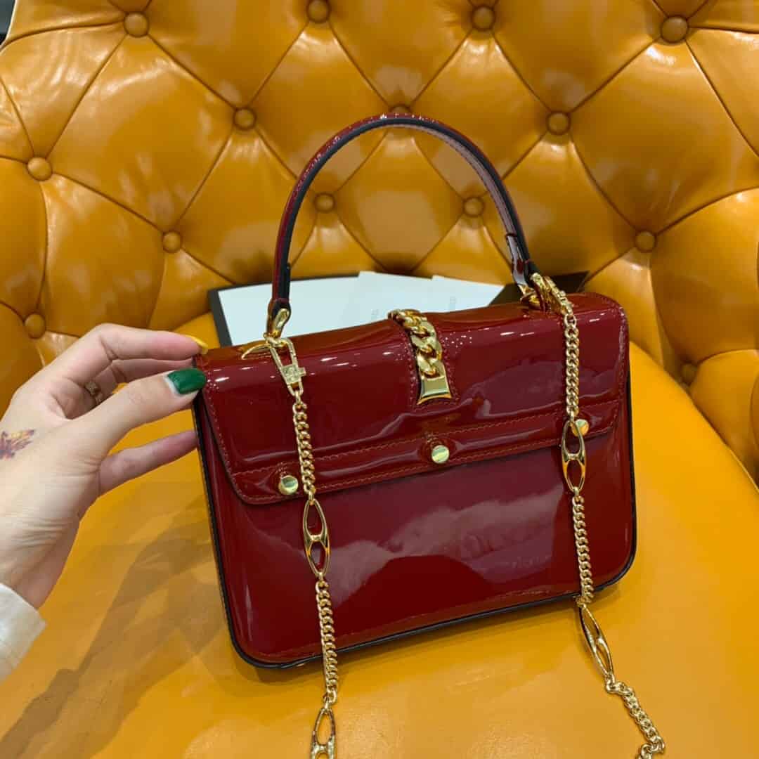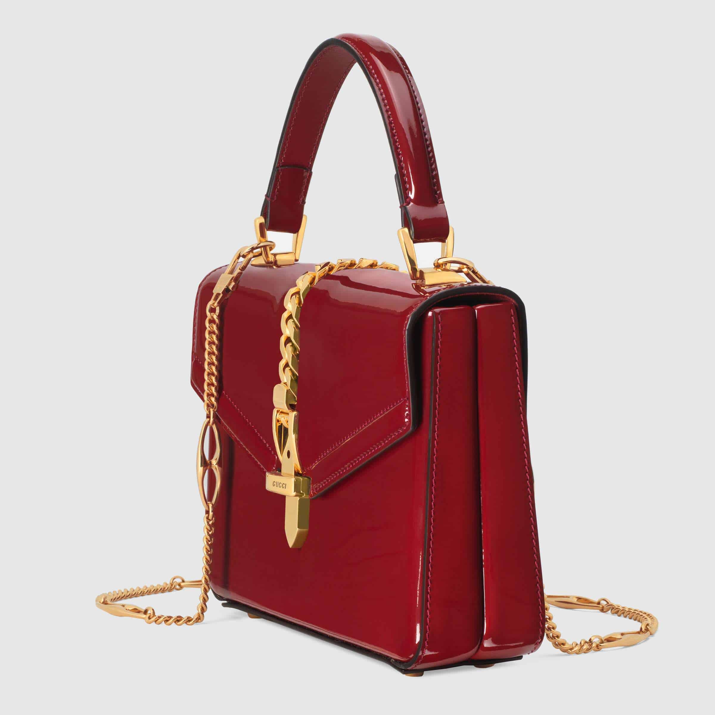 源自20世纪60年代和70年代的 Gucci 典藏造型再度登场,以光润红色漆皮制成这款现代风迷你手袋,衬托女性的柔美气质。Sylvie 1969系列迷你手袋致意经典,将金色调金属链收窄,形成从手袋正面流畅而下的精致点缀。顶部提手造型,附带可拆卸金色调船锚链肩带。