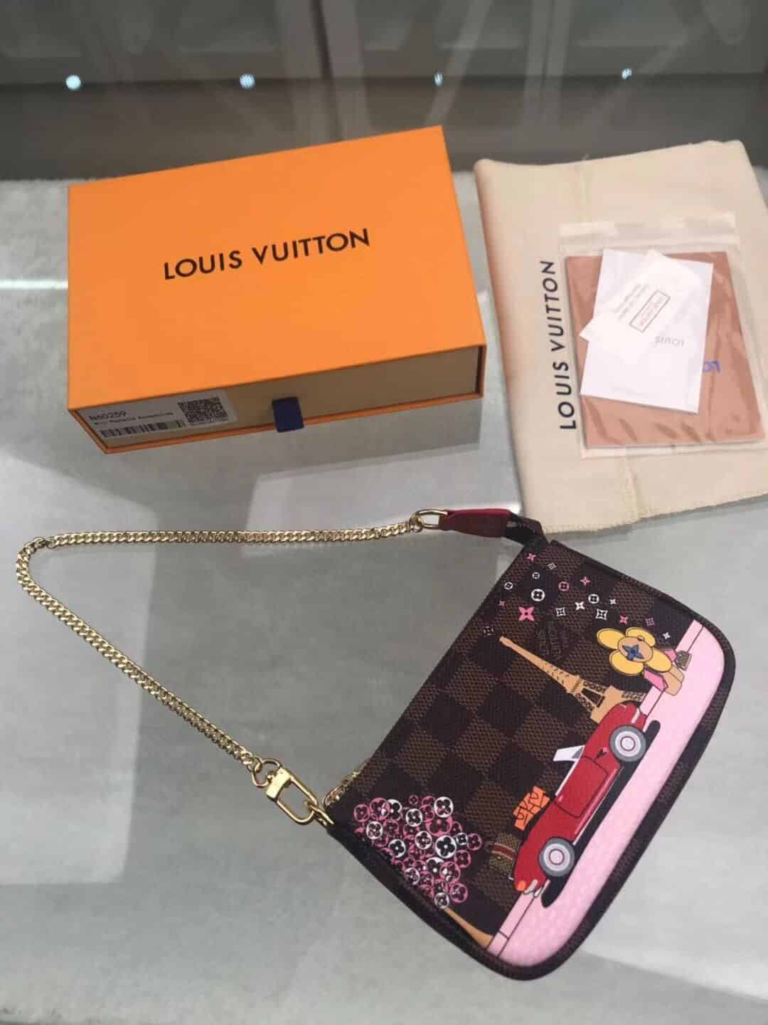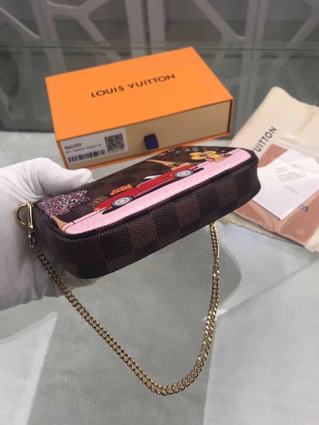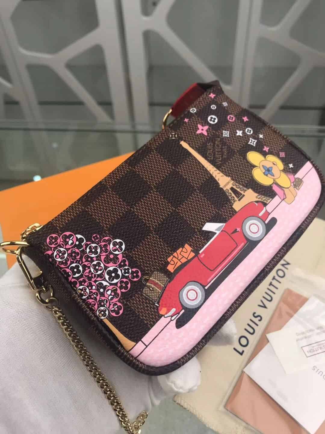 Mini Pochette Accessories 小手袋以经典 Damier 帆布为底,在绚烂色彩与盎然趣意中演绎吉祥物 Vivienne 与巴黎埃菲尔铁塔,致意路易威登的旅行传承。