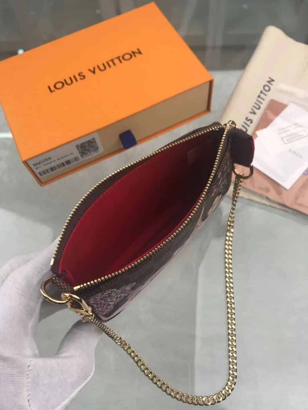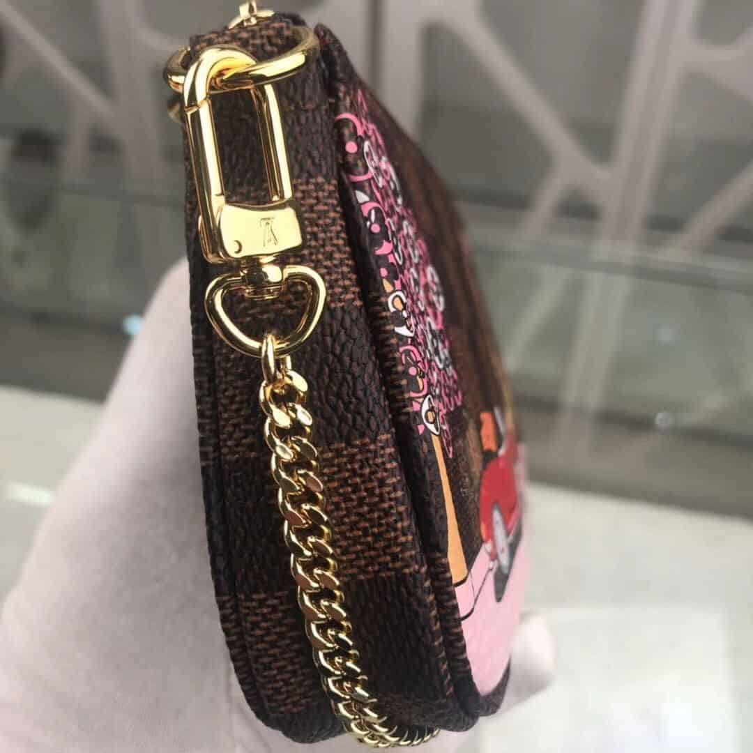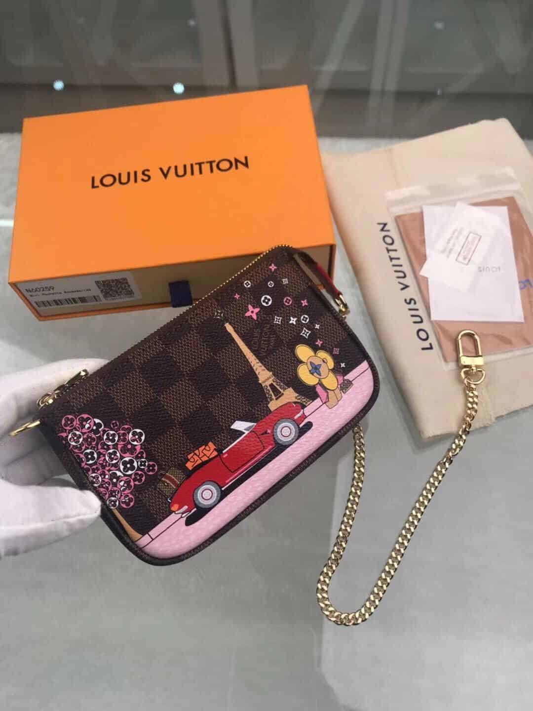 Mini Pochette Accessories 小手袋以经典 Damier 帆布为底,在绚烂色彩与盎然趣意中演绎吉祥物 Vivienne 与巴黎埃菲尔铁塔,致意路易威登的旅行传承。
