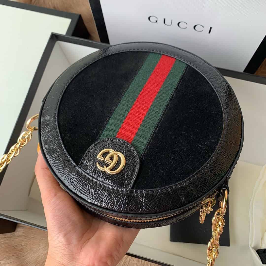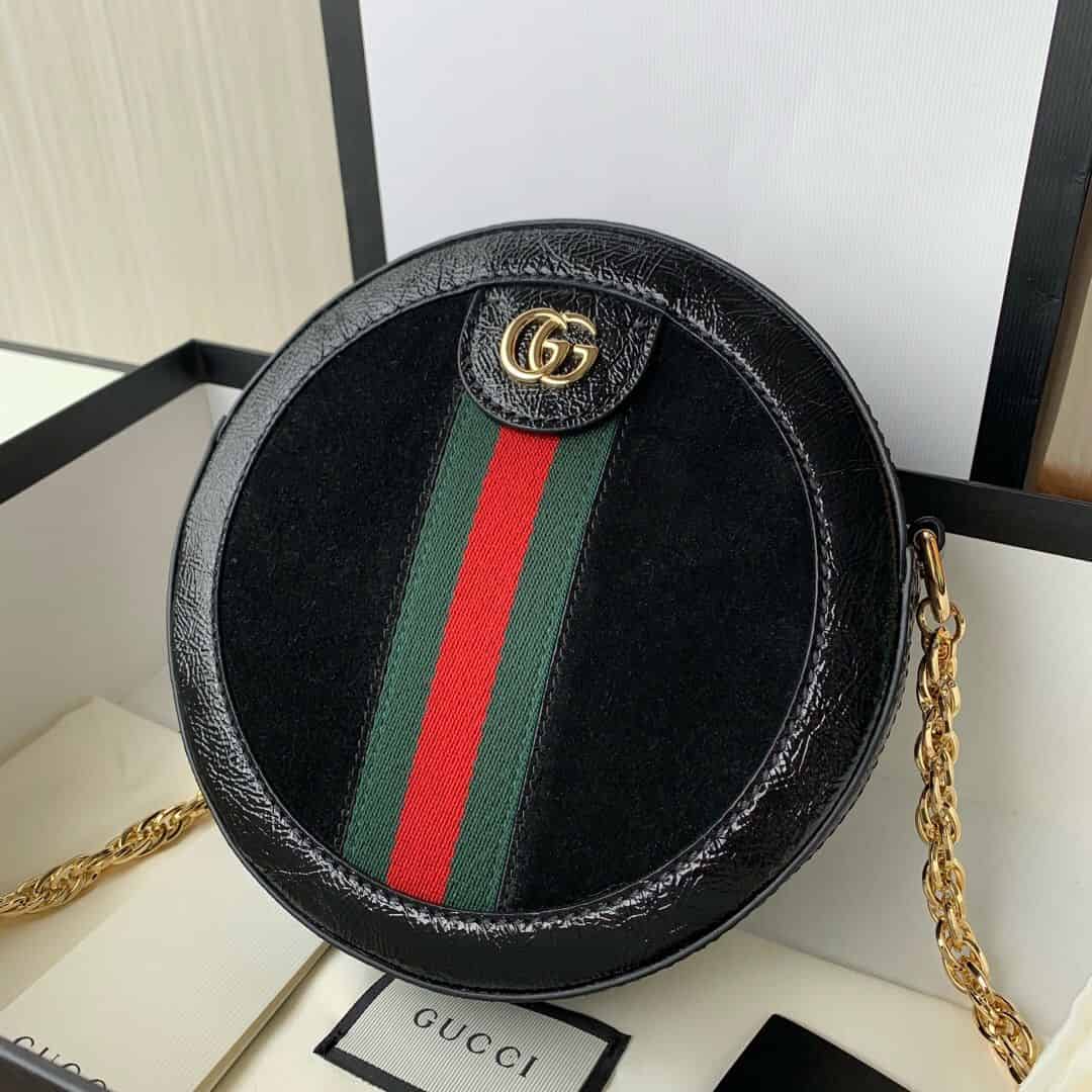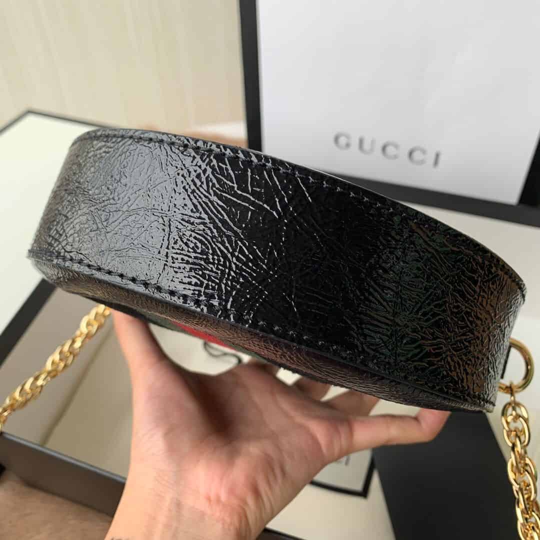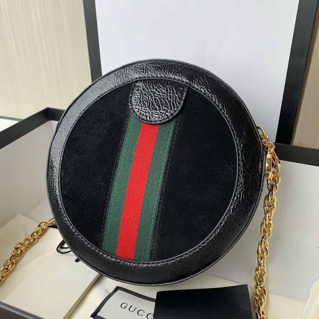 Ophidia系列迎来圆形迷你手袋这一新成员,配以链式肩带。采用黑色麂皮和漆皮制作,镶嵌红绿条纹织带,小巧玲珑的双G图案是源自70年代的Gucci典藏设计,装饰包身上的饰片细节和拉链头。
