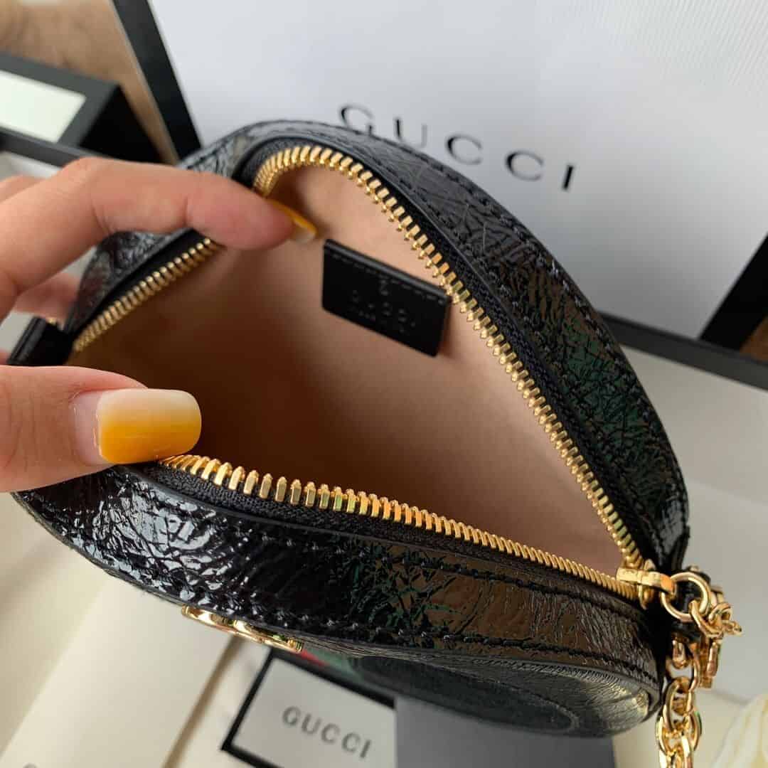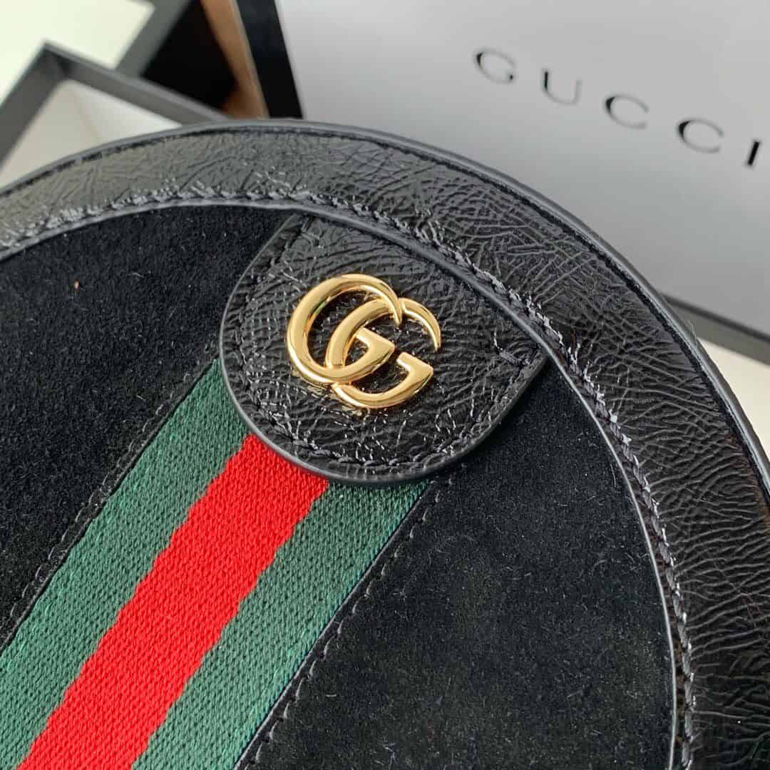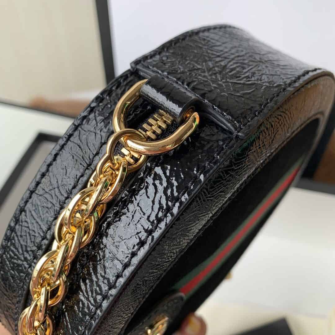 Ophidia系列迎来圆形迷你手袋这一新成员,配以链式肩带。采用黑色麂皮和漆皮制作,镶嵌红绿条纹织带,小巧玲珑的双G图案是源自70年代的Gucci典藏设计,装饰包身上的饰片细节和拉链头。