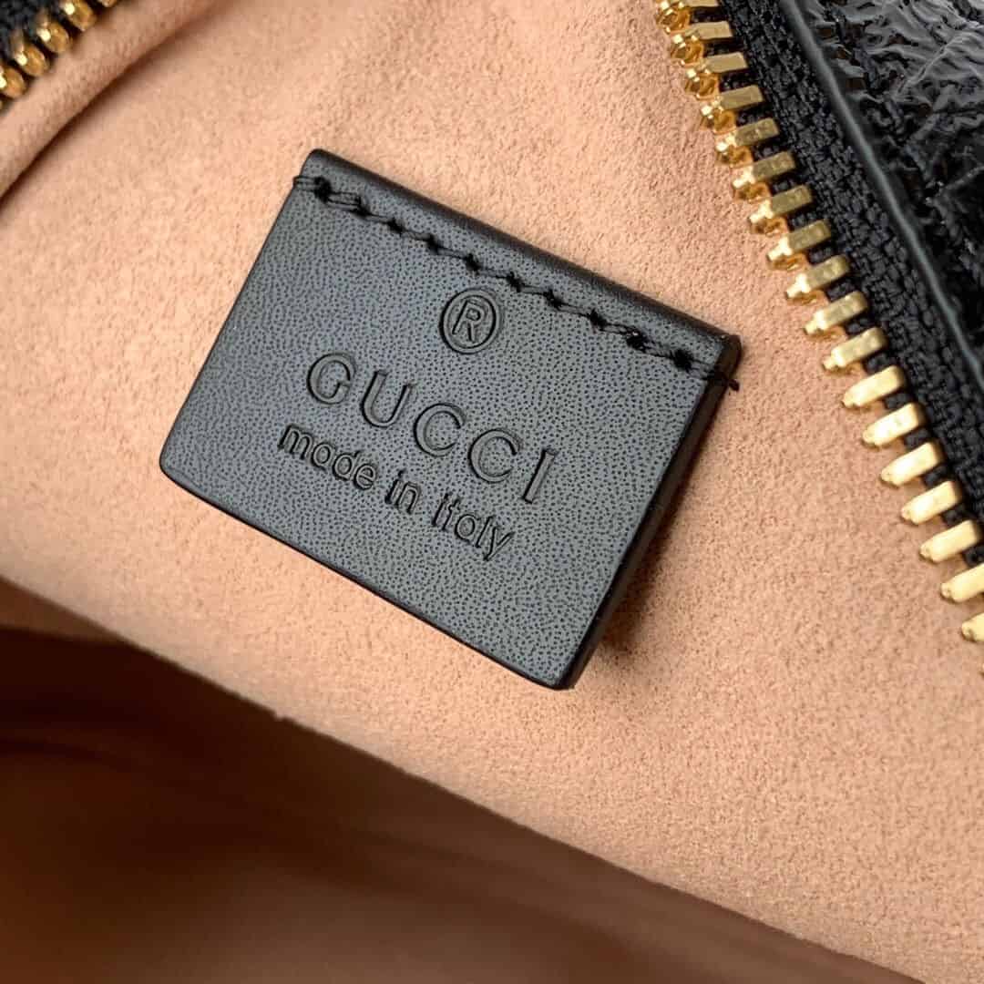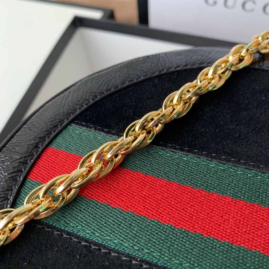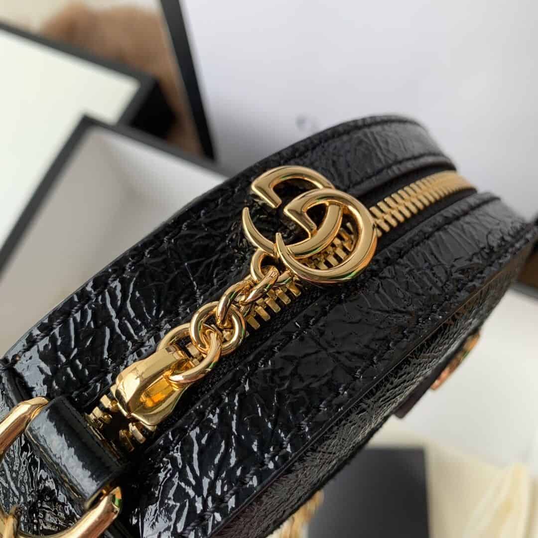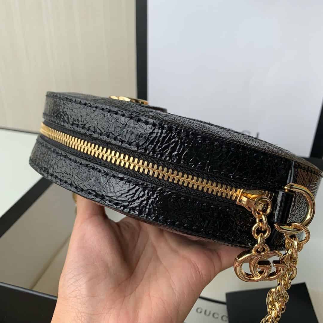 Ophidia系列迎来圆形迷你手袋这一新成员,配以链式肩带。采用黑色麂皮和漆皮制作,镶嵌红绿条纹织带,小巧玲珑的双G图案是源自70年代的Gucci典藏设计,装饰包身上的饰片细节和拉链头。