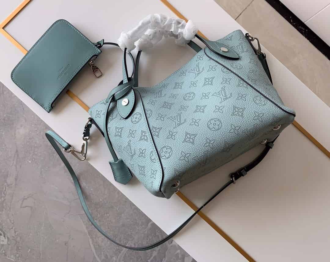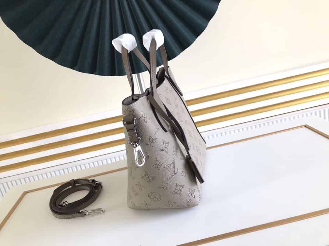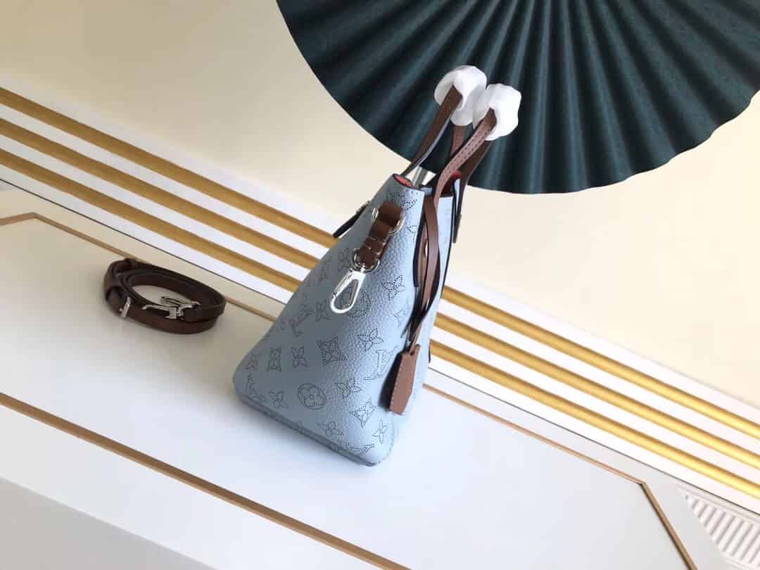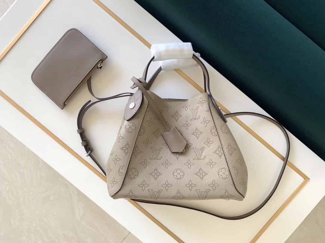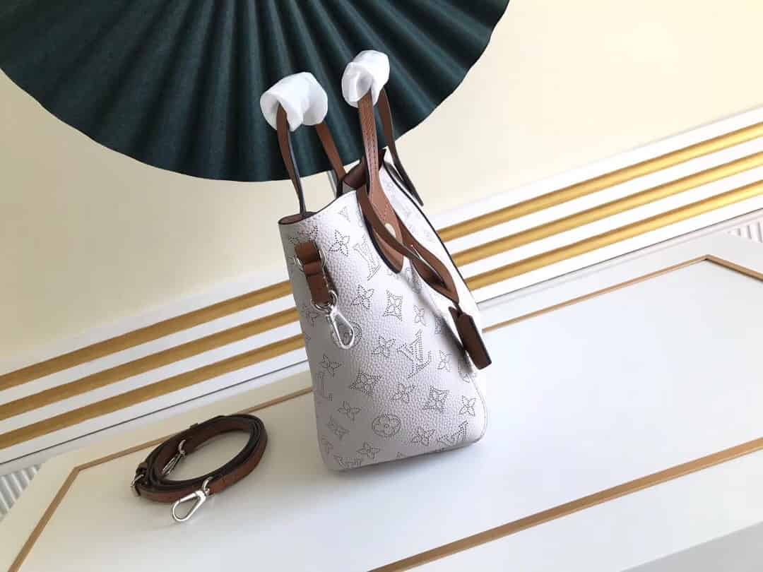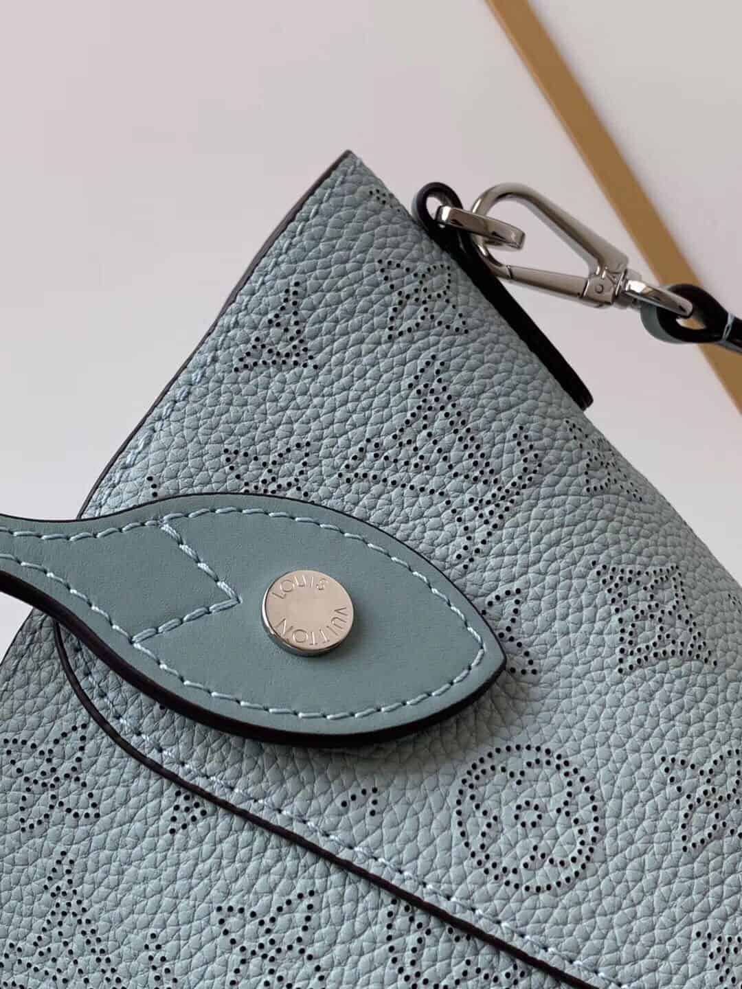 一只 Hina 小号手袋,两式设计:双侧收紧,呈现潮流水桶包;双侧展开,化身闲适 Tote 包。镂花穿孔小牛皮与小牛皮饰边造就轻盈构型,两只顶部手柄与可拆卸肩带实现舒适背携体验。