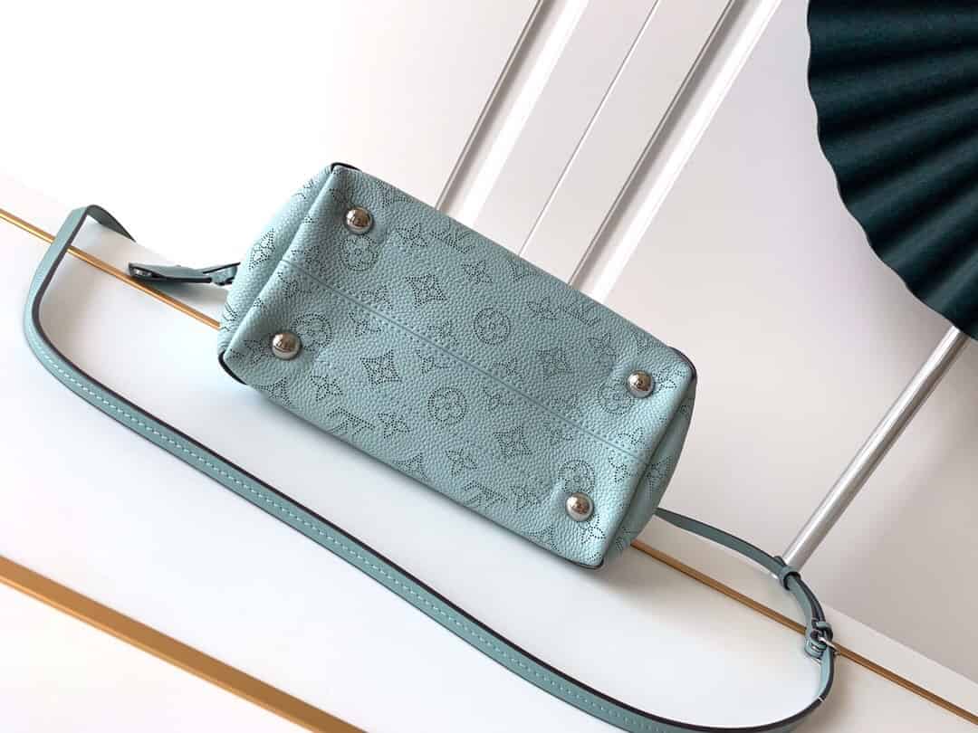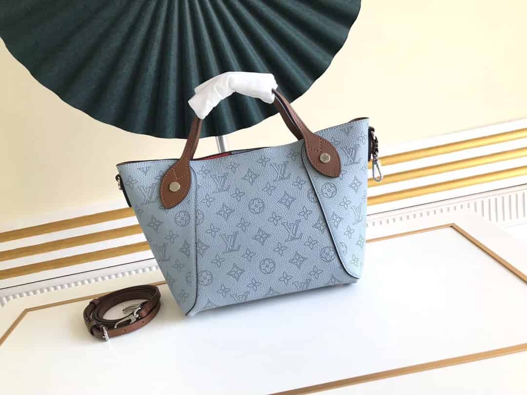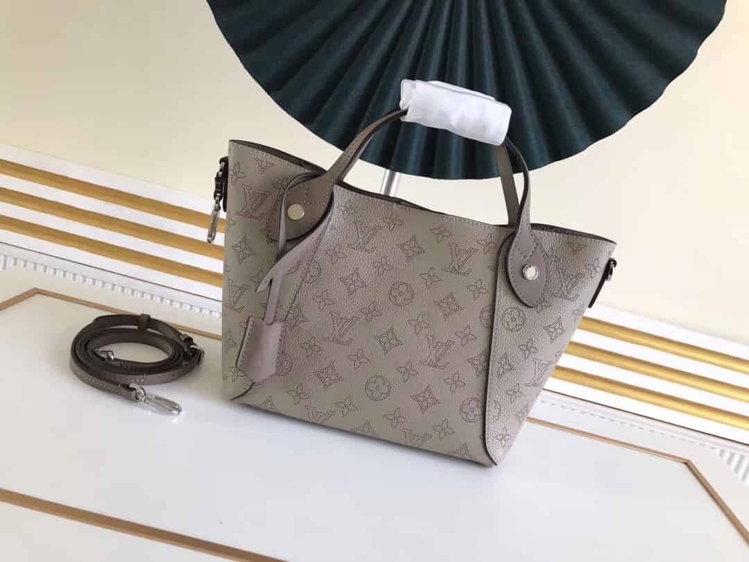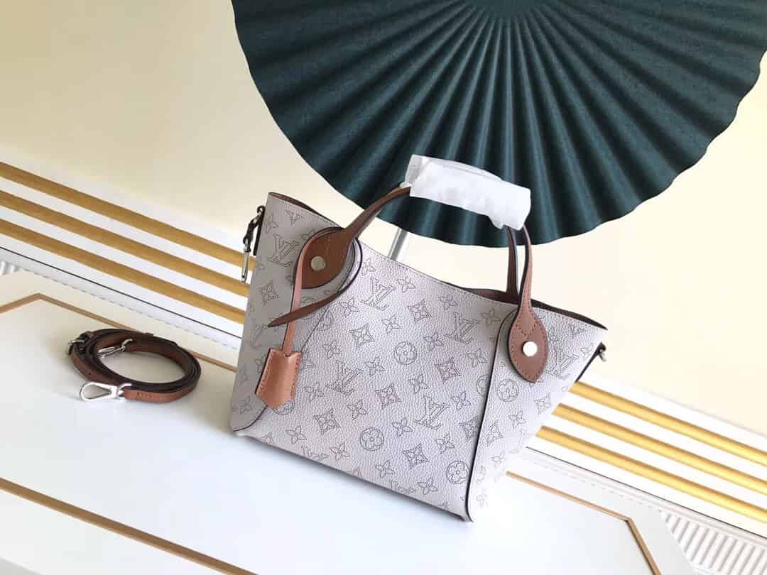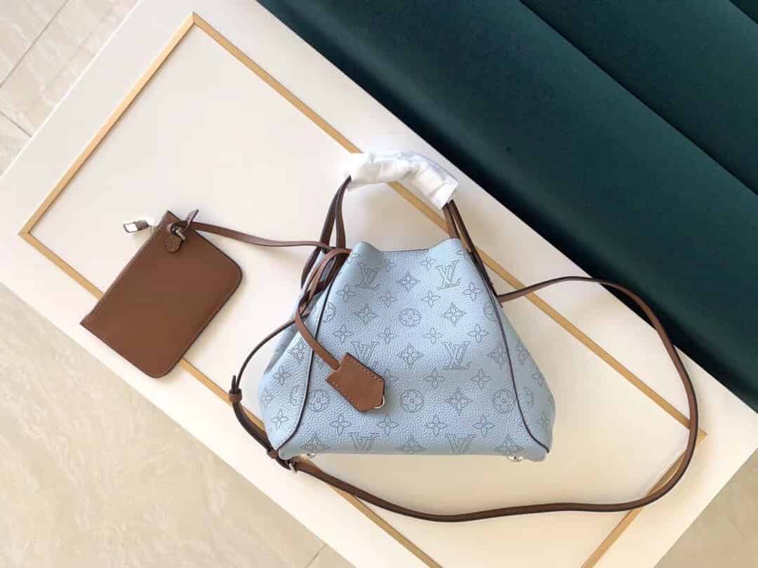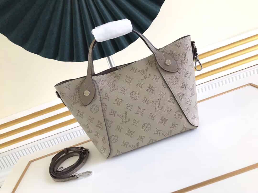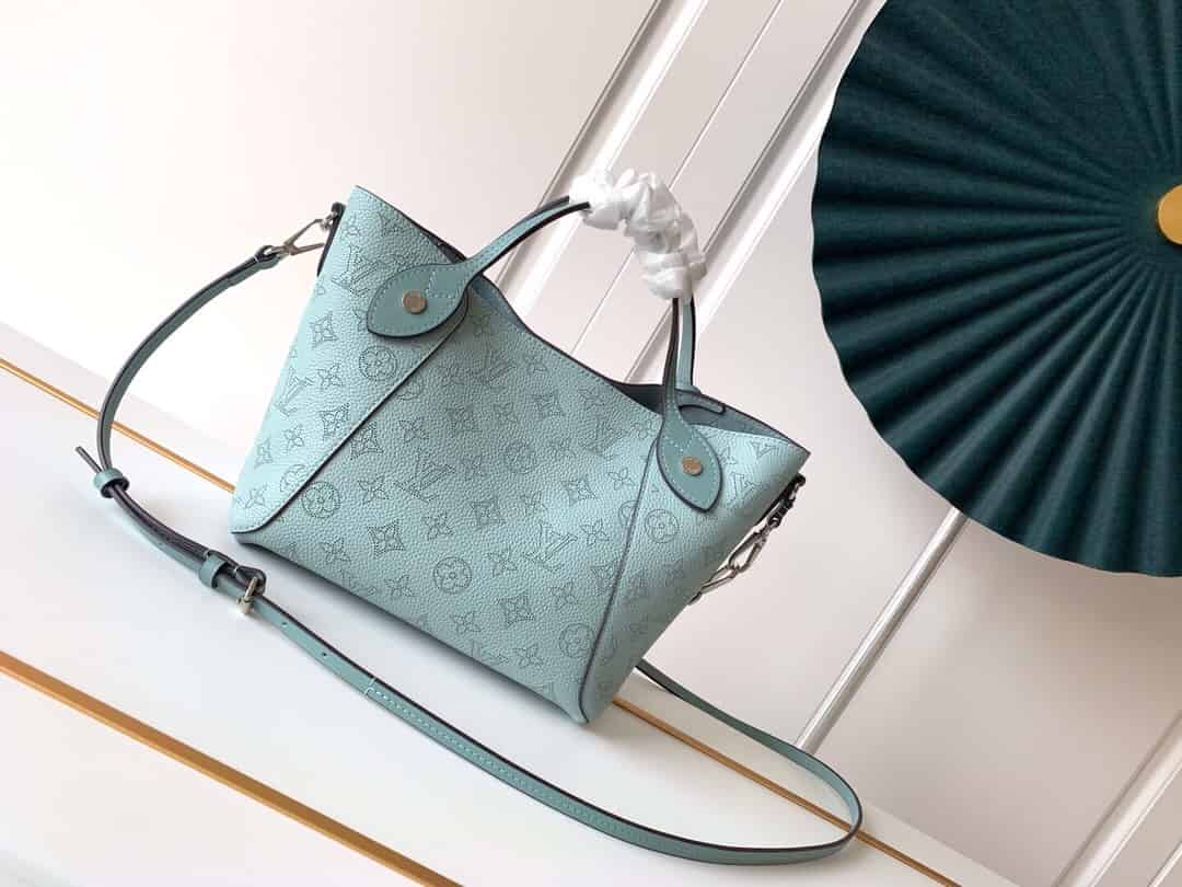 一只 Hina 小号手袋,两式设计:双侧收紧,呈现潮流水桶包;双侧展开,化身闲适 Tote 包。镂花穿孔小牛皮与小牛皮饰边造就轻盈构型,两只顶部手柄与可拆卸肩带实现舒适背携体验。