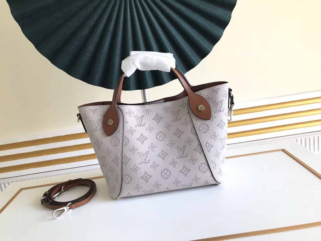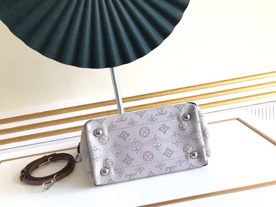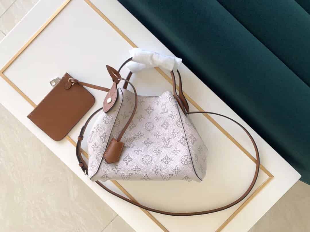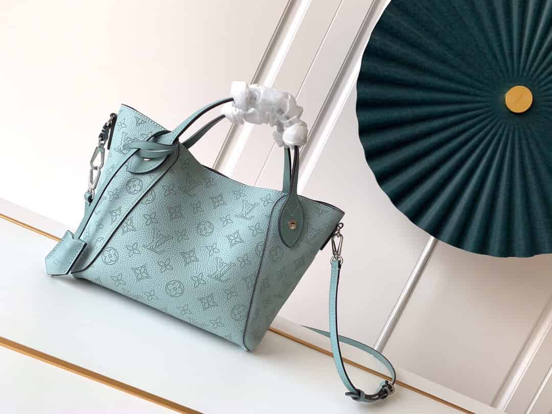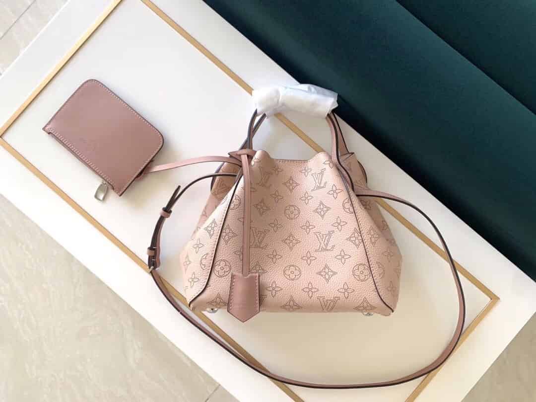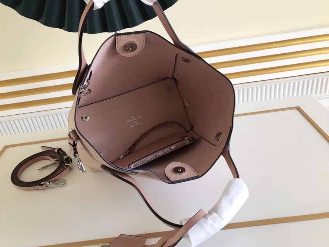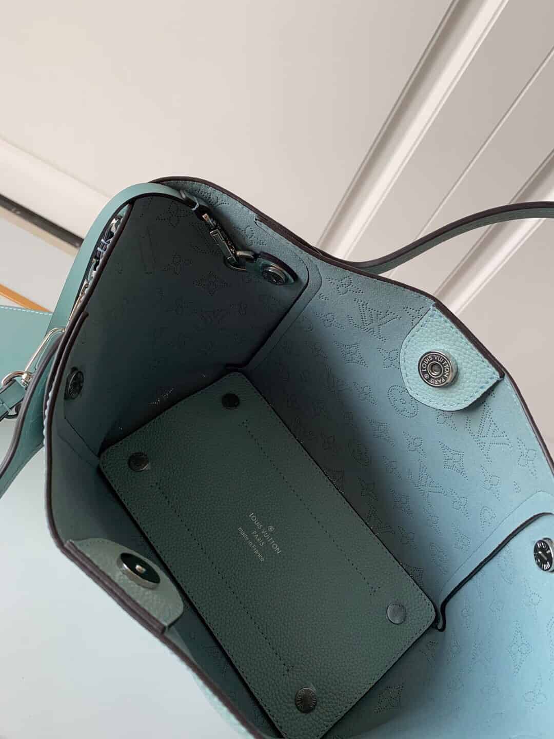 一只 Hina 小号手袋,两式设计:双侧收紧,呈现潮流水桶包;双侧展开,化身闲适 Tote 包。镂花穿孔小牛皮与小牛皮饰边造就轻盈构型,两只顶部手柄与可拆卸肩带实现舒适背携体验。