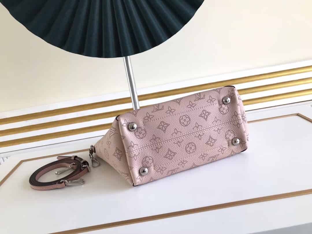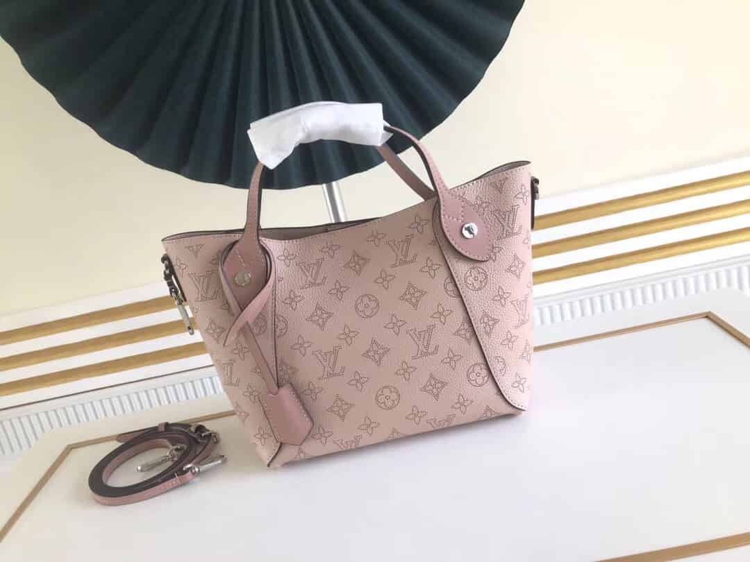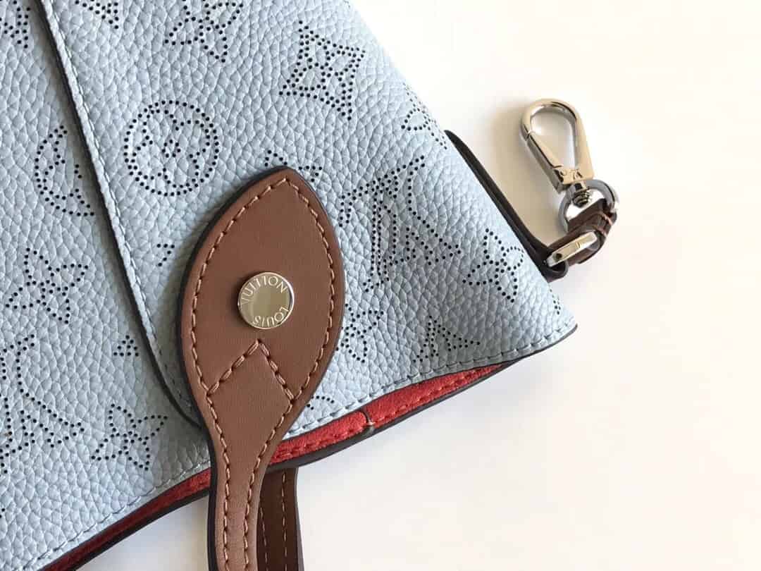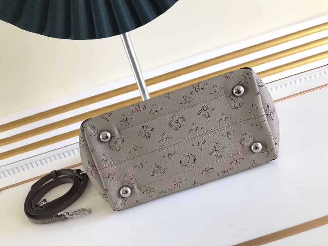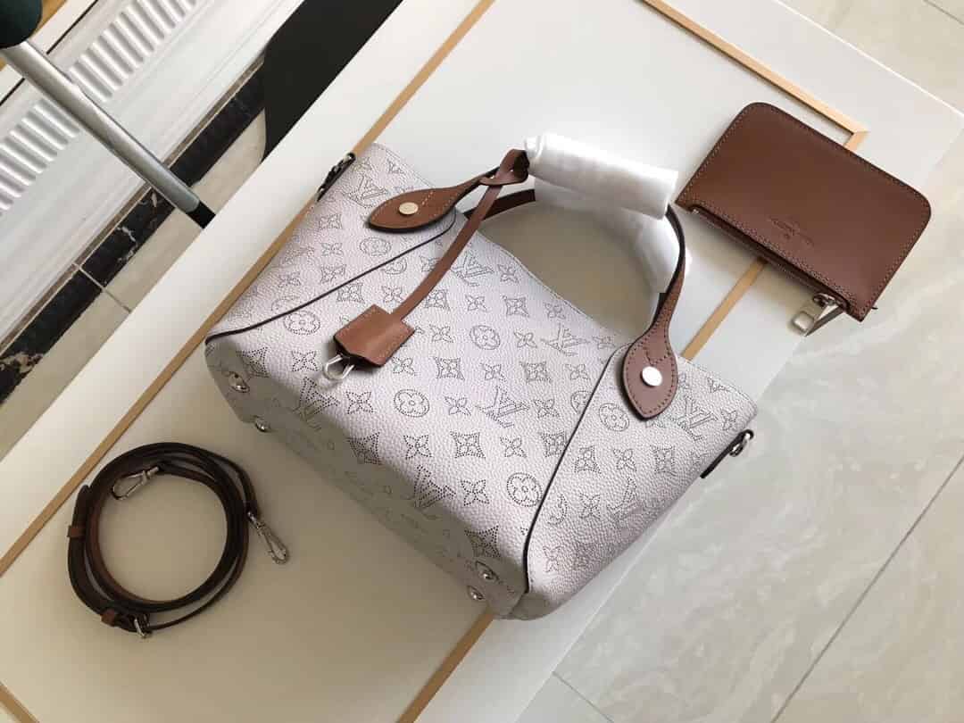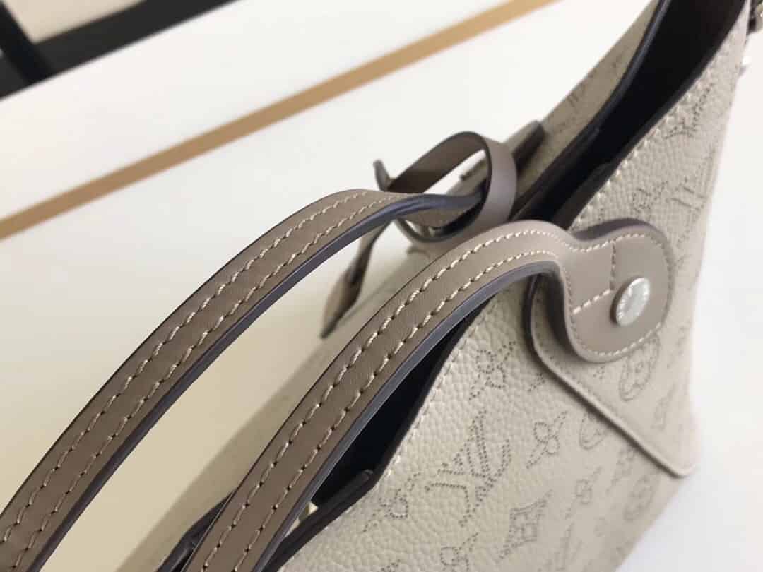 一只 Hina 小号手袋,两式设计:双侧收紧,呈现潮流水桶包;双侧展开,化身闲适 Tote 包。镂花穿孔小牛皮与小牛皮饰边造就轻盈构型,两只顶部手柄与可拆卸肩带实现舒适背携体验。