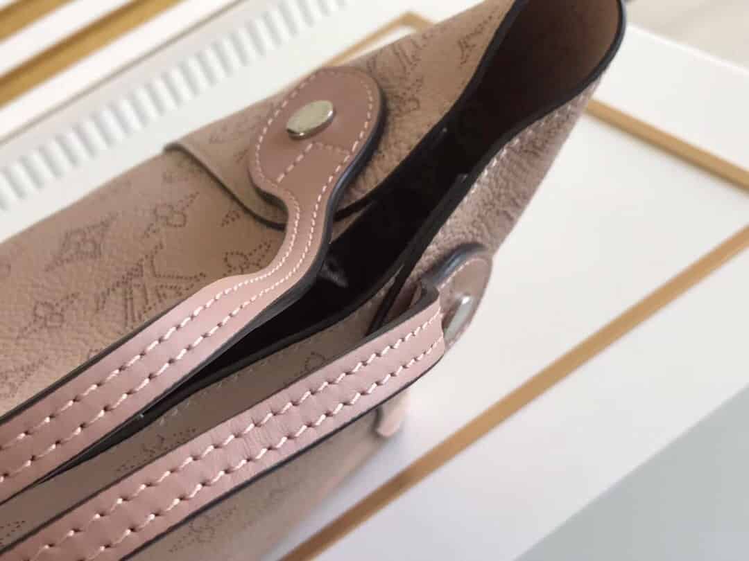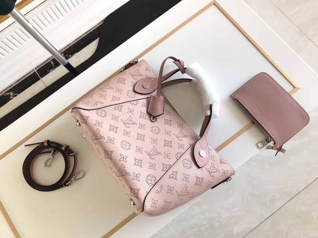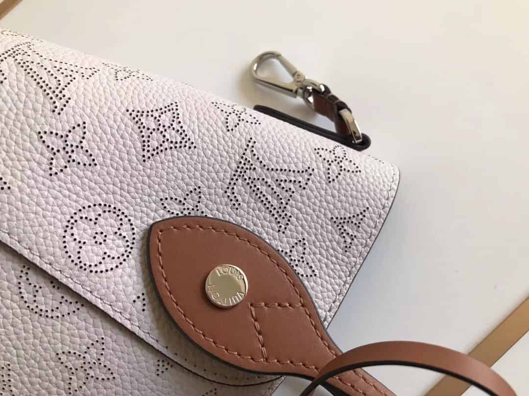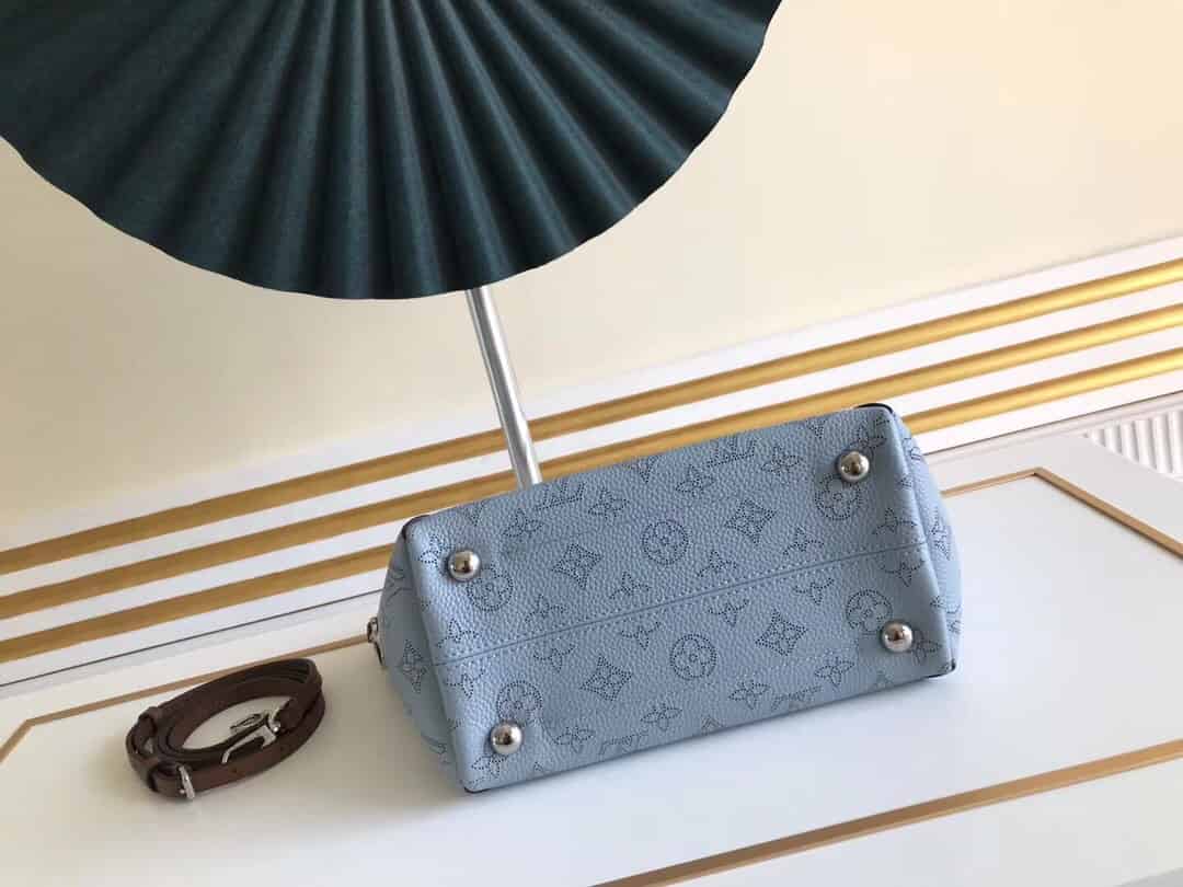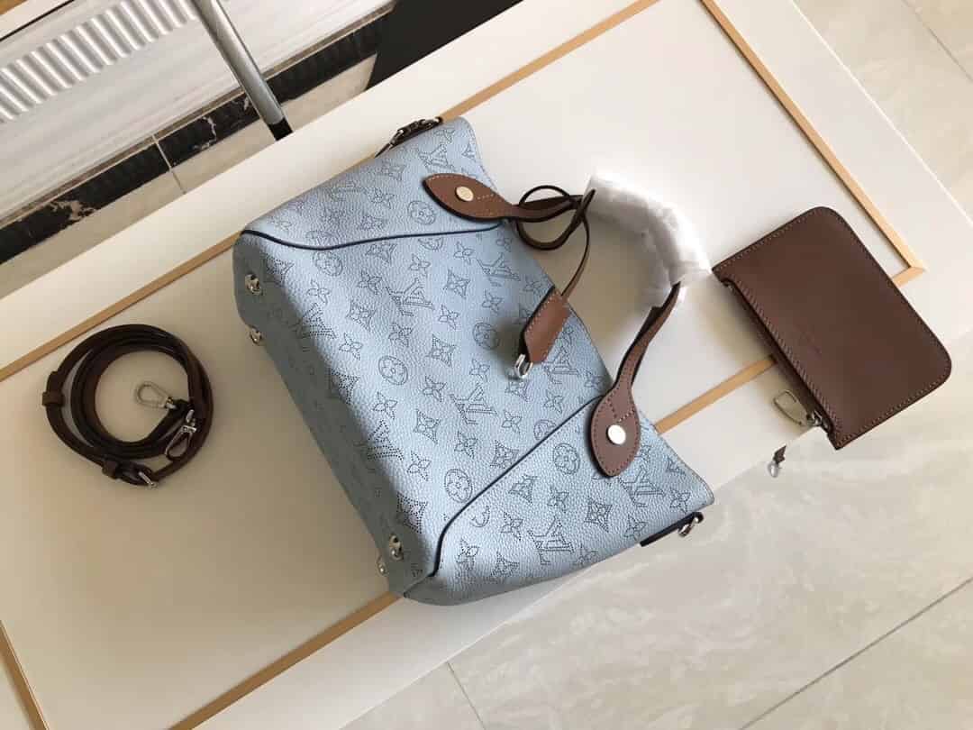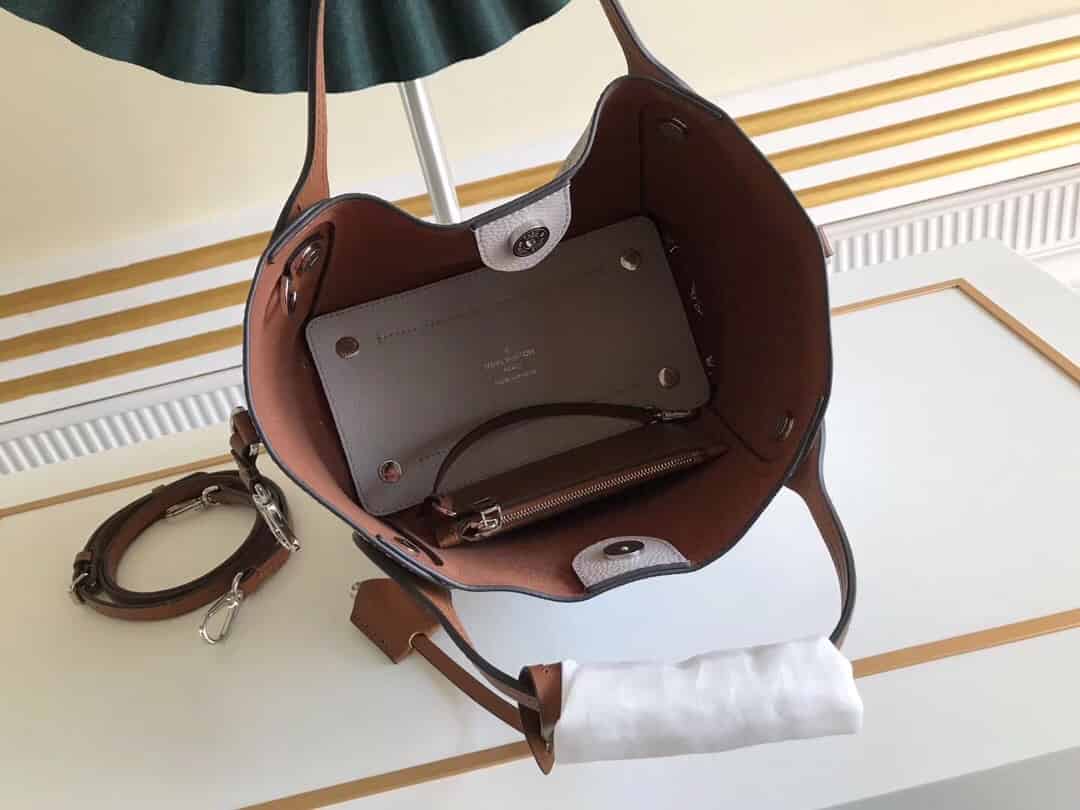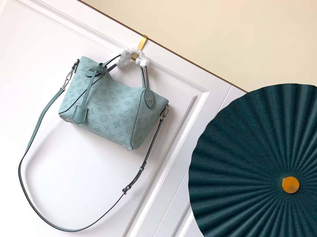 一只 Hina 小号手袋,两式设计:双侧收紧,呈现潮流水桶包;双侧展开,化身闲适 Tote 包。镂花穿孔小牛皮与小牛皮饰边造就轻盈构型,两只顶部手柄与可拆卸肩带实现舒适背携体验。