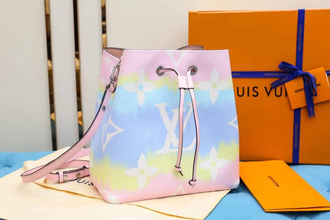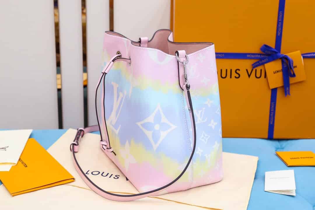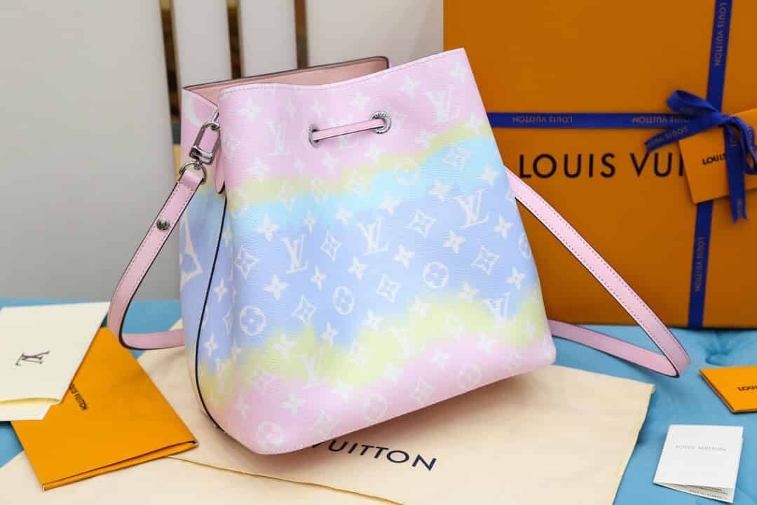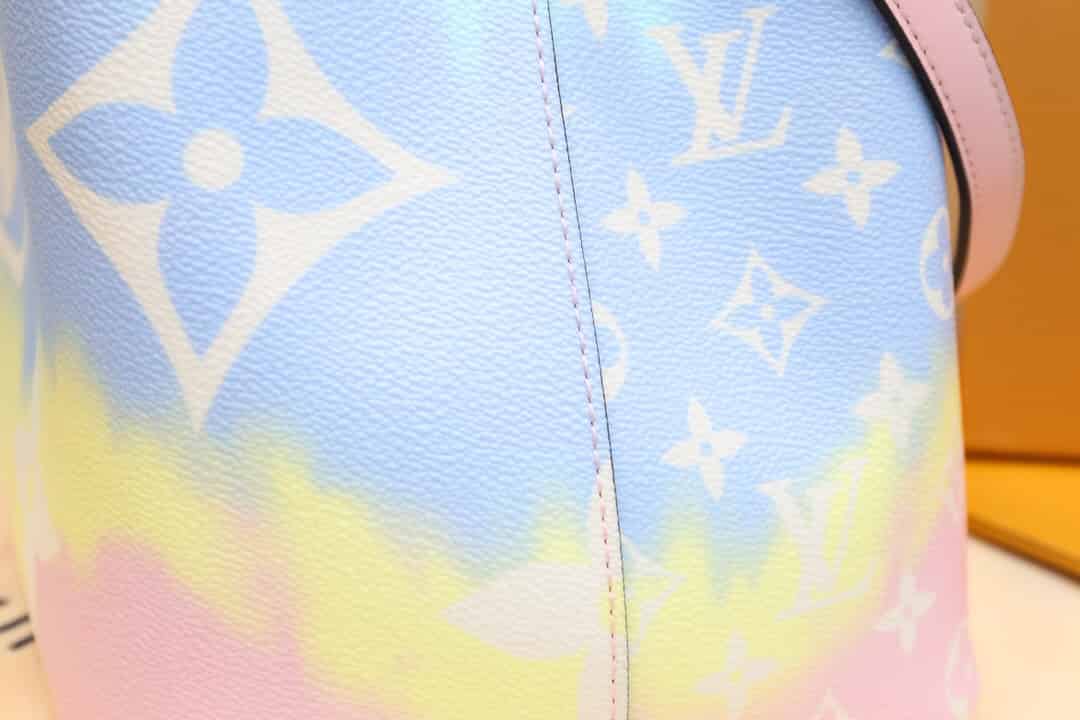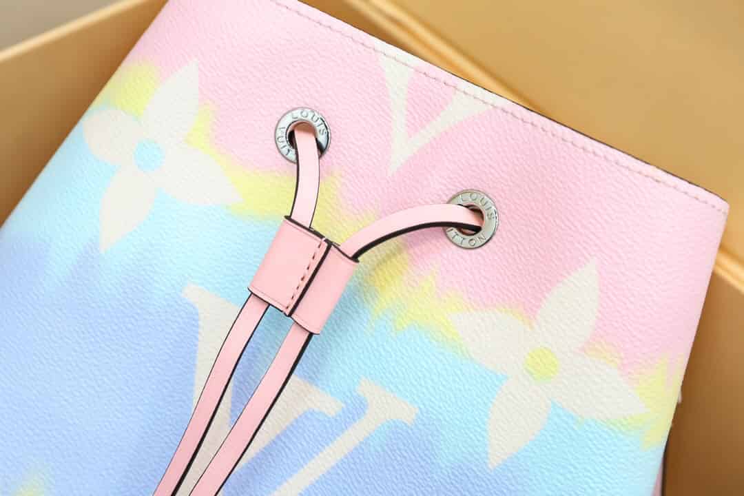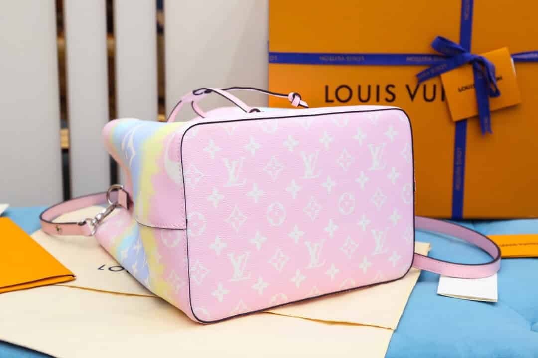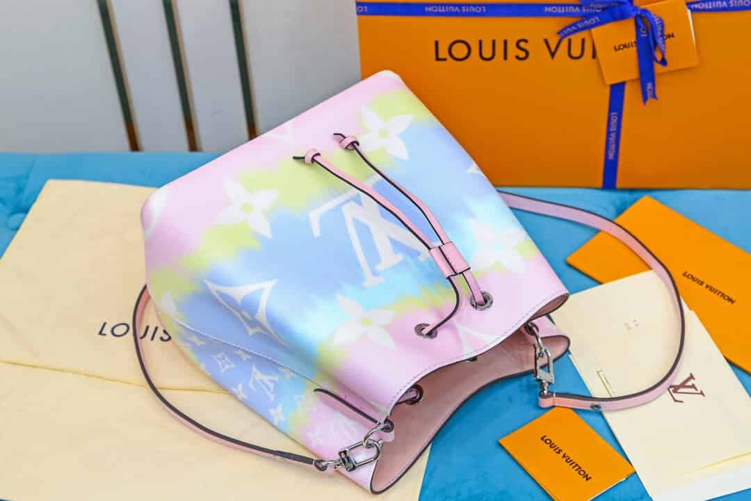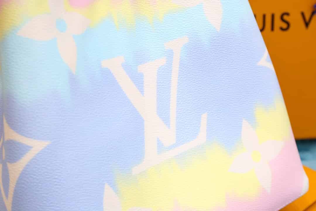 LV Escale 系列 NéoNoé 水桶包取材扎染 Monogram 帆布,其别致图案源自绞染工艺中将面料打结后染色的传统手法,在 2020 春夏手袋、鞋履和成衣系列均有呈现。可拆卸肩带提供肩背或斜挎选择。