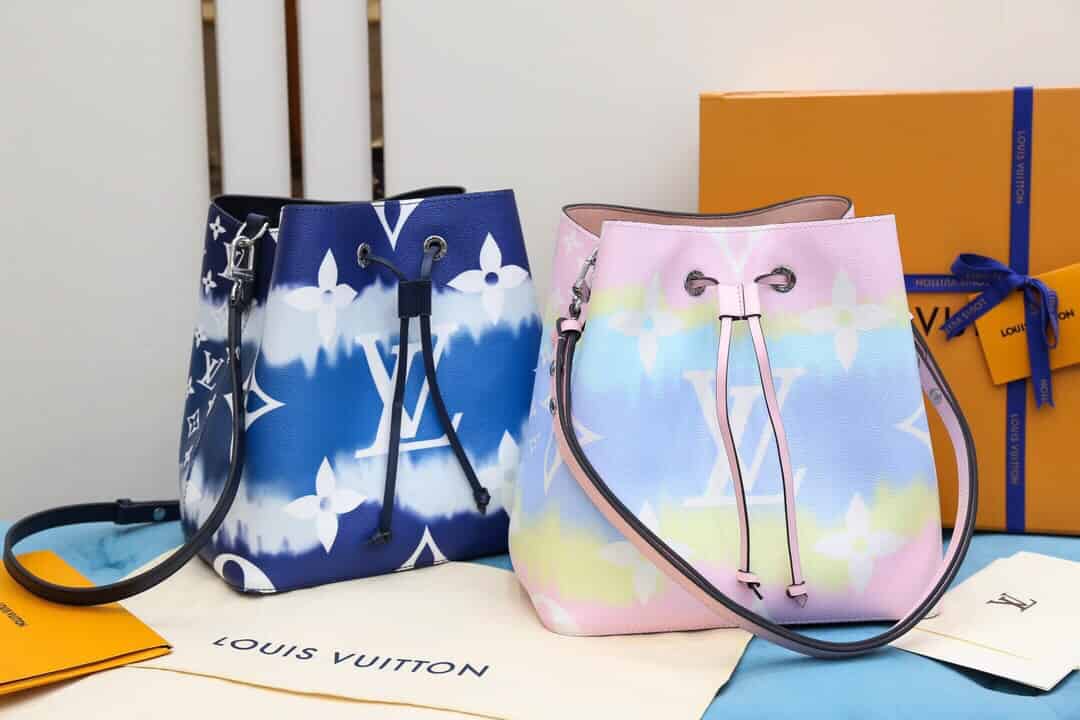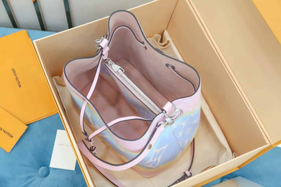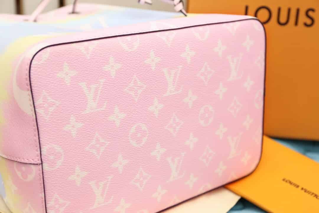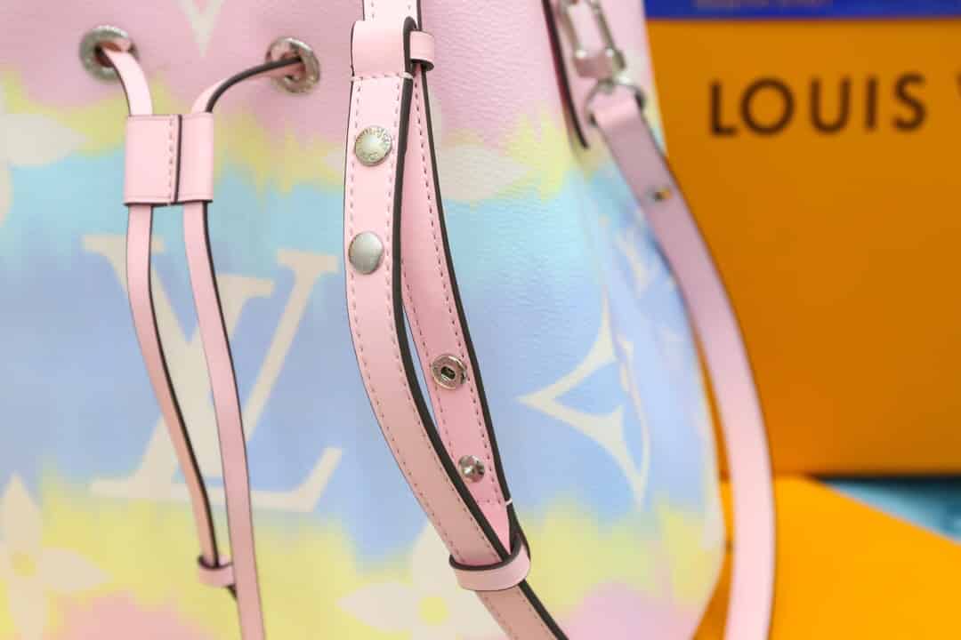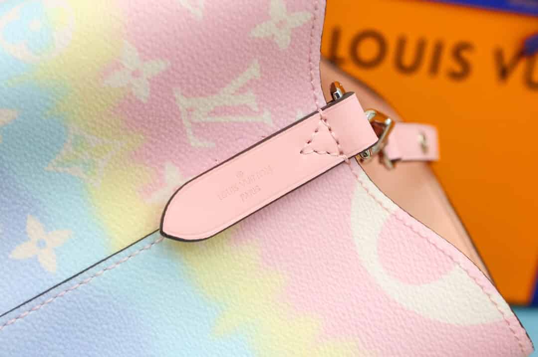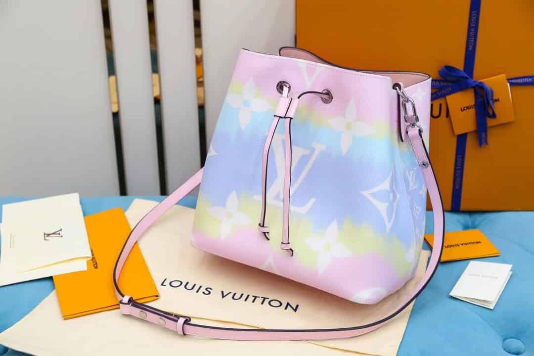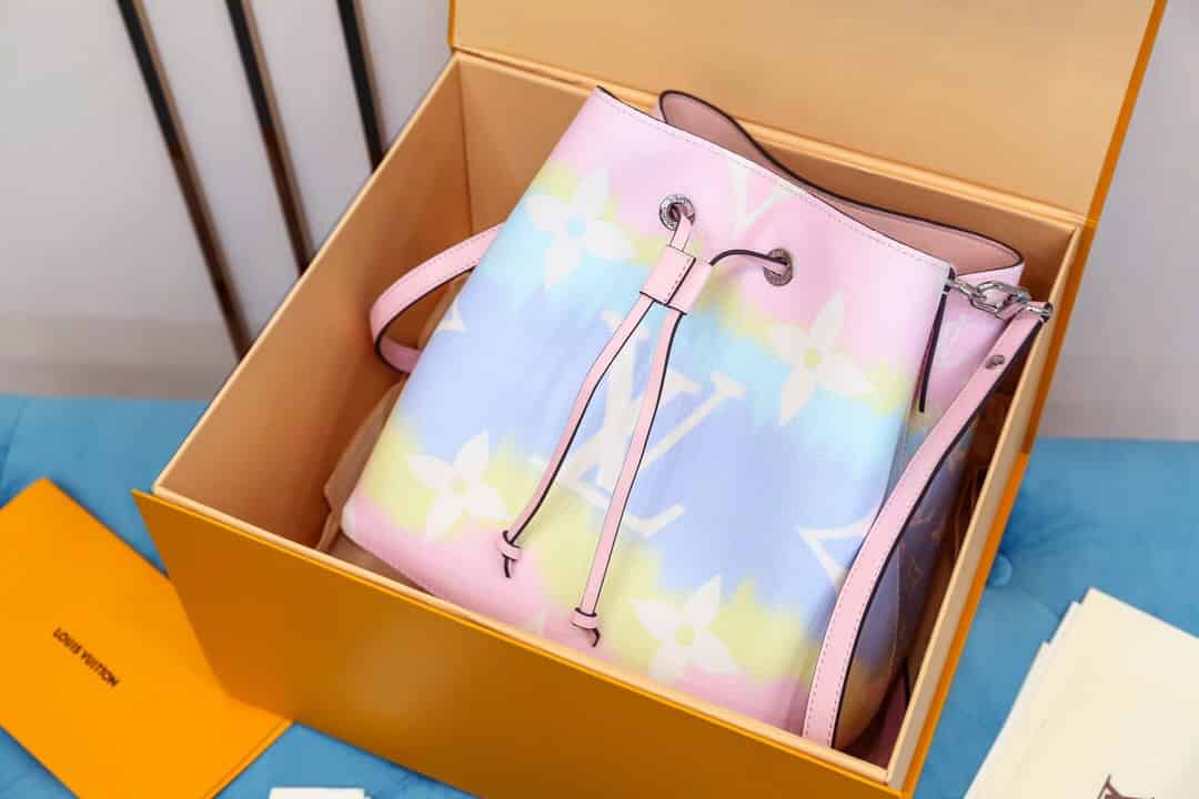 LV Escale 系列 NéoNoé 水桶包取材扎染 Monogram 帆布,其别致图案源自绞染工艺中将面料打结后染色的传统手法,在 2020 春夏手袋、鞋履和成衣系列均有呈现。可拆卸肩带提供肩背或斜挎选择。