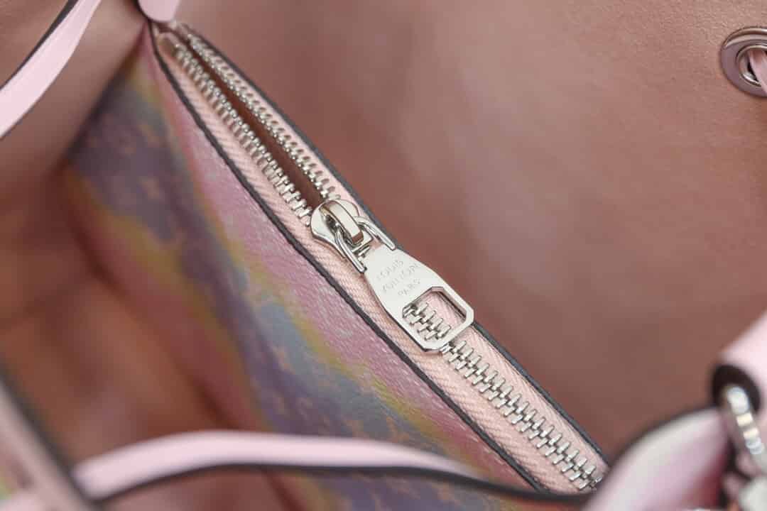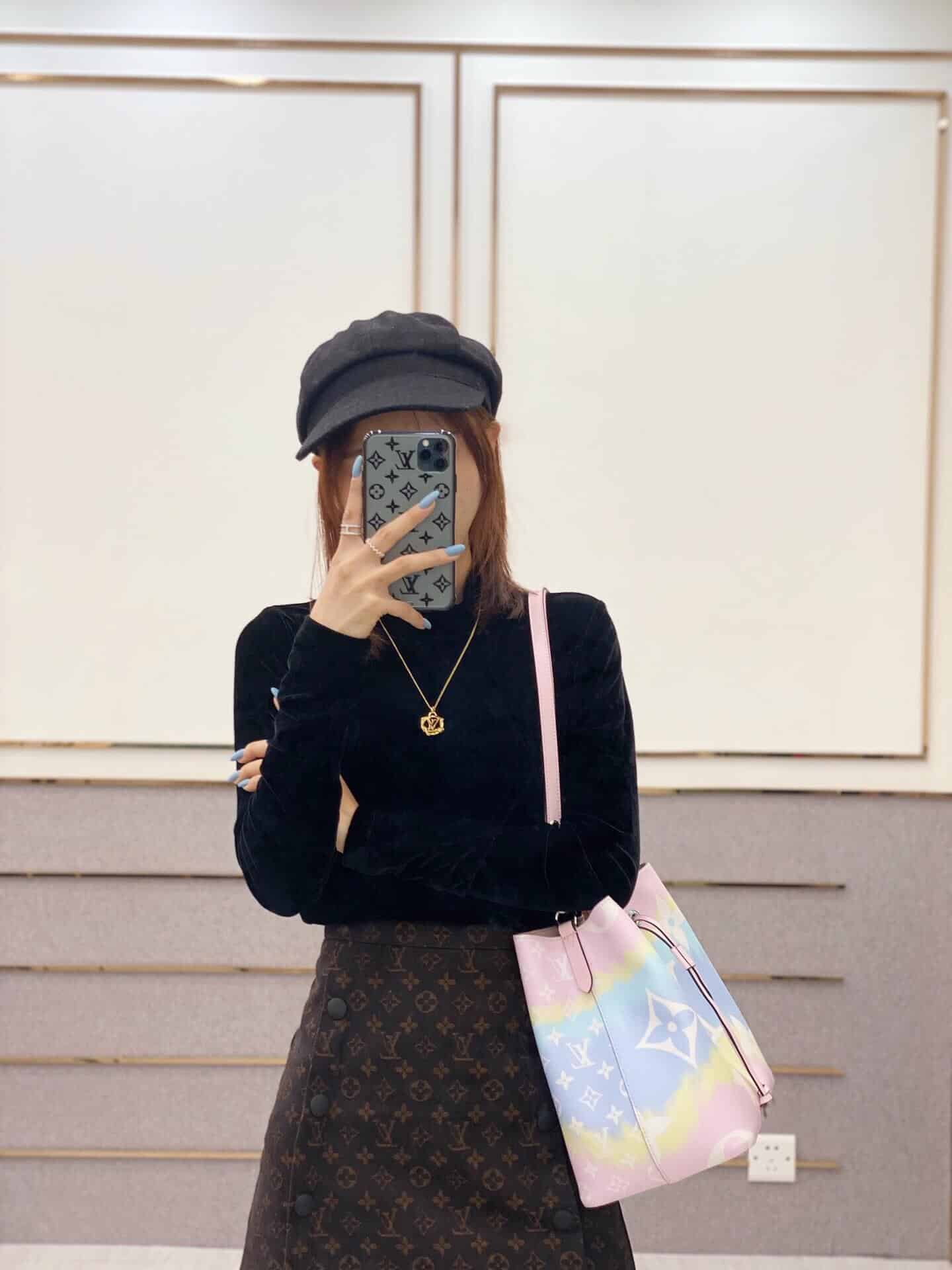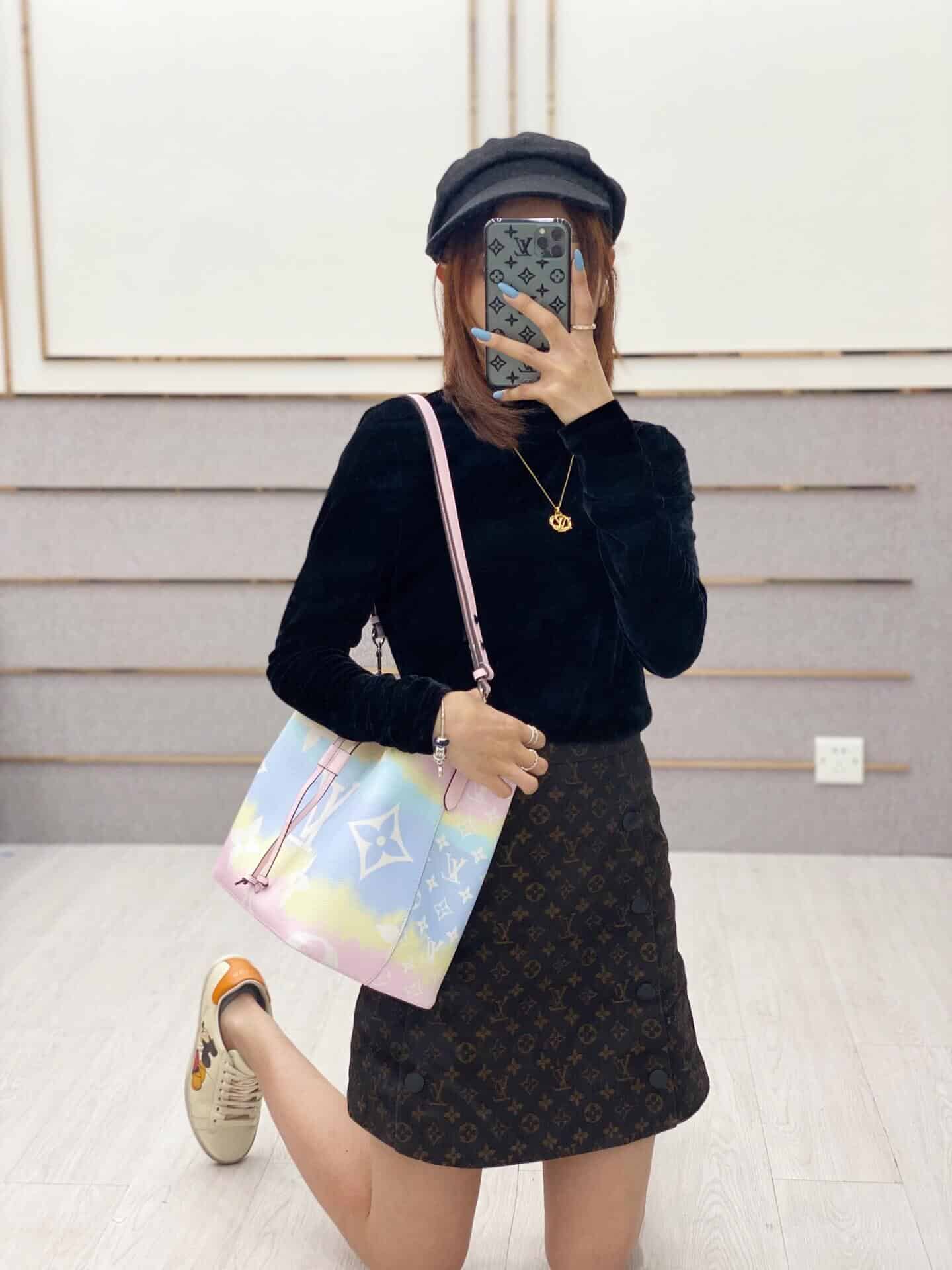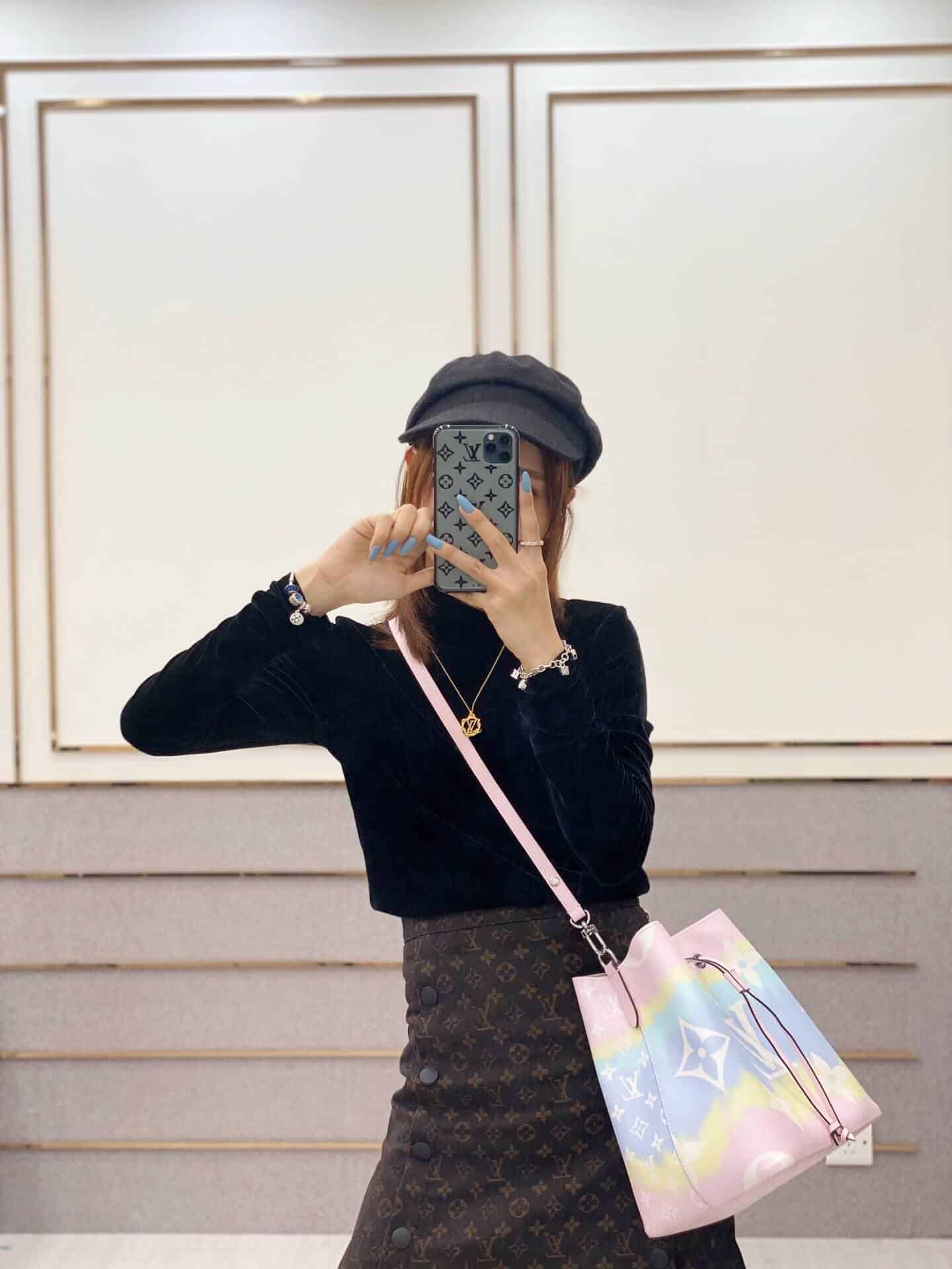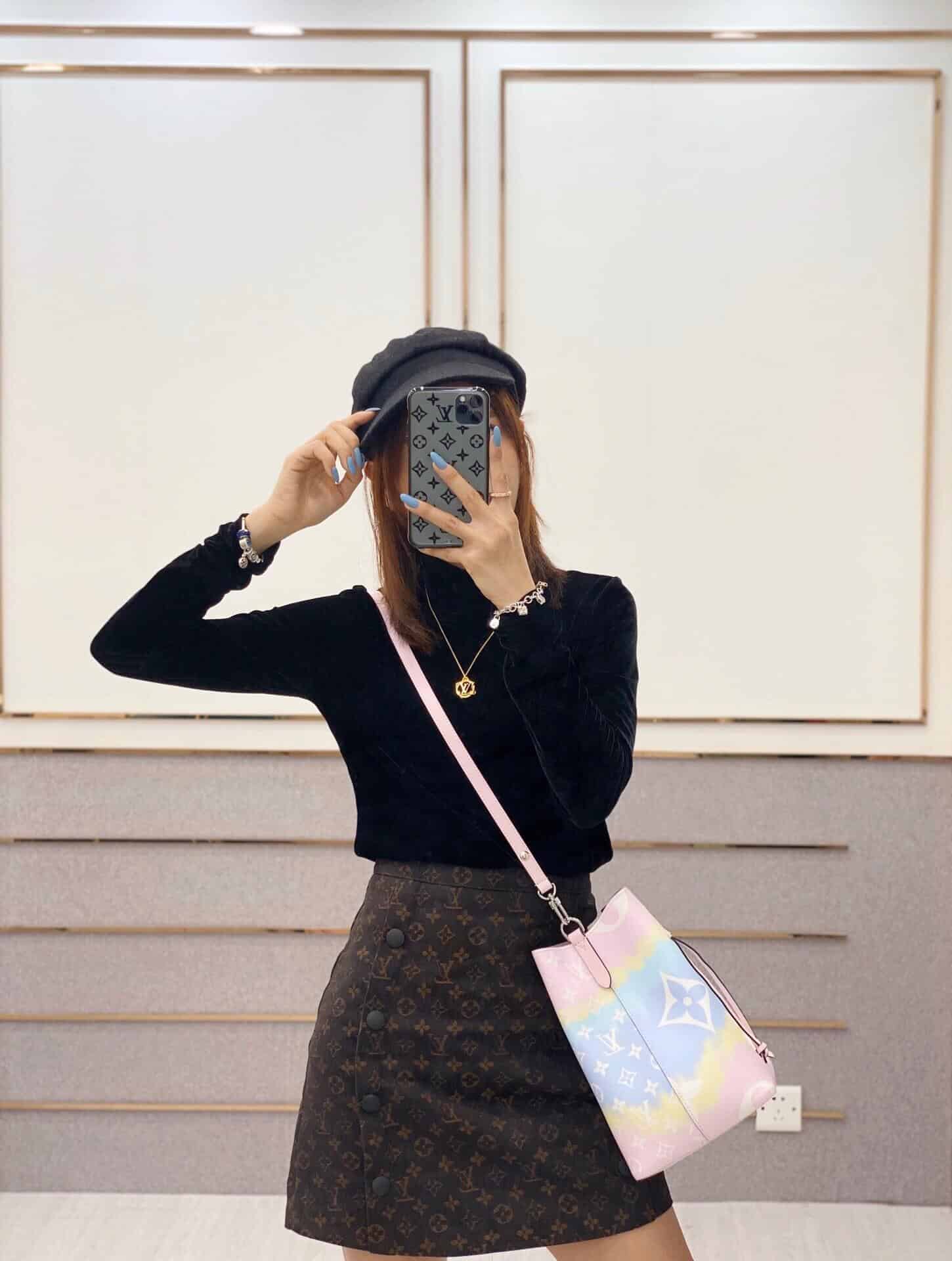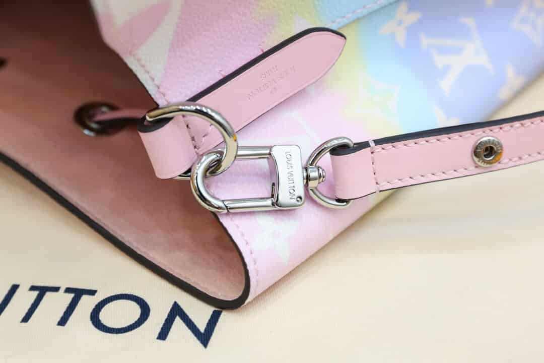 LV Escale 系列 NéoNoé 水桶包取材扎染 Monogram 帆布,其别致图案源自绞染工艺中将面料打结后染色的传统手法,在 2020 春夏手袋、鞋履和成衣系列均有呈现。可拆卸肩带提供肩背或斜挎选择。