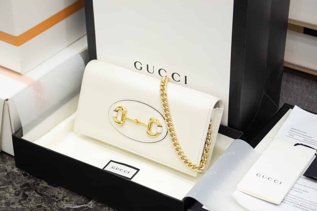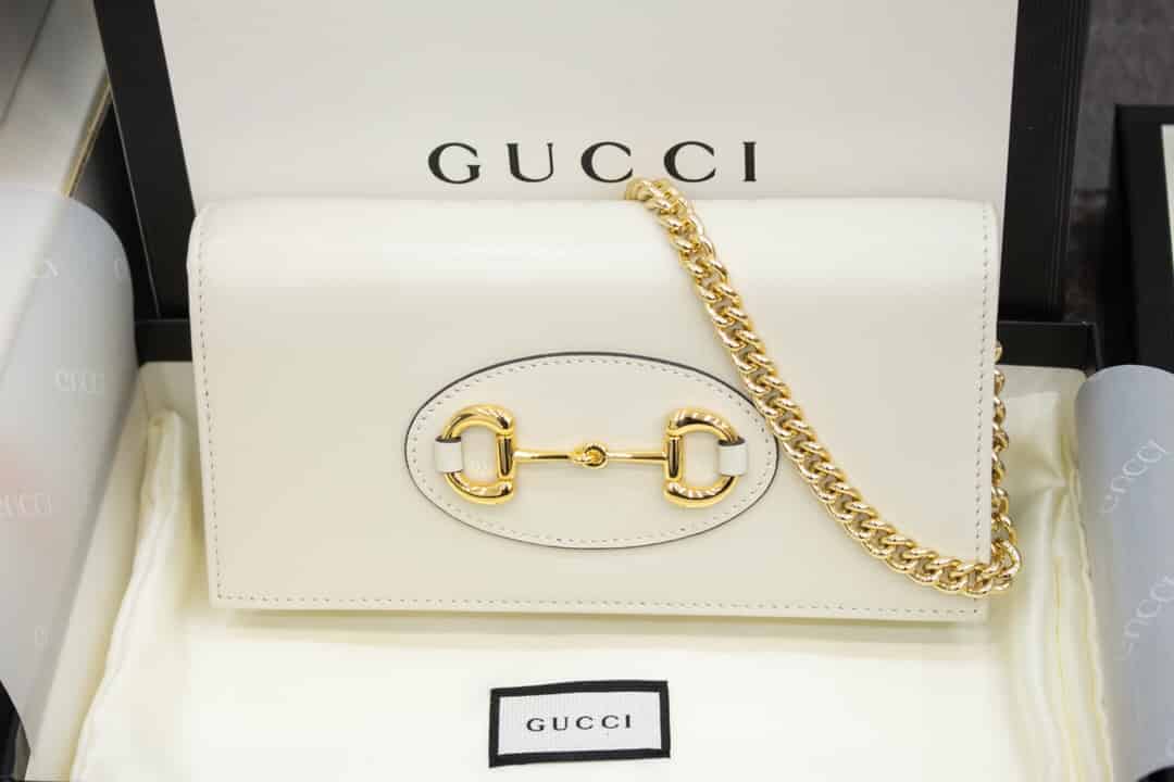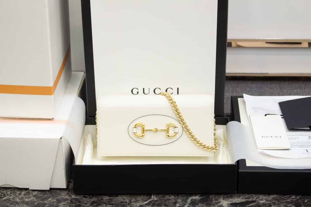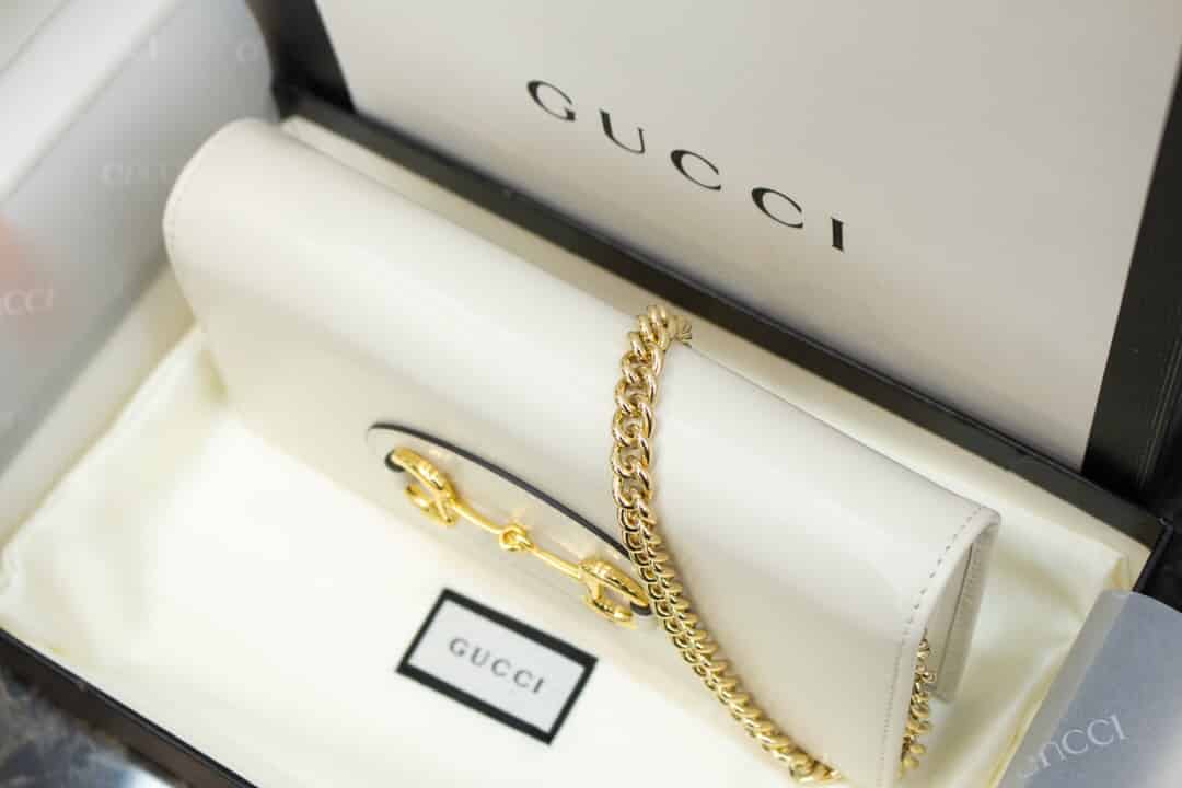 Gucci 1955马衔扣配饰系列再添力作,这款链带钱包采用白色皮革材质,匠心点缀与该系列手袋一脉相承的双环和长条形设计。经典的翻盖式按扣造型内配数个卡片隔层和口袋,可拆卸链带打造丰富的携带选择。