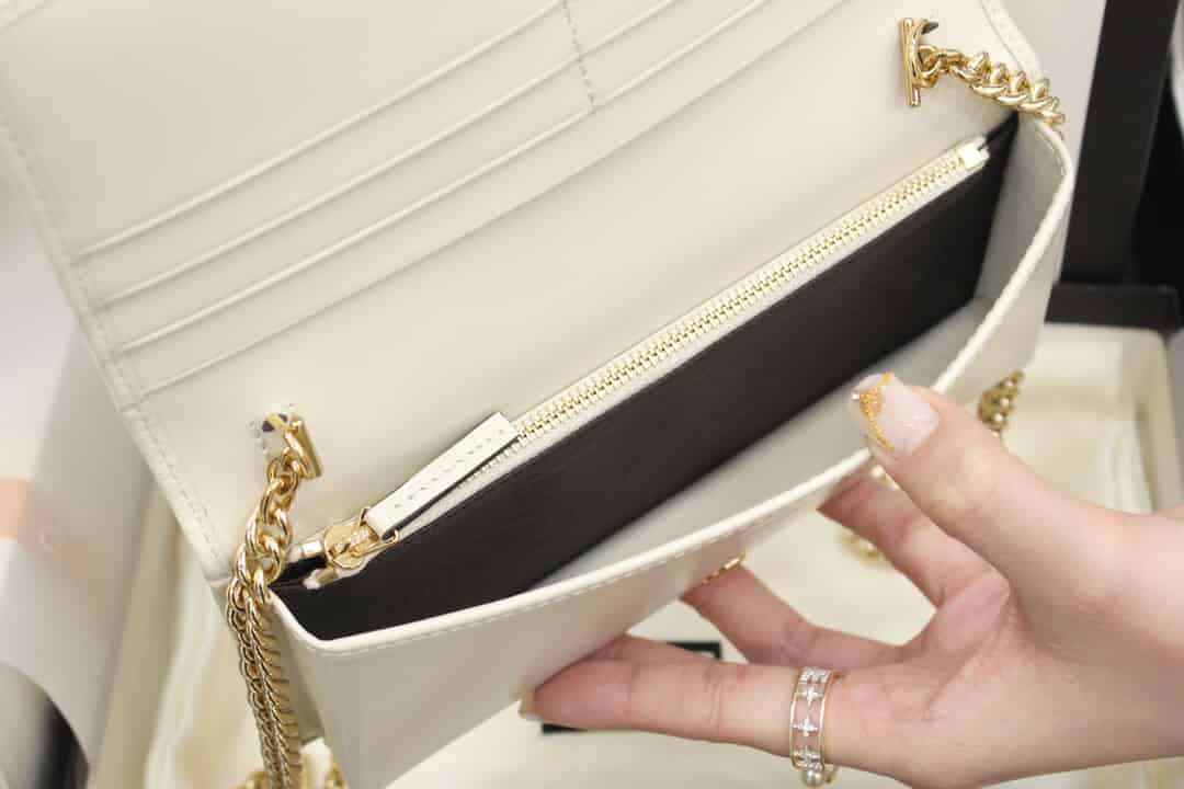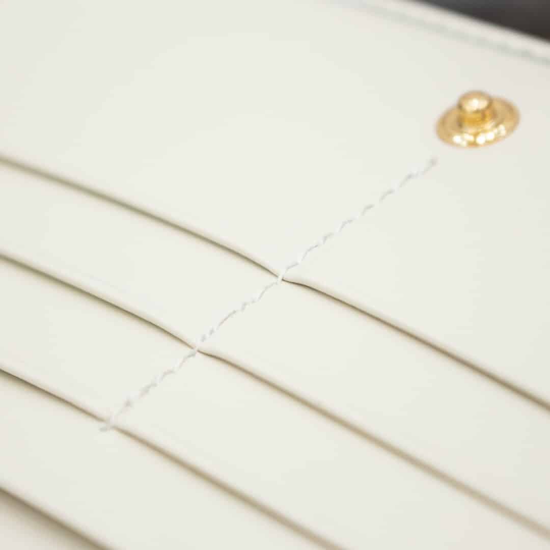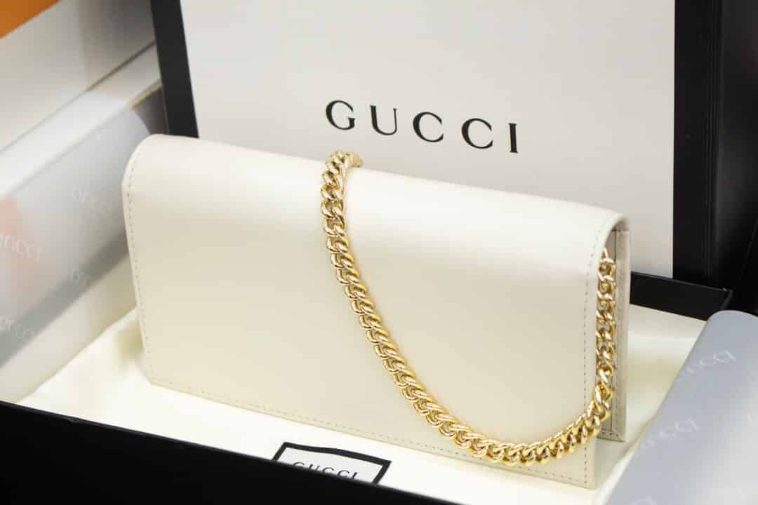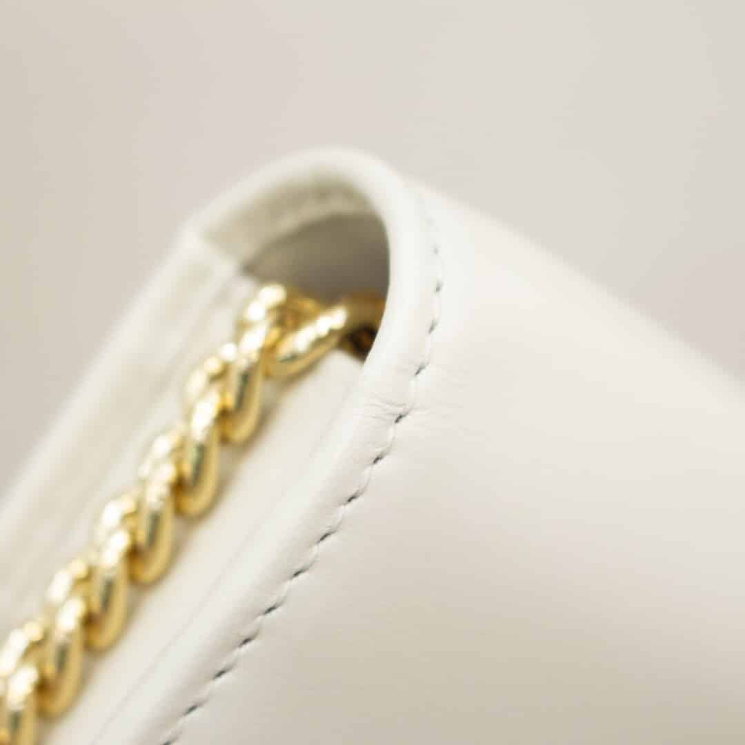 Gucci 1955马衔扣配饰系列再添力作,这款链带钱包采用白色皮革材质,匠心点缀与该系列手袋一脉相承的双环和长条形设计。经典的翻盖式按扣造型内配数个卡片隔层和口袋,可拆卸链带打造丰富的携带选择。