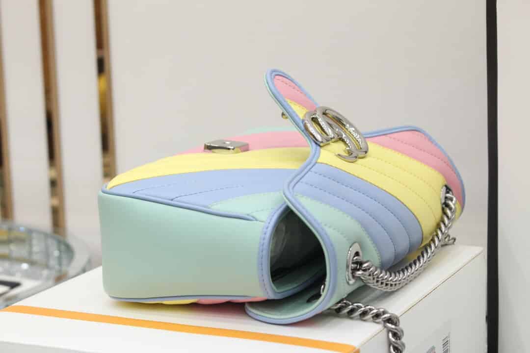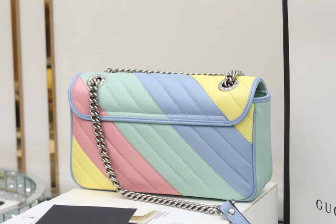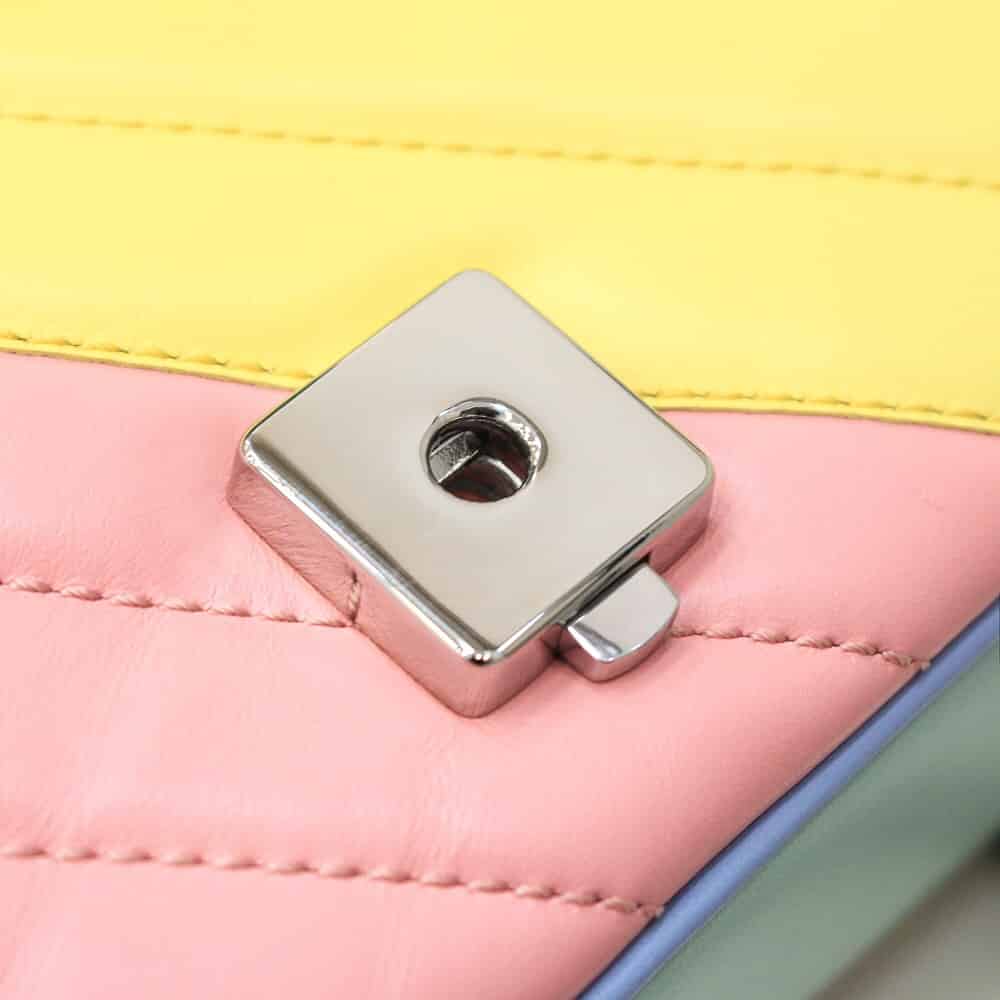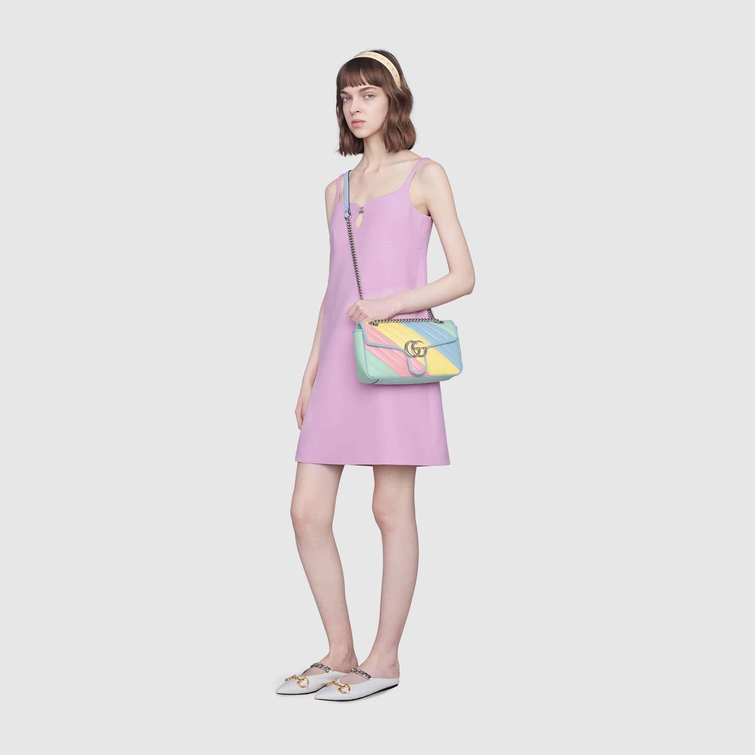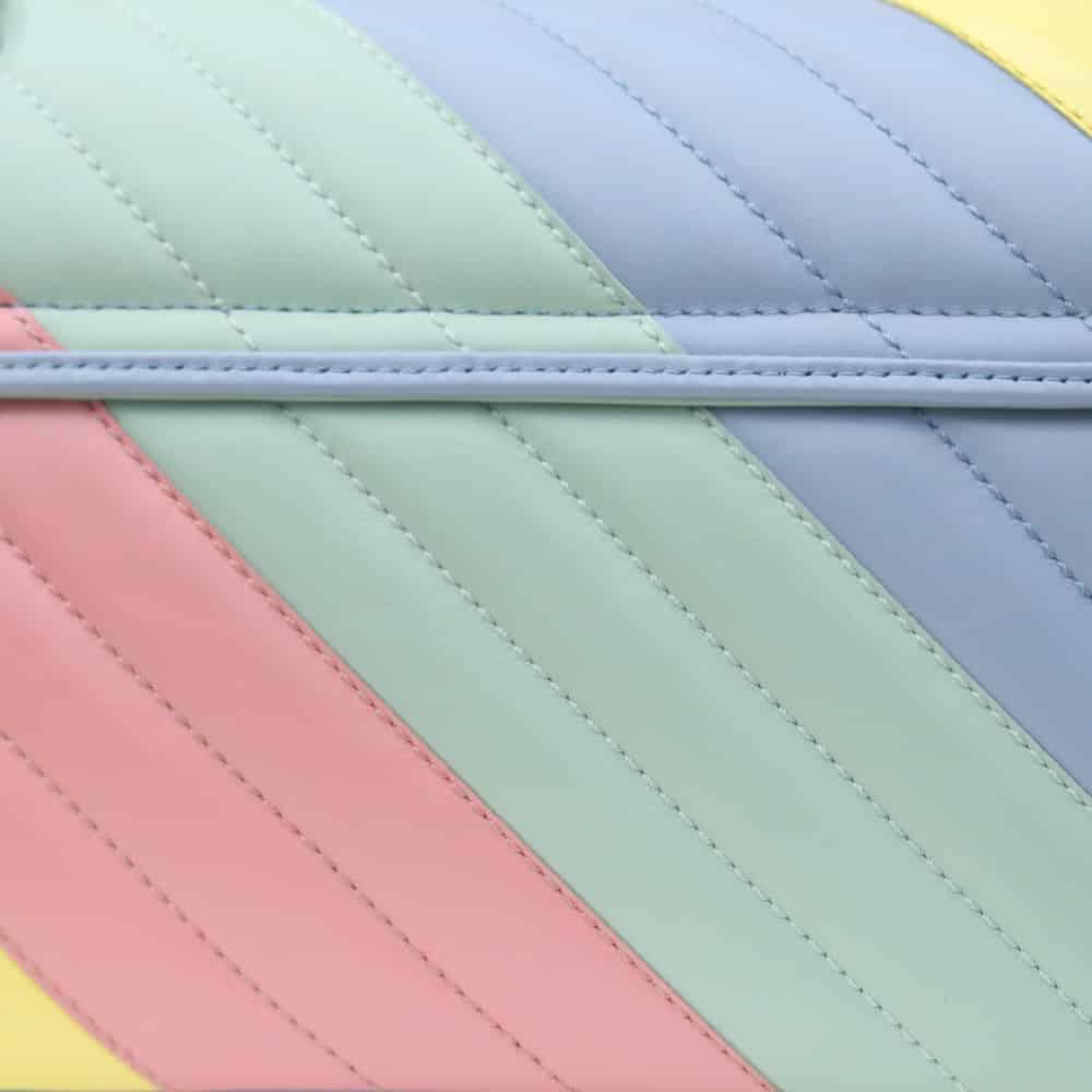 宛如马卡龙般的缤纷色调成为2020早秋系列的配色焦点。这款已成为经典之作的GG Marmont小号链条式肩背包采用浅黄色、浅绿色、浅蓝色和浅粉色条纹绗缝案皮革制作而成,整体造型显得柔和而不失挺括,并设计有超大翻盖配以双G配件。链条式设计旨在实现多样化穿戴效果,可在单肩包和手提包之间自由转换。