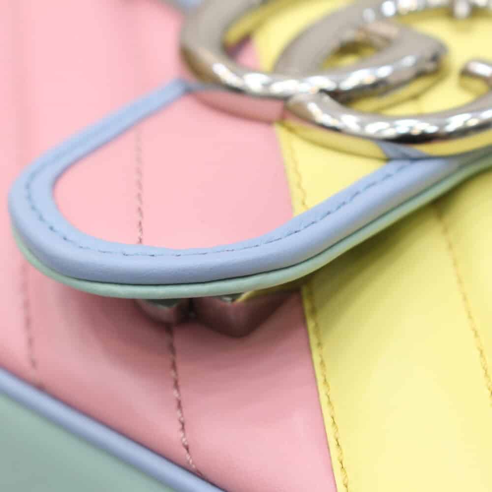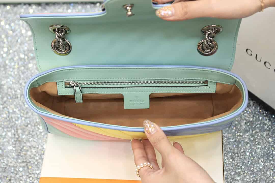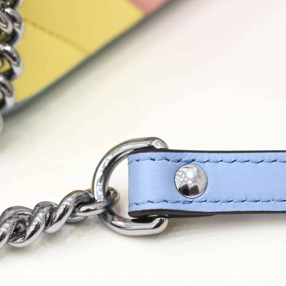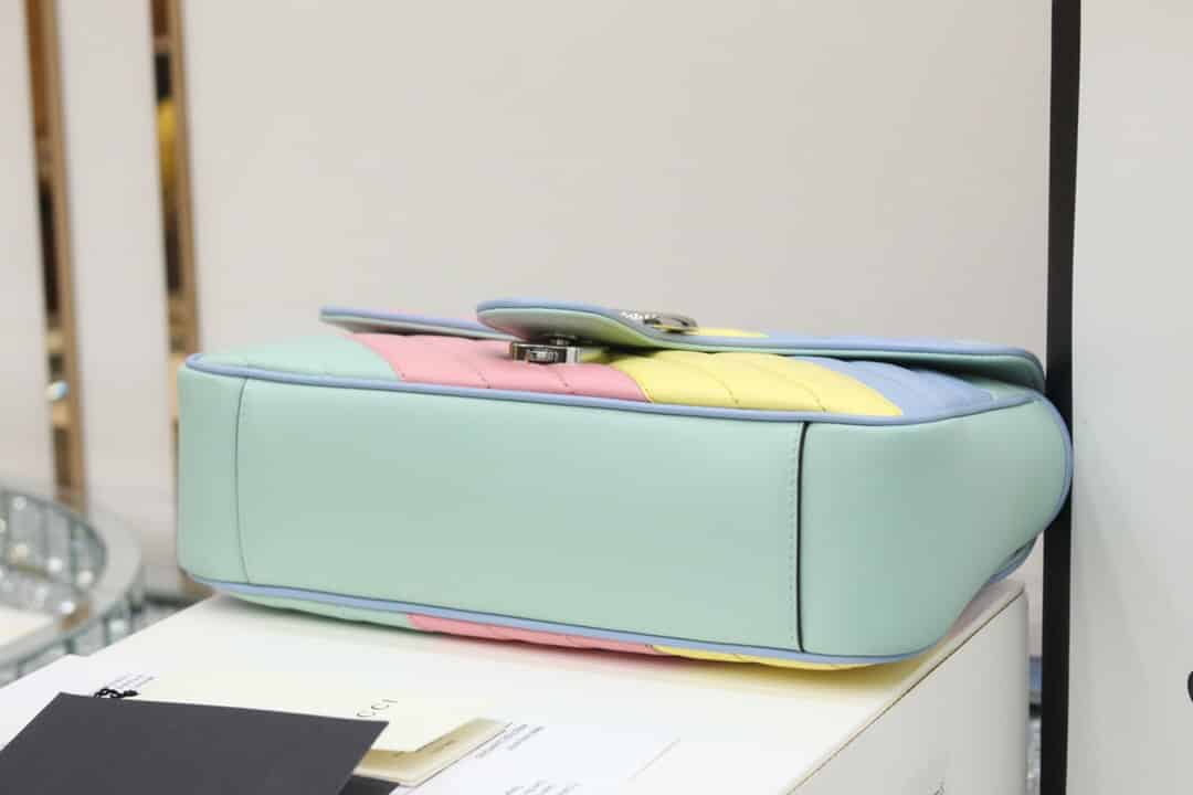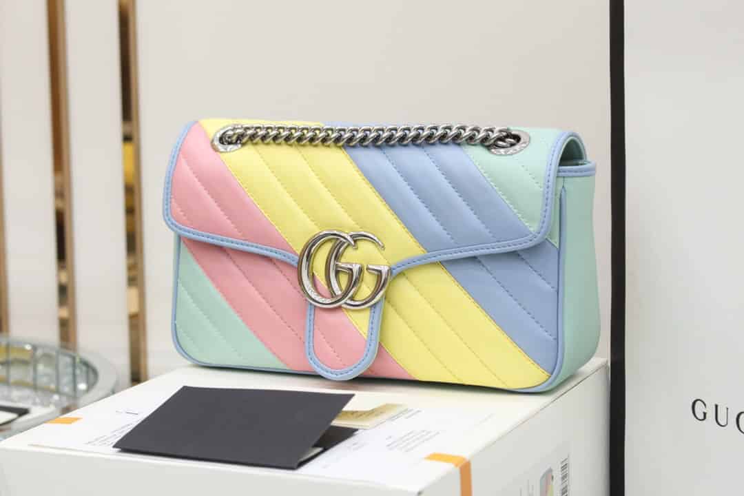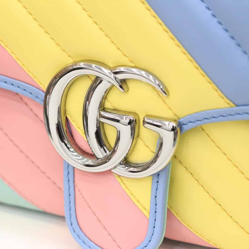 宛如马卡龙般的缤纷色调成为2020早秋系列的配色焦点。这款已成为经典之作的GG Marmont小号链条式肩背包采用浅黄色、浅绿色、浅蓝色和浅粉色条纹绗缝案皮革制作而成,整体造型显得柔和而不失挺括,并设计有超大翻盖配以双G配件。链条式设计旨在实现多样化穿戴效果,可在单肩包和手提包之间自由转换。
