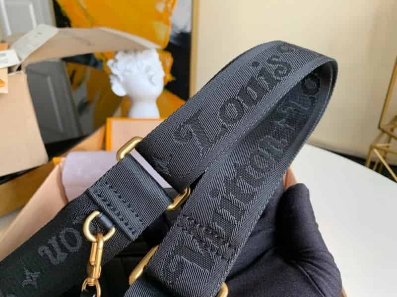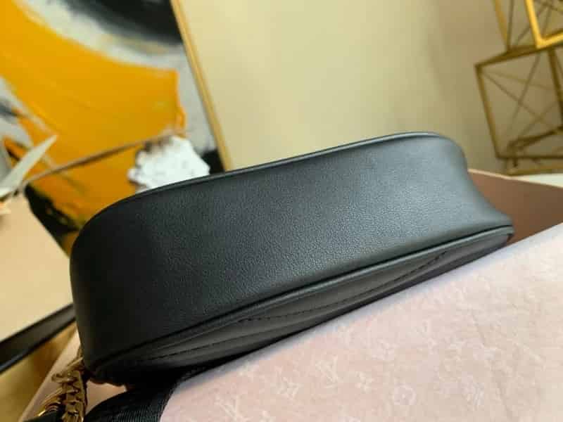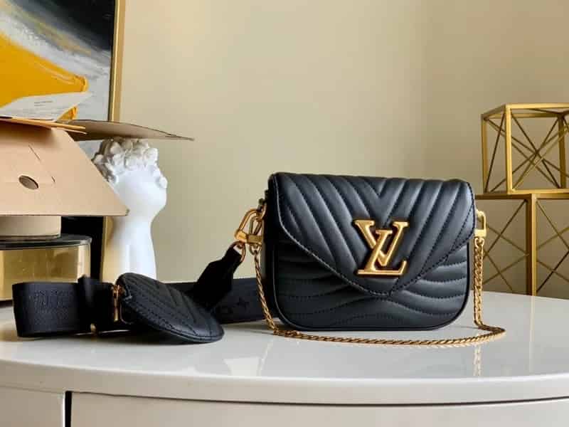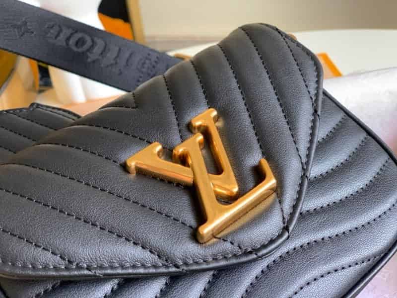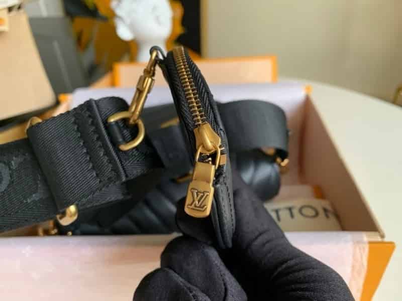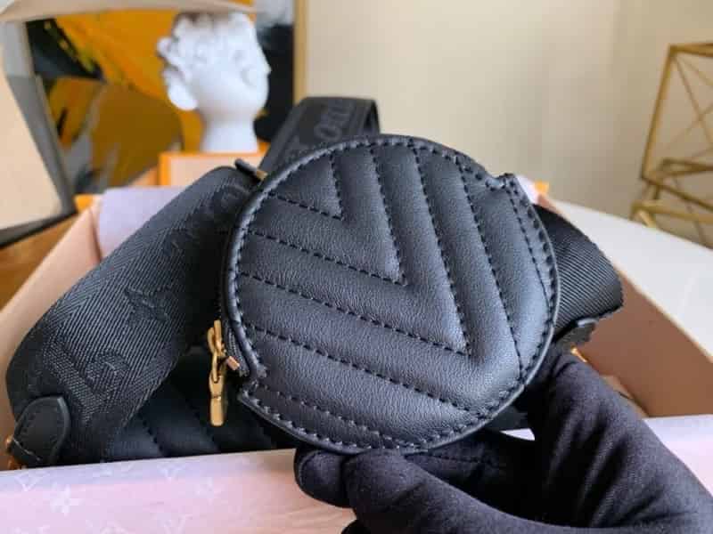 路易威登以绗缝小牛皮打造此款多功能 New Wave Multi-Pochette 斜挎包。其宽幅包带饰有刺绣路易威登英文字样,搭配的金色链带使手袋可手持或肩背。圆形零钱包可夹在包带的弹簧扣上。这些饰件皆可脱卸,令此款时尚配饰成为真正的多功能单品。