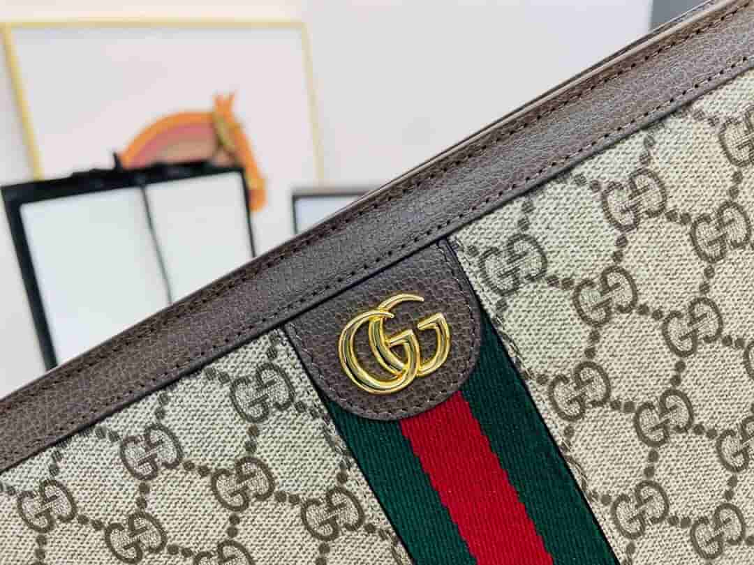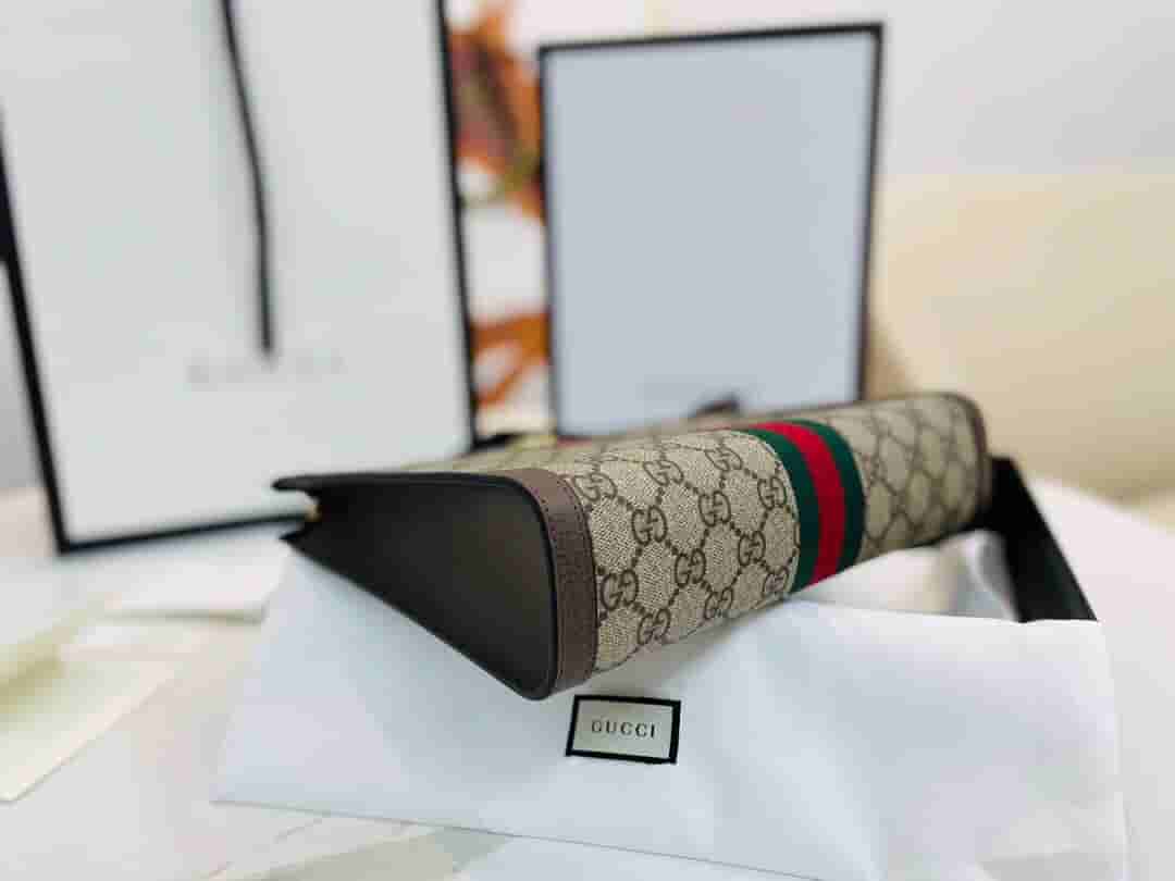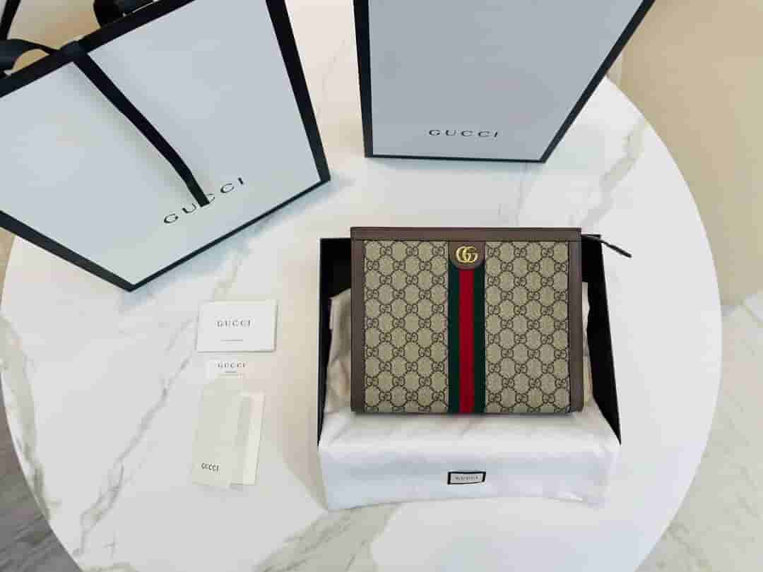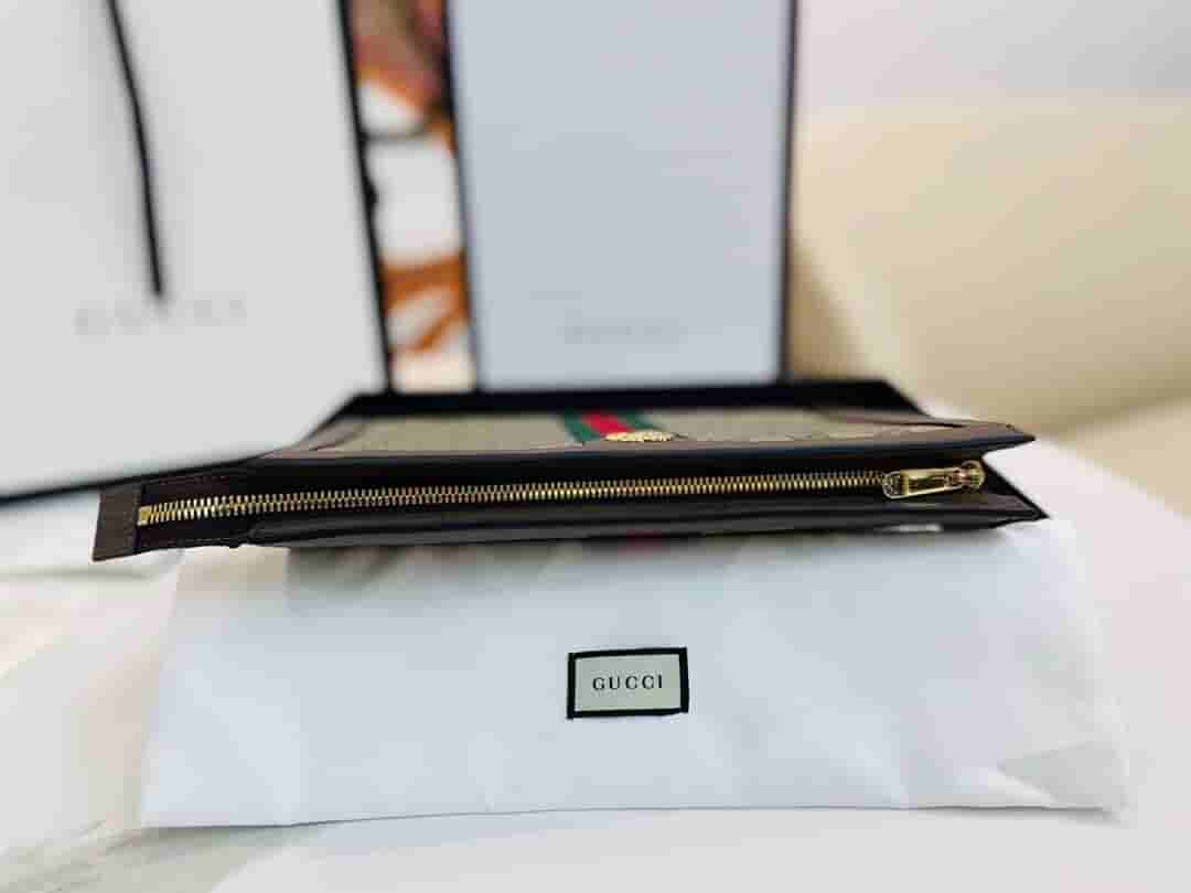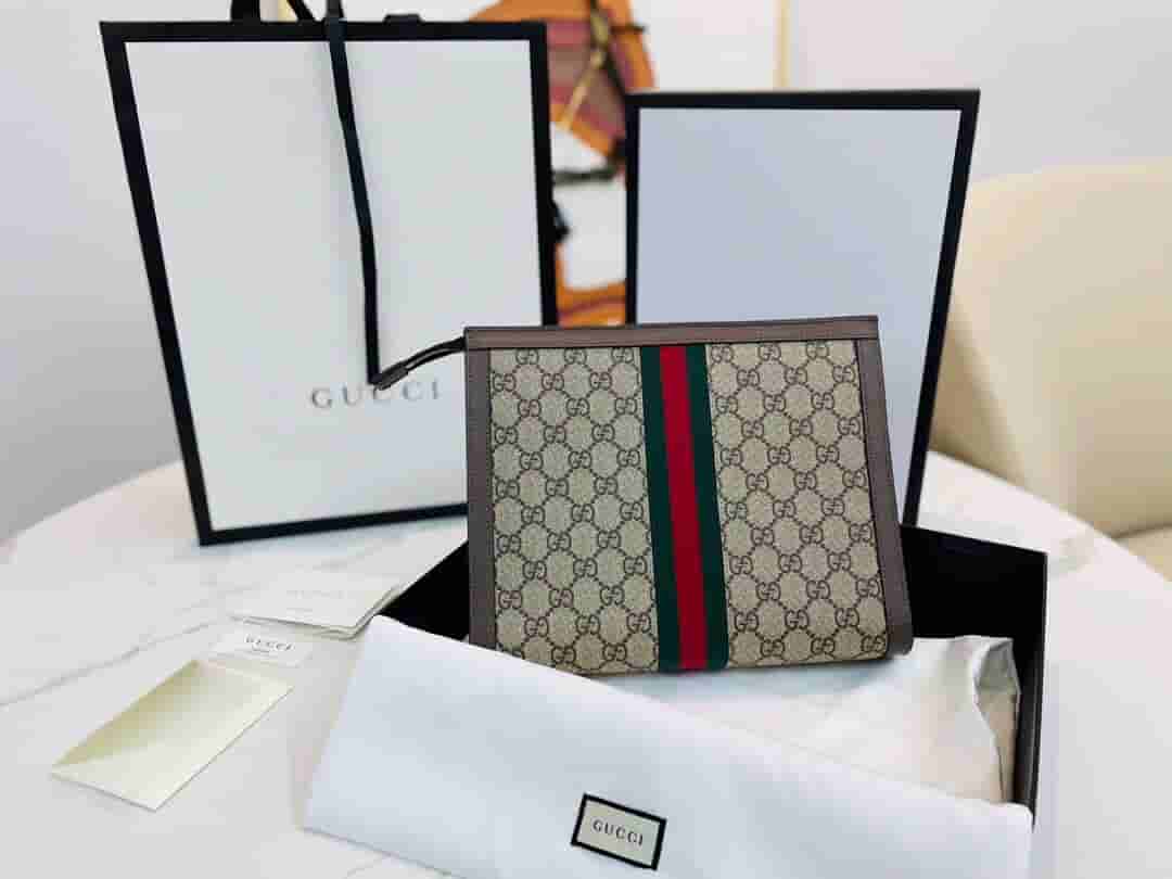 这款拉链式手拿包采用GG Supreme帆布制作,饰以棕色皮革滚边,为Ophidia系列再添力作。GG标识于20世纪70年代开始使用,由起源于20世纪30年代的Gucci钻石菱格纹设计演化而来,是传承品牌精髓的标志性图案之一。这款手袋融合了经典图案和条纹织带两大品牌标志性元素,以此向Gucci悠久的历史传承致敬。